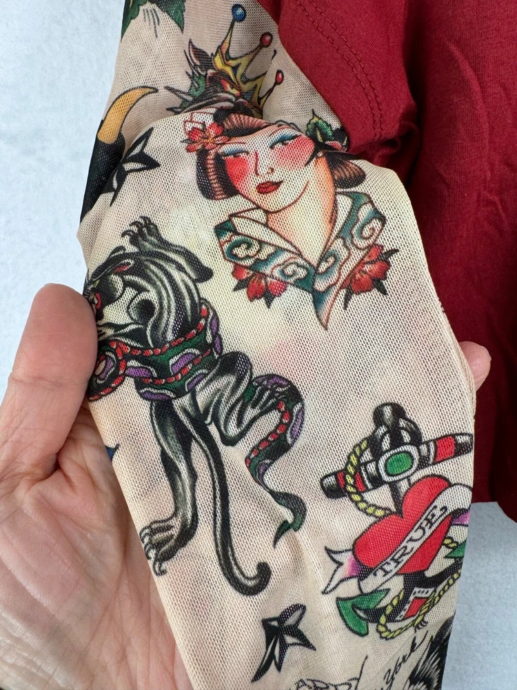 New with Tag "Turn heads with this Ed Hardy Sheer Sleeve Graphic Cropped Shirt in bold red! 🔥 Featuring retro-inspired graphics and sheer sleeves, this statement top brings an edgy, Y2K vibe to any look. The cropped fit is perfect for pairing with high-waisted jeans or skirts, adding a touch of daring style to your wardrobe. Flat lay: pit to pit 17.5" Length 16" Material: 65% Poly 35% Cotton Y2K, 90s, colorful, sheer, graphic, festival, moto, cropped, tiger, steampunk, moto, goth, biker, vampy, rocker, rebellious, metal, alternative, vintage inspired PLEASE check all flat lay measurements and listings carefully BEFORE PURCHASE!I put in a lot of work into hand measuring and researching each items as best as I can! Thank you so much for your consideration! Please note that: RETURN SHIP FEE IS PAID BY THE BUYER! If you are not too familiar with flat lay measurements, I recommend taking a measurement of your own clothes that you feel comfortable and compare with the measurement I provide. For returns: The items MUST BE IN SAME CONDITION AS SOLD for full refund! We all don't like returns and let's work together to minimize! Please note that RETURNS ARE NOT ACCEPTED FOR NEW WITH TAG OR NEW WITHOUT TAG ITEMS!