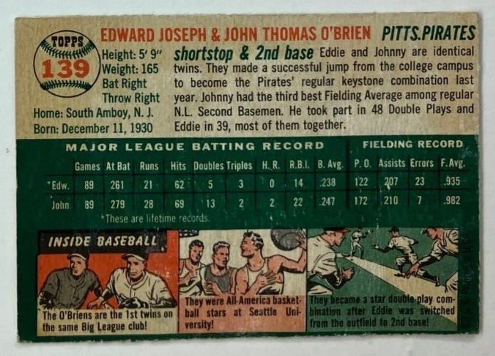 This is a rare and valuable 1954 Topps baseball trading card featuring the Pittsburgh Pirates' Ed & John O'Brien. The card is in excellent shape. It is an original, ungraded single card from the 1954 Topps set, and has not been autographed or modified in any way. The card measures the standard size and is in English language. It is a great addition to any baseball card collection, especially for fans of the Major Leagues and vintage sports memorabilia. Don't miss your chance to own this piece of history!