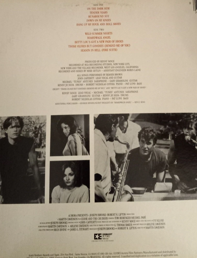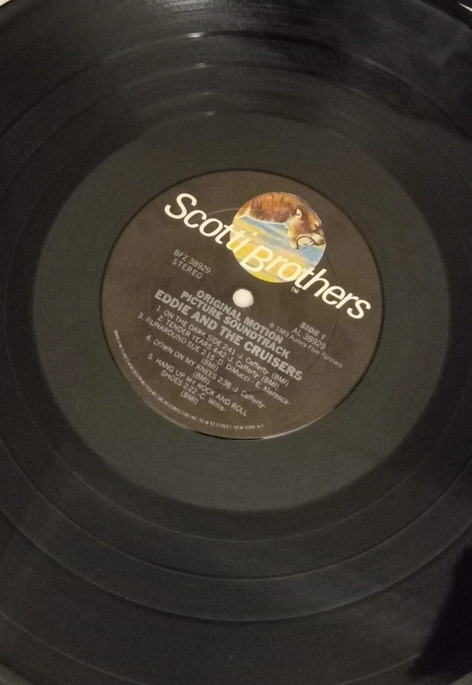 UPC:Does not applyCase Type:Cardboard SleeveRecord Size:12"Country/Region of Manufacture:United StatesLanguage:EnglishSpeed:33 RPMEra:1980sRelease Year:1983Sleeve Grading:Near Mint (NM or M-)Material:VinylFeatures:Original CoverType:LPArtist:VariousGenre:Rock 'n' Roll, Soundtracks & MusicalsRecord Grading:Near Mint (NM or M-)Color:BlackStyle:1980sFormat:Albumgtin13:Does not applyInlay Condition:Near Mint (NM or M-)Release Title:Eddie And The Cruisers : Original Motion Picture SoundtrackRecord Label:Scotti Brothers Records