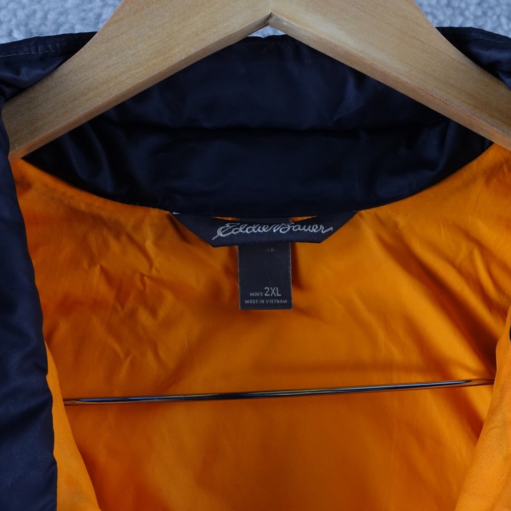 Conquer the chill with this versatile Eddie Bauer puffer vest. The quilted design traps warmth, keeping you comfortable during transitional weather or as an extra layer. Vibrant orange lining adds a pop of color and visual interest. Functional zip pockets keep your essentials secure, while the full-zip front allows for easy temperature regulation. Perfect for outdoor adventures, casual outings, or layering up for a chilly evening. Type: Vest Style: Quilted Outer Shell Material: Nylon Department: Men Closure: Zip Fabric Type: Microfiber Insulation Material: Down Occasion: Casual Performance/Activity: Hiking, Walking Accents: Zipper, Logo, Quilted Chest Size: 44 in Collar Style: Stand-Up Country of Origin: Vietnam Keywords: Eddie Bauer vest, mens puffer vest, quilted vest, down vest, lightweight outerwear, athletic vest, outdoor gear, travel vest, casual layering, fall fashion, winter layering, activewear vest