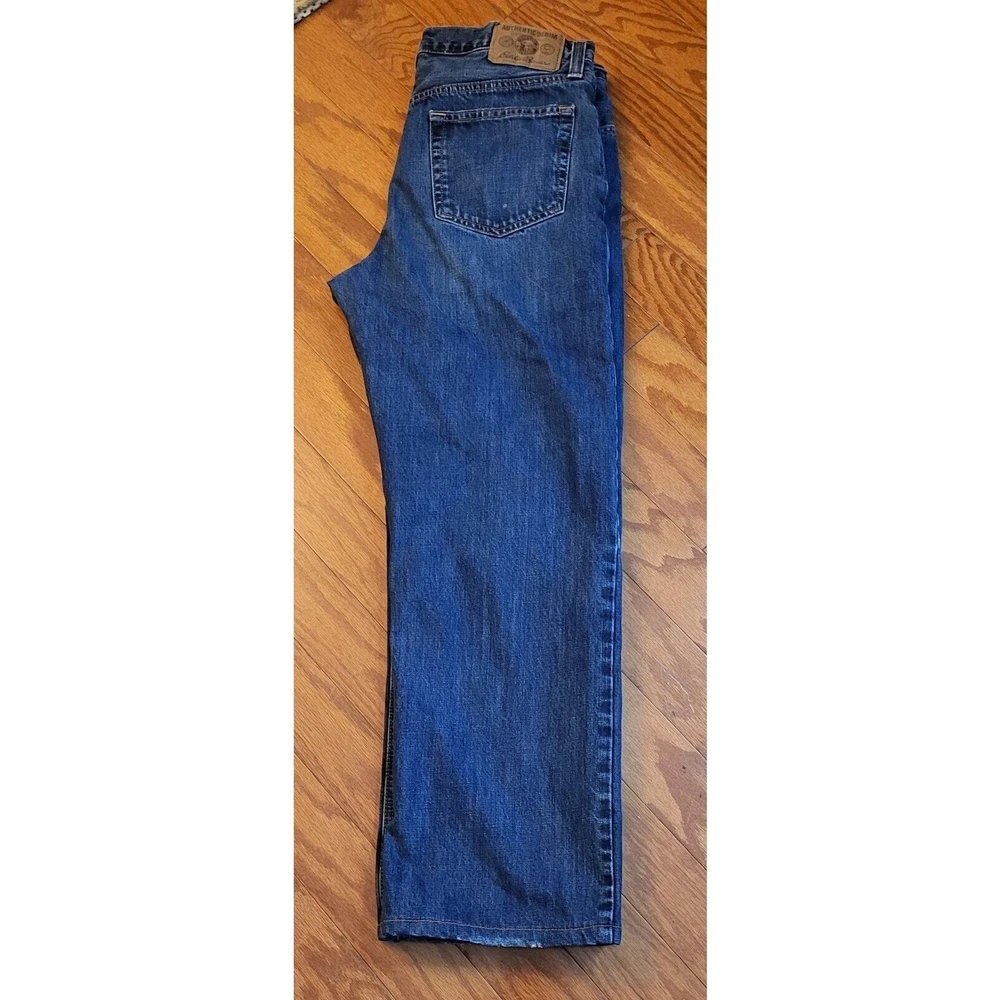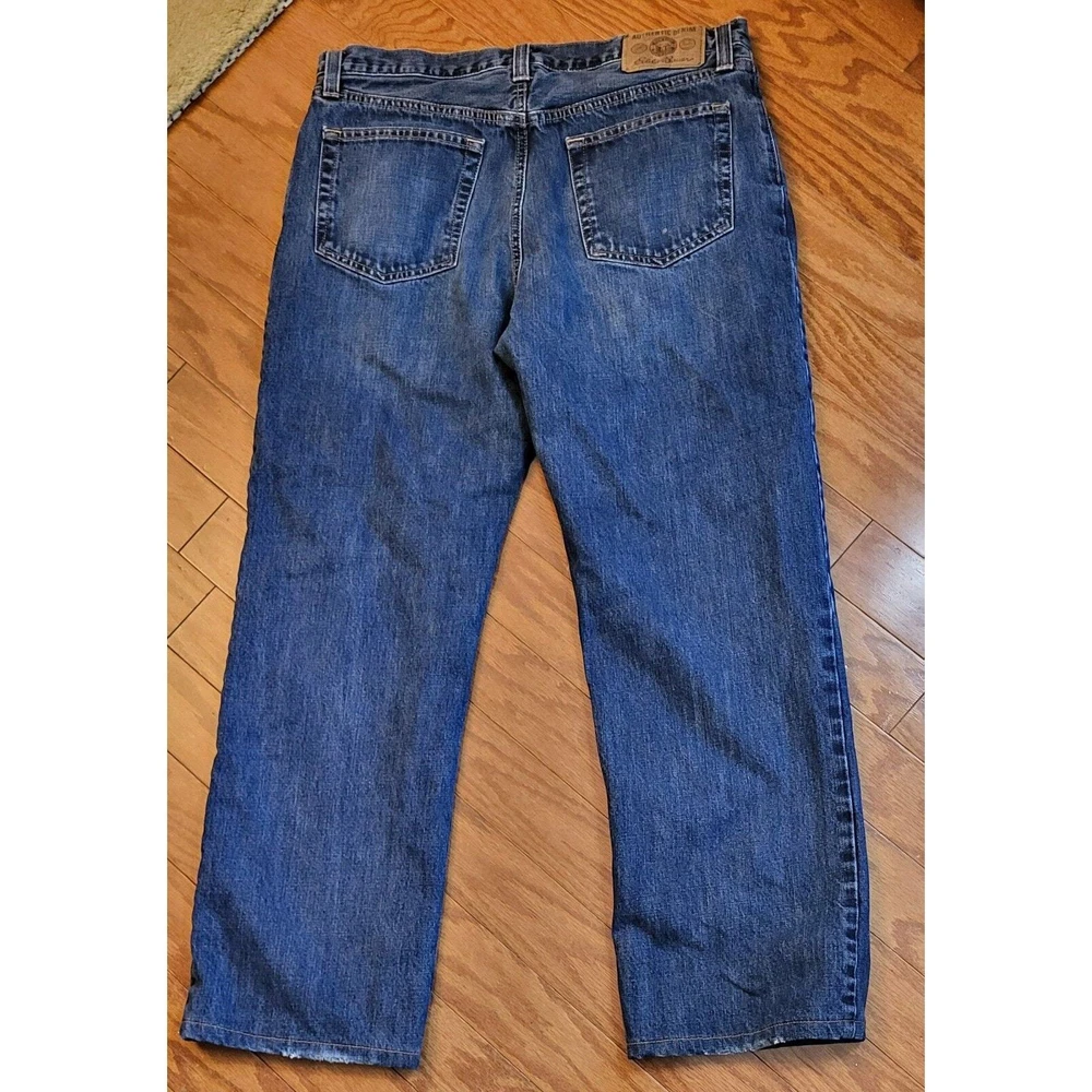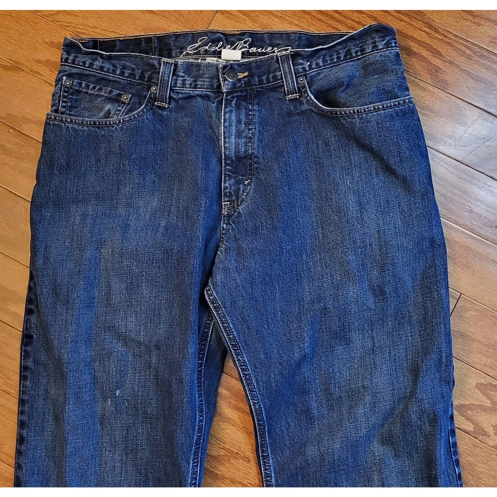 Upgrade your winter wardrobe with these Men's Eddie Bauer Travex flannel-lined denim jeans. The blue solid pattern and 5-pocket design give a classic look, while the high-rise waist and relaxed fit provide ample comfort. The 100% cotton material ensures durability, and the medium fabric wash adds to the vintage aesthetic. Featuring zip closure and belt loops, these jeans also have button, zipper, and logo accents. Suitable for outdoor activities in winter, fall, and spring, these jeans are a must-have for men who appreciate style and warmth. Get your hands on these quality jeans, perfect for everyday wear. Waist: 35 Inseam: 29 Excellent preowned condition. Zipper and button function properly. The hem is slightly frayed as shown in the pictures. Grab them today for your wardrobe!