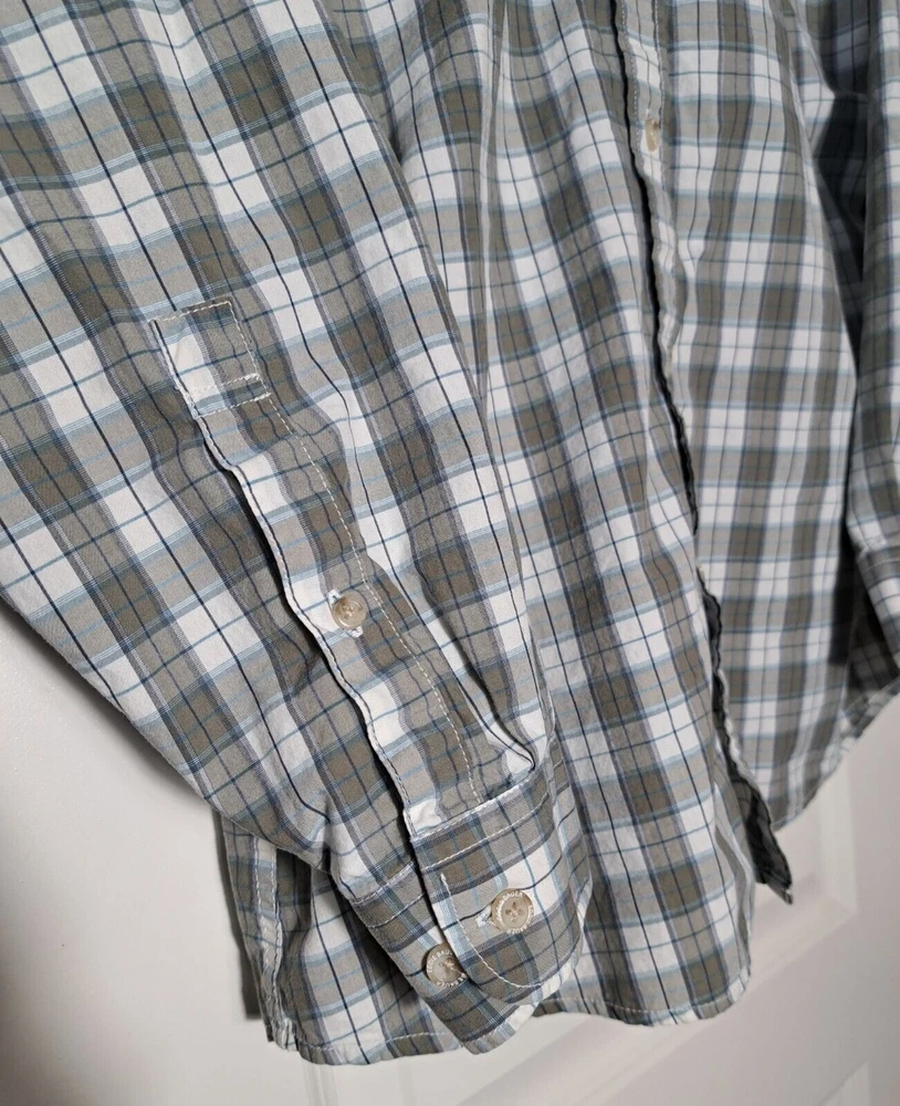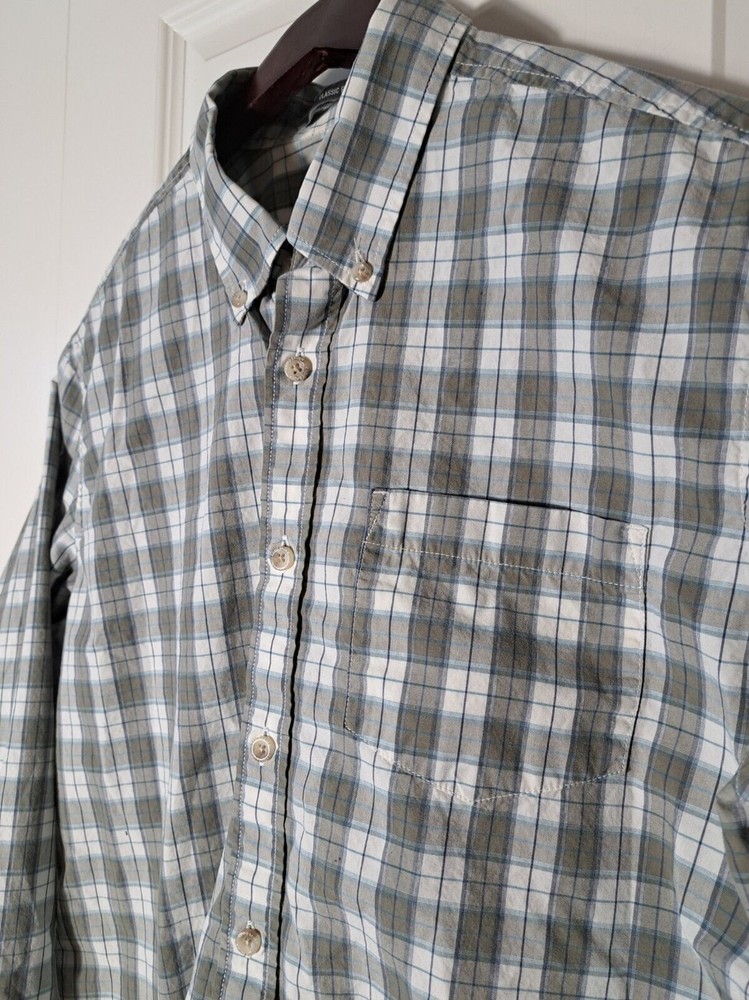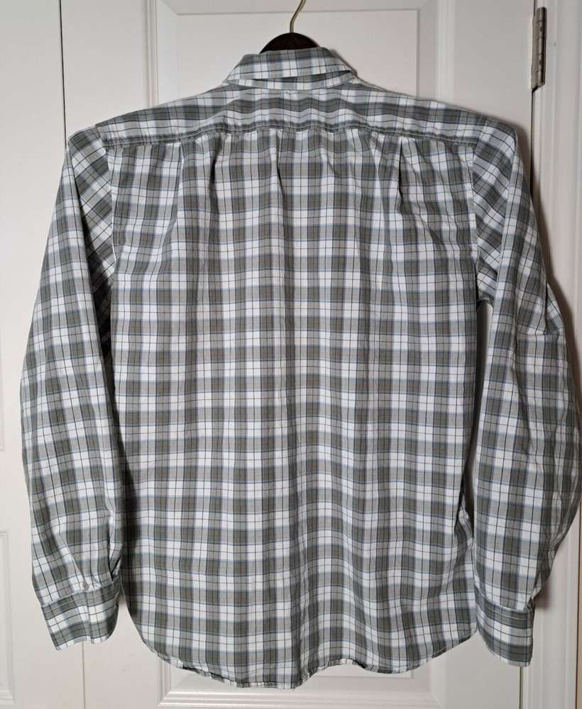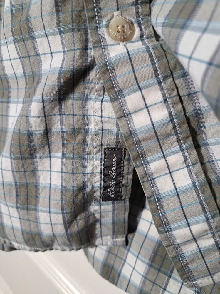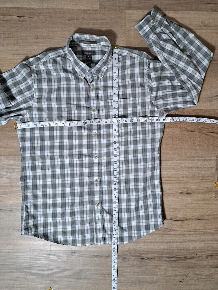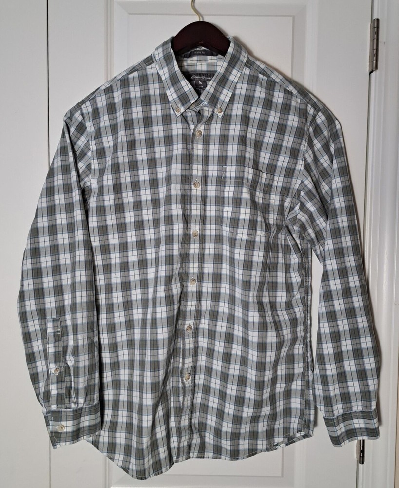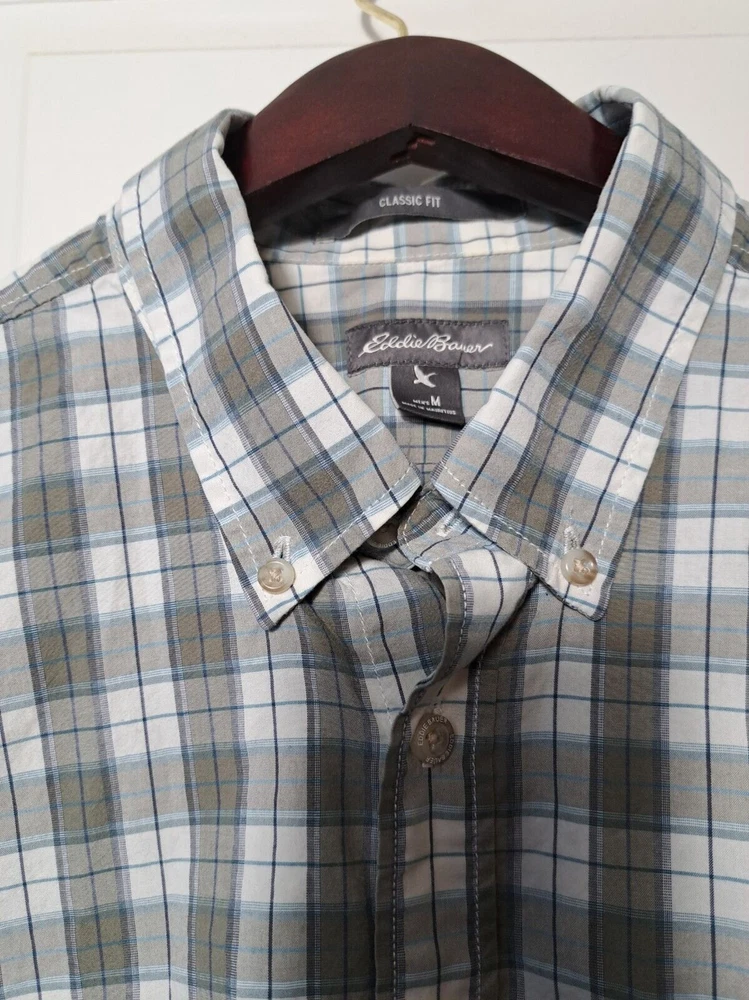 Used in great condition, please see pictures for details and measurements laying flat. Step out in style with this classic fit long sleeve button down shirt from Eddie Bauer. Made from 100% cotton, this shirt features a stylish plaid pattern and a collared neckline with button-down closure. It's great for any occasion, whether you're going to work, attending a party, or traveling.The shirt is easy to care for, lightweight, and breathable, making it perfect for any season. With its classic fit and button-down collar, it exudes a timeless and classic look that can be styled up or down. The shirt is machine washable and comes in size M. Elevate your wardrobe with this quality piece from Eddie Bauer.