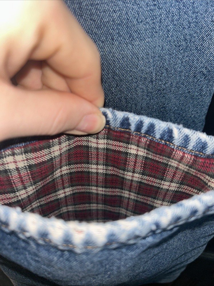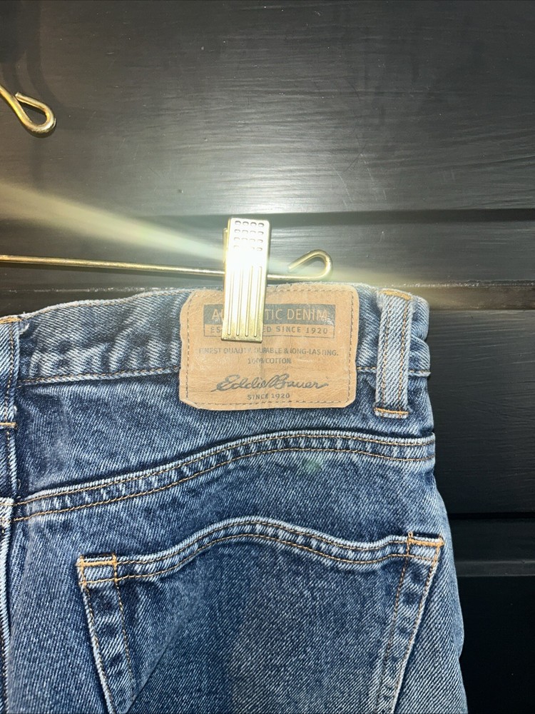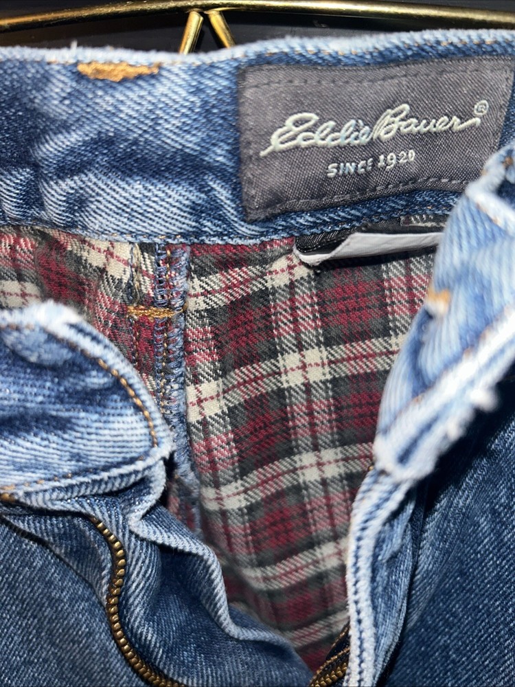 The Eddie Bauer Flannel Lined Jeans feature a relaxed fit design, making them comfortable for everyday wear. They are made of solid blue cotton flannel fabric with a 5-pocket design, accented with buttons, zippers, and the brand's logo. The jeans have a medium fabric wash and come in a size of 29x34, suitable for waist size 34. This unisex garment is machine washable, perfect for the winter, summer, fall, and spring seasons.