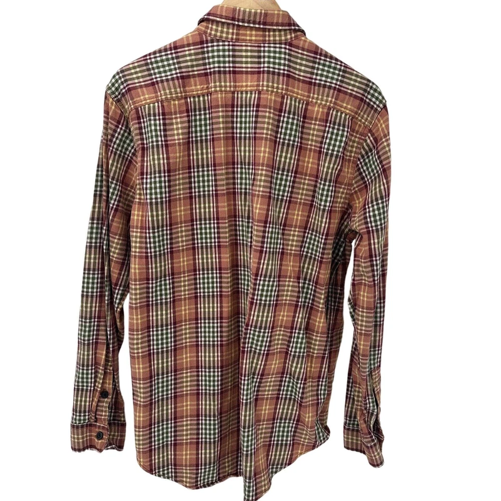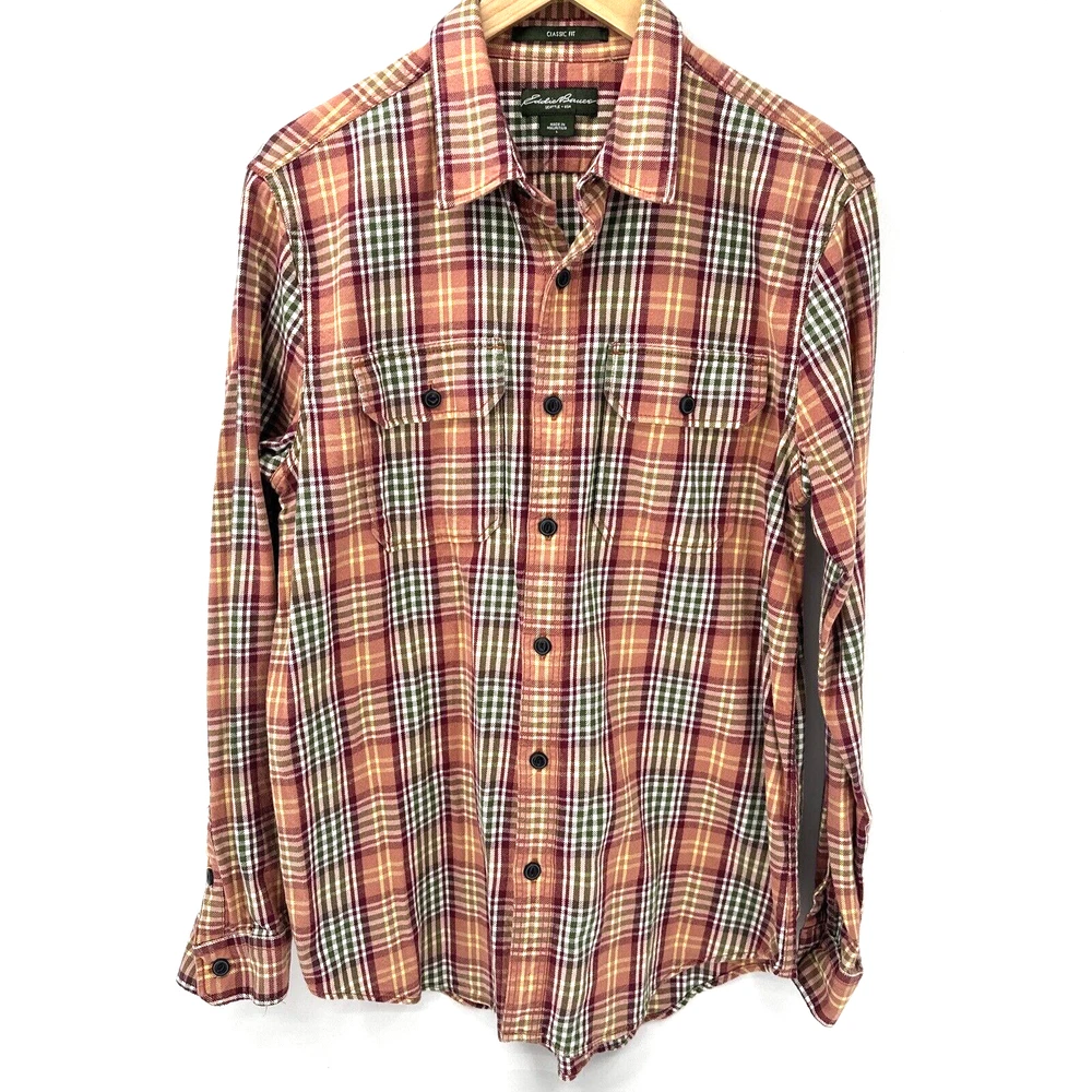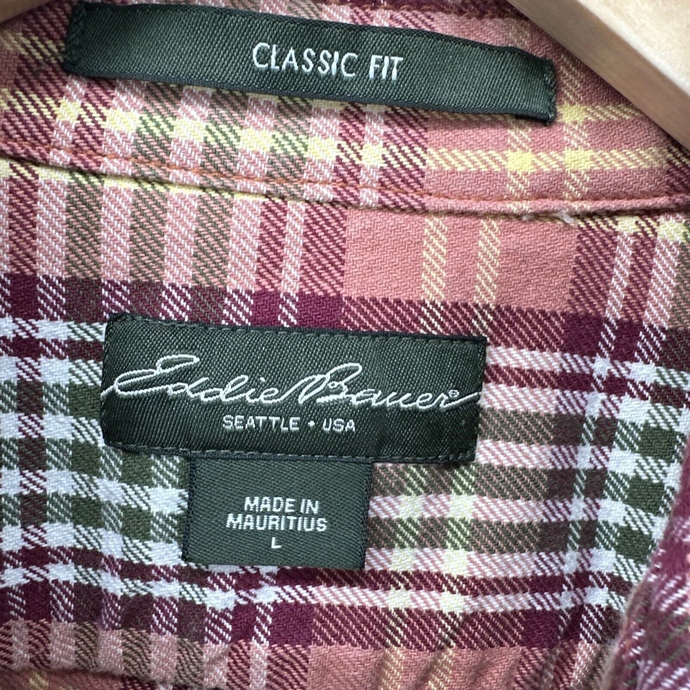 Eddie Bauer Men's Flannel Shirt Size Large Plaid Classic Fit 100% Cotton with Pockets Long Sleeves Red Green White Yellow Orange Very good condition, see all pictures for views. * Pit to pit: 21" * Shoulder to hem: 30" Ships out same day or next open postal day. Thank you for your purchase, we appreciate you!