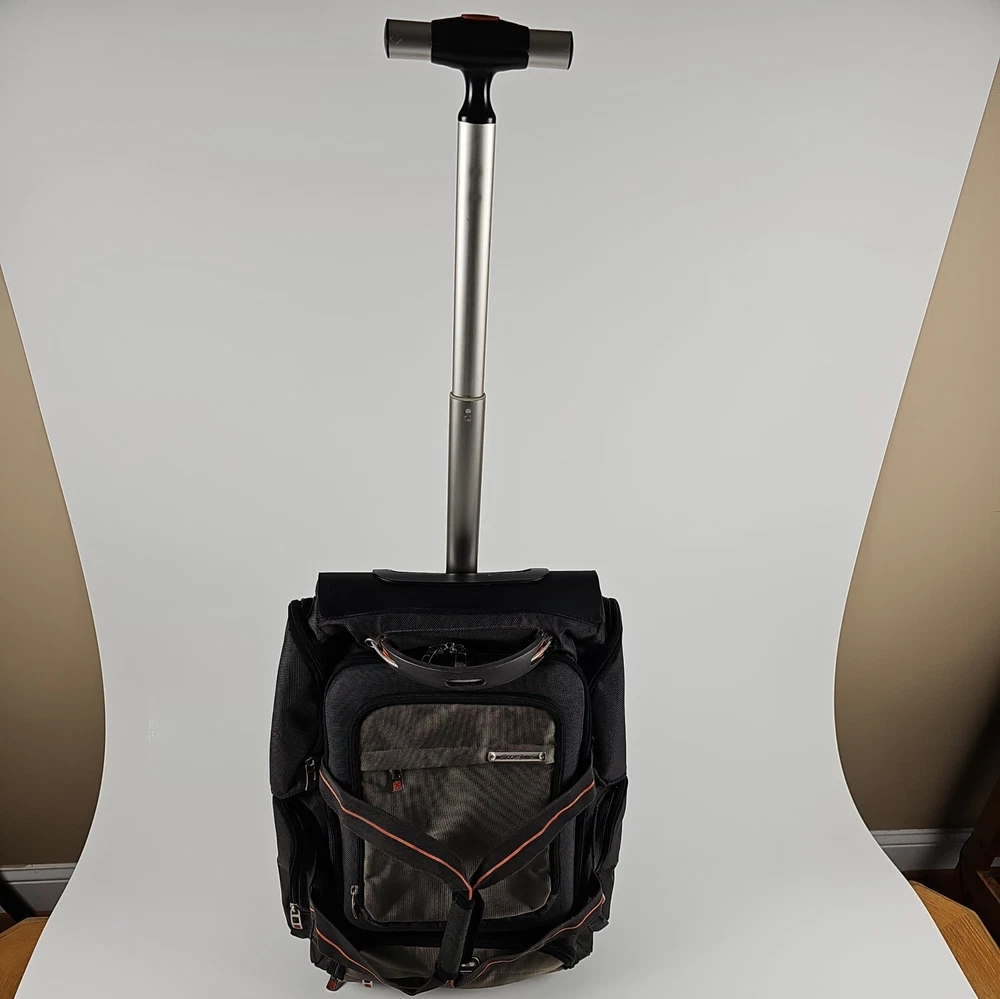The Eddie Bauer "Silverton" Convertible Rolling Carry On is a versatile luggage piece that functions as both a rolling carry-on duffel bag and a backpack, featuring hideaway straps and a retractable handle. This specific model is no longer sold new by Eddie Bauer and is typically only available as a pre-owned item through online marketplaces.Key Features and DesignConvertible Design: The bag can be used as traditional rolling luggage with a retractable handle, or the backpack straps can be taken out for hands-free carrying.Storage: It includes a dedicated shoe compartment and plenty of additional storage pockets on the exterior, all secured with heavy-duty zippers.Durability: The bag is described in pre-owned listings as being very heavy-duty.Additional Accessories: Some versions include a rain cover that stores away in one of the pockets.Aesthetics: The bag typically features a two-tone grey color scheme with subtle orange accents.