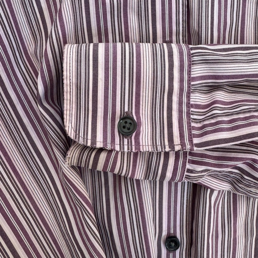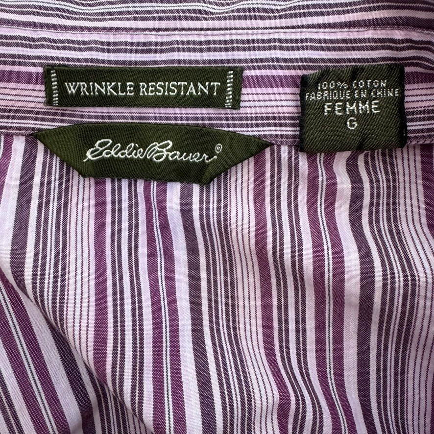Pre-owned Eddie Bauer women’s wrinkle-resistant button-up shirt in purple and white stripe. Made from 100% cotton for breathable comfort. Classic collared style with full button front and long sleeves. Good pre-owned condition. Please see photos for details and overall condition. 📏 Measurements (Laid Flat) Chest (Pit to Pit): 22 inches Length: 26.5 inches Sleeve Length: 24.25 inches (Please compare measurements to a favorite shirt for best fit.)