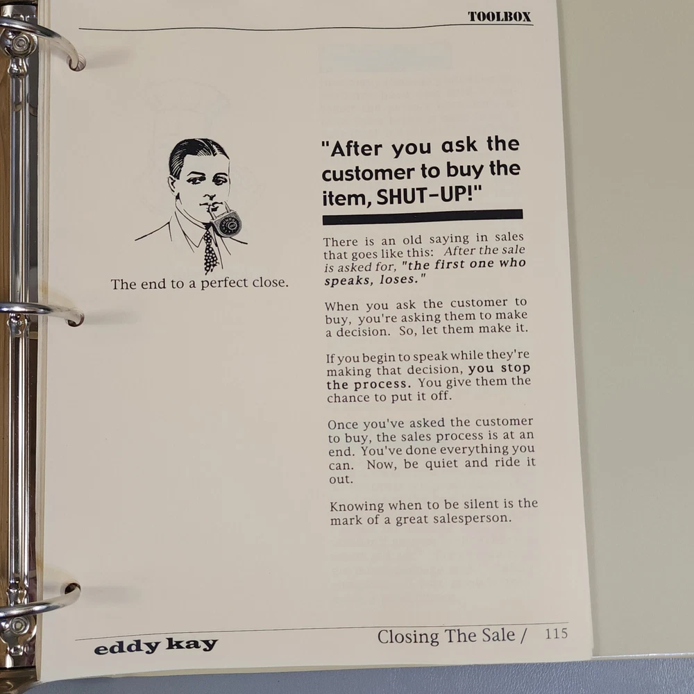 Eddy Kay Toolbox Car Audio Sales Training Course 4 Audio CD Disc Set Study Guide When it comes to sales training in the car audio world there is one name that rises above the rest.. winner of the Mobile Electronics lifetime achievement award Eddy Kay. There is something about the way he teaches that makes it so easy and fun to learn. Maybe its his energy (its infectious), maybe its the corniness that makes you laugh and have fun while your learning, no matter what it is this course is a blast. The best part is, it works! Listen, learn, put it in to action, and there is no doubt this course can change your career and life. Its bee several years since I went through any of the material in the toolbox but I found myself reading page after page while doing this listing. The one thing that stood out to me was how relevant the material is today. I thought it was as relevant as it could be almost 20 years the first time I went through it but it actually seems more relevant today with the lack of customer service in the retail world. Eddy Kay Toolbox Selling On Purpose Sales training course Written and developed by Eddy Kay Includes: 3- Audio CDs sales training 1- Audio CD management training/leadership 176 page workbook 1- Binder Made in the USA Packed well and shipped out quickly Thank you!!