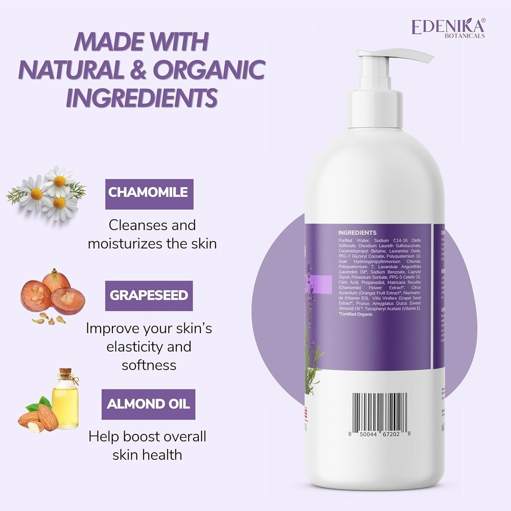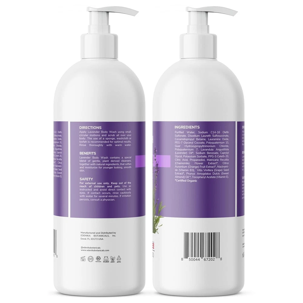 Relaxing Lavender Formula – Infused with calming Lavender, this body wash transforms your shower into a spa-like experience, helping to relax your mind and body. Nourishing Blend of Natural Oils – Enriched with Chamomile, Grapeseed, and Almond Oil, it helps hydrate, smooth, and improve skin texture for a radiant, healthy glow. Vegan & Free from Harsh Chemicals – This sulfate-free, paraben-free, and cruelty-free formula is made with certified organic ingredients, ensuring a clean and gentle cleanse for your skin. Safe for All Skin Types – Ideal for sensitive and delicate skin, this body wash works as a natural hydrator to nourish and moisturize without irritation, suitable for both men and women. Eco-Friendly & Made in the USA – Crafted with sustainable packaging and certified organic ingredients, this body wash is made in the USA and encourages environmentally friendly practices.