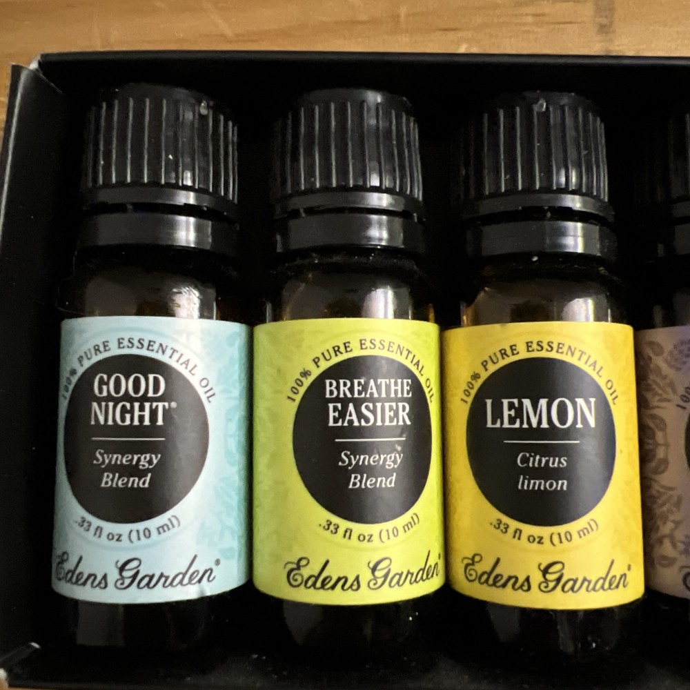 NEW Eden’s Garden Essential Oils Set Of 6, Goodnight, Lemon, Lavender, See Pic. Each bottle is .33 fl oz 10ML