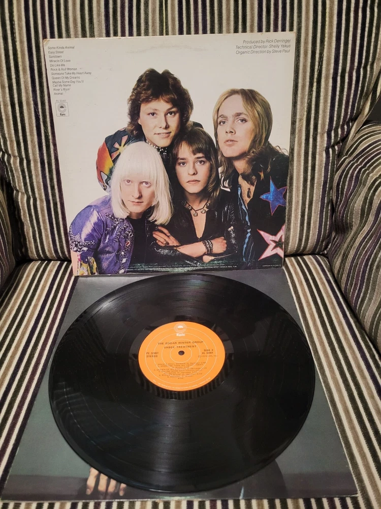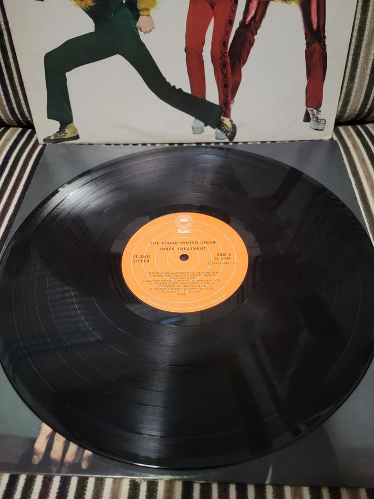 This Edgar Winter Group album, titled "Shock Treatment," is a first edition, first pressing LP vinyl record released in 1974 by Epic. The record features 33 RPM speed and is in near mint (NM or M-) grading. The excellent (EX) inlay and sleeve grading adds to the overall high-fidelity listening experience. The album is a great addition to any collection and features original inner sleeve and cover. The folk rock, country rock, and 1970s style makes it a must-have for fans of pop, rock, and country genres. This Canadian-made record is a gem for any vinyl record collector. The crazy thing about this album is the cover jacket and the cardboard record sleeve. They look female but sound like country folk....