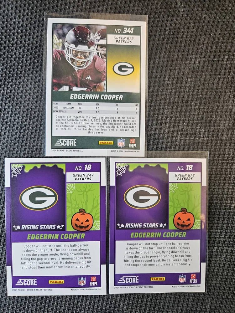 This is a lot of 3 rookie trading cards featuring Edgerrin Cooper, a player for the Green Bay Packers in the 2024 NFL season. The cards are part of the 2024 Score set manufactured by Panini. They are sports trading cards focused on football, specifically from the National Football League (NFL).