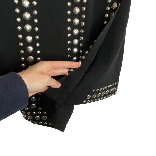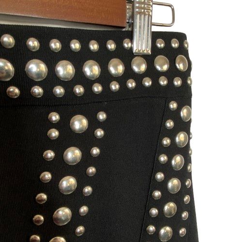 Very Good Pre-Owned Condition (see pics for details). No holes, rips or stains. Pull on style Wide elastic waist band Asymmetrical hem Silver stud details on front Stretchy Above knee length 65% viscose, 35% nylon Hand wash Style profile - casual, party, cocktail, date night, southwestern, rodeo, biker core, goth Approximate flat lay measurements: Length - 20.5" (shortest point), 22" (longest point) Waist - 14.5" (unstretched) Please compare measurements to something you already own to verify size and fit We are happy to answer any questions! We ship the next business day!