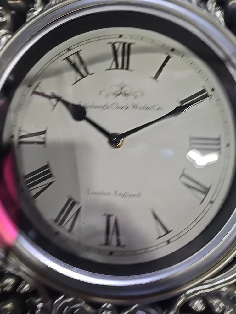 The Edinburgh Clock Works Co desk clock is a vintage piece from the 1970s with a quartz movement, making it battery-powered for convenient use. This analog clock features a classic design and is an original piece that adds a touch of charm to any room. While it is not signed or engraved, it boasts a timeless appeal and would make a lovely addition to a collector's decorative display.