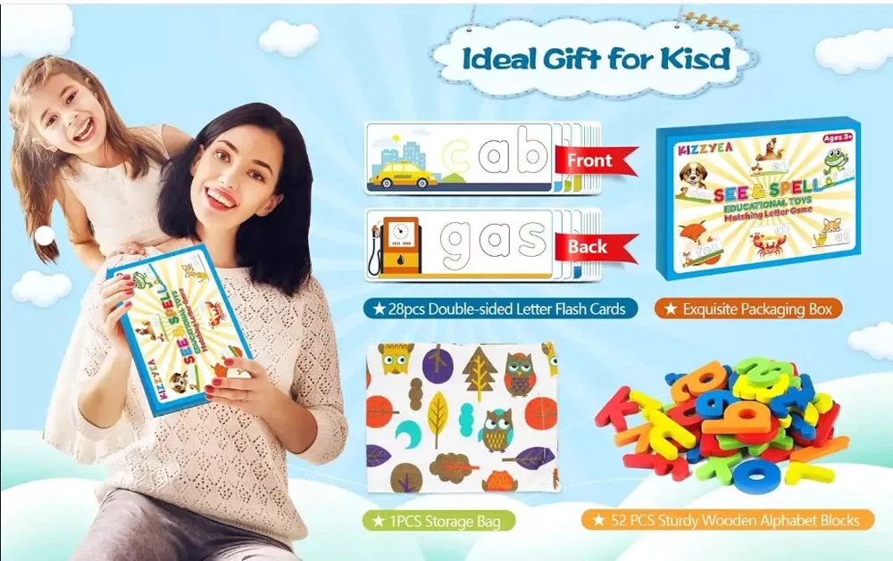 Educational Learning Toys for Girls Kids Toddlers Age 3 4 5 6 7 8 Years Old New US Warehouse - FREE & FAST Shipping in USA Product Description: Great STEM Educational Toy for Early Childhood Development: Sight Words are the first steps to reading. The set flash cards can not only help kids learn alphabet and numbers easily through playing this flash cards set, can develop hand-eye coordination, colors & shapes recognition and fine motor skills, which are great preschool activities and Montessori toys for toddlers. Great toddler STEM toys for 3-5 5-7 4-8 year old boys and girls. Fun Learning Resources for Toddler: Contains 28 double sided flash cards and 52 wooden blocks. With 56 rich scenes and 56 most commonly used Cvc sight words, help children develop memory and brain thinking by establishing connections. Build early shape, color, and alphabet recognition skills. As toddlers stack letter bricks onto the card, they improve their fine motor skills, become familiar with the letters of the alphabet, and soon learn to spell basic words like F-U-N! Safety and Environmental Material: early development toys are made to last. Sturdy wooden construction, premium craftsmanship, painted with water based non-toxic paint makes it parent's premium choice for educational toys for ages 3+. Larger-size wooden blocks can prevent the risk of suffocation of children. What's more, the wooden puzzle has smooth edges, fitting nicely into their small hands. Perfect gift for 3 4 5 6 year olds. Easy Store & Carry: The spelling game comes with a cute storage bag. When not playing, put the toy in bag, which will cultivate the children's hands-on ability. The compact packaging structure and light weight make it more convenient to hold. Place them in school bags and suitcases, suitable for many occasions, airplanes, cars, restaurants, etc. Provide a great opportunity to play, interact and communicate with your family. This ever-popular shape and color activity is sure to engage children. Best Choice Gifts for Kids Ages 3 4 5 6 : Whether you’re shopping for holidays, birthdays, or just because, toys from Learning Resources help you discover new learning fun every time you give a gift! This montessori toy makes the perfec Christmas / birthday / back to school / Easter / Halloween / New Year gift for 3-6 year old boys and girls. Customer satisfaction is our greatest motivation, please feel free to contact us if you have any problems about this alphabet flash cards set. Feedback: 1.Any question for your order, please contact us in time, we will reply to you within 24-48 hours and give you a satisfactory answer. 2.If you are satisfied with our products and services, hope to take up a little precious time to leave feedback reviews for our products.Thanks! 3.Your satisfaction is our effort. Welcome to order again! Have a great day! Our Policy: 100% Satisfaction Guarantee 30 Days Return and Refund Guarantee Free and Fast Shipping in USA, US Warehouse 15% of restocking fee will be charged for return it