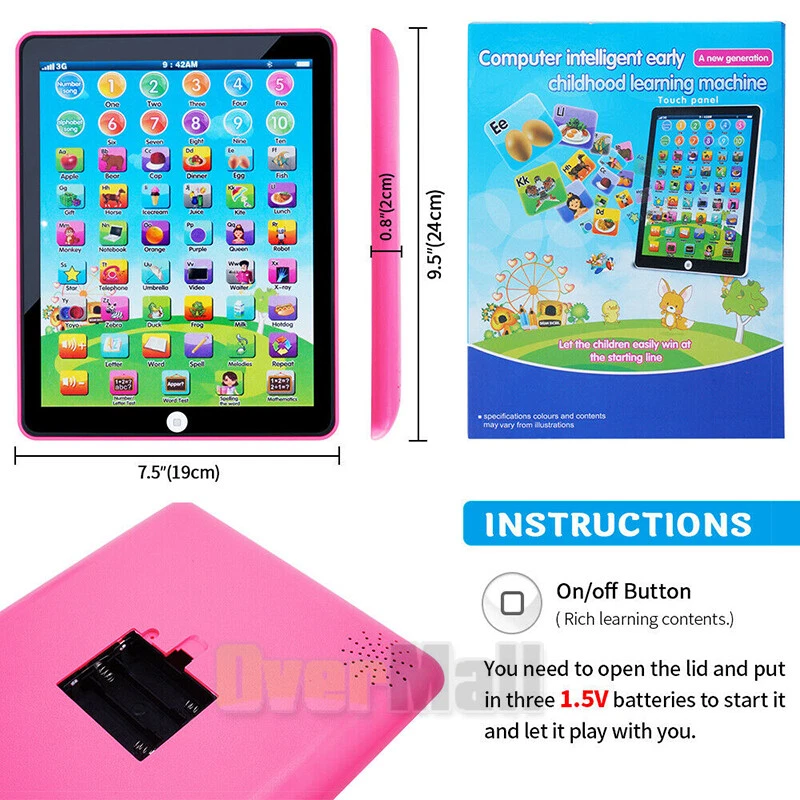 Educational Learning Toys for Kids Toddlers Age 3 4 5 6 7 8 Years Old Boys Girls BEST CUSTOMER SERVICE ON OUR sale2015express EBAY STORE↓ ↓ ↓ 〓SHIP From US Local Stock 〓FAST & Free, 1-6 Days Arrival 〓FREE Return, Seller Pay!! 〓QUICKLY Reply within 24 Working Hours 〓 MOST orders ship within 1 business day with Tracking Number 〓 ANY PROBLEM please email us before feedback, thanks! Add our listing to Watchlist Or Add to Cart , you will get more discount!!! A :Blue/Pink Learning Toys Feature: -- 8 Modes: This children's learning tablet includes three function modes and five learning modes: words, notes and letters mode, addition and subtraction mode, spelling, questioning, music mode and animal mode. -- Promote Early Learning: The LED screen will display letters and interesting graphics, the learning machine has clear and standard pronunciation, through the buttons, children can practice pronunciation, learn letters and vocabulary, enhance interest and develop language cognitive ability during play. -- Fun Mode: The tablet will ask some questions about letters, words, numbers, such as "Can you find the number 1" and other questions, when children press the answer, the LED screen will show whether the answer is correct, it can encourage children to think independently and active learning. -- Beautiful Music: This learning machine has a variety of melodies, songs and interesting animal sounds, which can attract children's attention, at the same time, it has simulated piano keys, and children can play a variety of wonderful melodies. -- Premium Material: Made of high-quality plastic, the material is thick, resistant to falling, not afraid of rough play by children, the learning machine is not only cute in appearance, but also small in size and easy to carry. -- Perfect Gift: It can be used as a birthday gift, Christmas gift for boys and girls over 3 years old, at home or in travel, it can make children to explore more knowledge and start a fun learning journey. Specification: Color: pink,Blue Material: plastic Batteries: 3*AA batteries (included) Applicable age: children 4-6 years old Product size: 23.5*18.5*2.3cm/9.3*7.3*0.9inch Packing box size: 25*20*4cm/9.8*7.9*1.6inch Package includes: 1x Kids Learning Tablet 3x AA batteries ============================================== B :Blue/Pink Learning Toys Features: *Made of non-toxic environmental ABS plastic. *Simple function,featuring with Volume +, Volume -, just turn on ON/OFF function,then gentle press, easy for children to operate *No LED which is harm to kids' eyes. *Learning and playing content:Provides funny ways for children to learn 26 A-Z Alphabet Letters, Words Learning and Spelling, Color Learning, Animal Learning, Fruit Learning,Food Learning, Alphabest song and Number song. *Developing baby's emotion,hearing,grip,sensory,hand-eye coordination,visual and other abilities *Great gift for baby toddlers boys and girls for Children's Day, Birthday, Christmas Day, New Year. *Lightweight and portable. Attention: 1.After placed the batteries, Press the Home Button it will be turned ON/OFF,then start your learning by press other Icon. 2.NOT Real iPad,Pressed only!!! No slide! 3.Not with LCD Touch Screen, No Wi-Fi, It's a learning type mini ipad to teach babies and kids in a gaming type. 4.Please note it says on package not suitable for children under 3 years, actually it is suitable for kids age 1-3 playing under adult supervision. Specifications: Materials:Environmental ABS Power:3 x AA batteries ( included) Size: 18.4*14.3*1.8cm Package includes: 1x Mini Learning iPad Toy 3 x AA batteries (Free gift,No extra purchase is better than others without batteries) On Sep 7, 2025 at 06:35:42 PDT, seller added the following information: