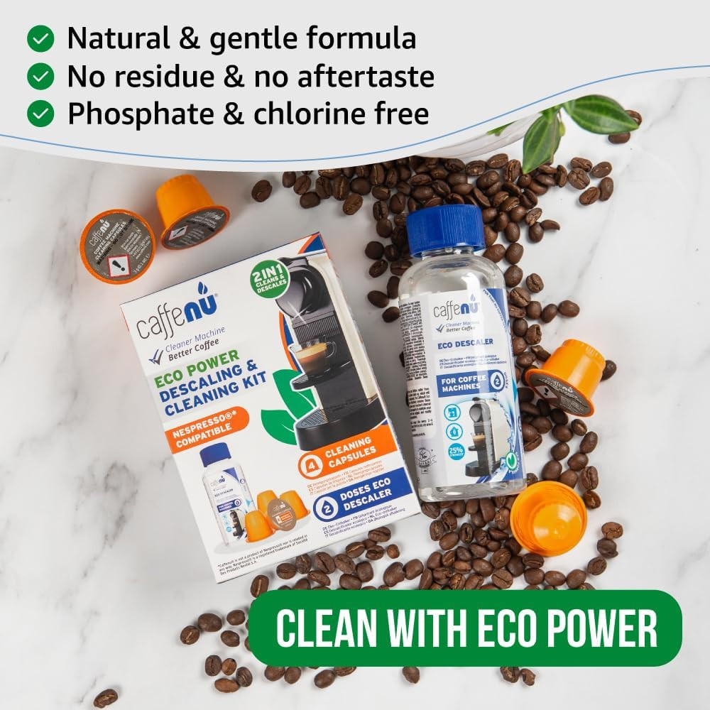 Nespresso Compatible Descaling Kit & Cleaning Pods. 2 Use Descaling Solution & 4 Cleaner Pods. Removes Limescale & Cleans Pod Area. Better Tasting, Hotter Coffee. Nespresso Originaline. Product Details Package Dimensions : 5.51 x 4.02 x 2.2 inches; 6.46 ounces Item model number : TM-CFCK-NC01 Material Feature : Biodegradable Warning Manufacturer : Caffenu Brand: Caffenu Item Form: Capsule Scent: Espresso Specific Uses For Product: Coffee Machines Material Feature: Biodegradable CLEAN YOUR MACHINE & EXTEND ITS LIFE: Our Concentrated Descaling Solution Formula removes limescale and mineral deposits from your machine to maintain its internal components so it runs smoothly for a long time; It also prevents corrosion; It is compatible with Nespresso Originaline Machines; Not compatible with Vertuo Line machines ☕ IMPROVES TASTE: Have your coffee and teas tasting better by cleaning your beverage appliances USE IT IN ALL TYPES OF COFFEE MACHINES, KETTLES & URNS: Use this descaling solution in any brand or type of coffee or espresso maker; It's great as a Keurig descaling solution and compatible with ALL single-use coffee & espresso machines! It's also compatible with kettles and electric water heaters A MORE POWERFUL DESCALING FORMULA: Our Coffee Machine Descaler has a higher concentrarion of active ingredient which makes it more Powerful and effective in reaching the critical components of your coffee or espresso machine and getting rid of all calcium deposits; This concentrated descaling solution is made of plant-based Lactic Acid which makes it great for the environment; It will restore the performance of your machine; Exceeding the cleaning performance of other formulas