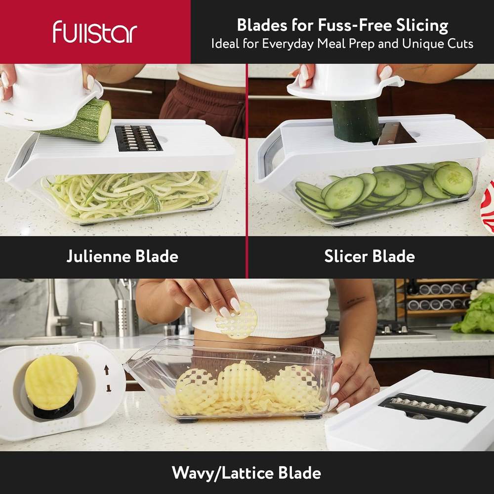 Convenient Pouring Veggie Slicer - Say goodbye to spills! Our dicer chopper's convenient pouring feature lets you easily add chopped veggies straight into your dish without lifting the lid or disassembling. This is the perfect food chopper with container for prepping salad bowls, stir-fries, and more. 8 Interchangeable Precision Blades - Comes with 2 chopping blades (fine and large dicer) and 6 slicing blades: julienne, coarse grater, fine grater, zester, slicer, and an exclusive wavy blade not found in other vegetable chopper with container. These versatile blades deliver precision to your kitchen for creating gourmet salads, perfectly diced vegetables, and decorative garnishes. Innovative Self-Cleaning Pusher Grid - No mess, no stress! Our onion chopper's innovative self-cleaning grid pushes food residue forward for easy removal from the blades. Prep with ease and clean up in seconds with Fullstar's innovative vegetable slicer. Large Catch Tray with Dual-Lid - The Fullstar vegetables slicer comes with a large 800ml capacity tray for easy ingredient collection. Easily switch between slicing and dicing using dual lids: one slim mandoline slicer and one robust chopper, each designed for specific blades. With this potato slicer, you get the perfect tool for every prep. Effortless Cleanup and Safe Storage - Our BPA-free cucumber slicer vegetable cutter comes with 2 cleaning scrapers, a cleaning brush, and a finger guard for safety. Plus, it's top-rack dishwasher safe! The included blade organizer ensures everything stays tidy and sharp, ready for your next culinary adventure. Fullstar 8 blade chopper and mandoline with pouring feature