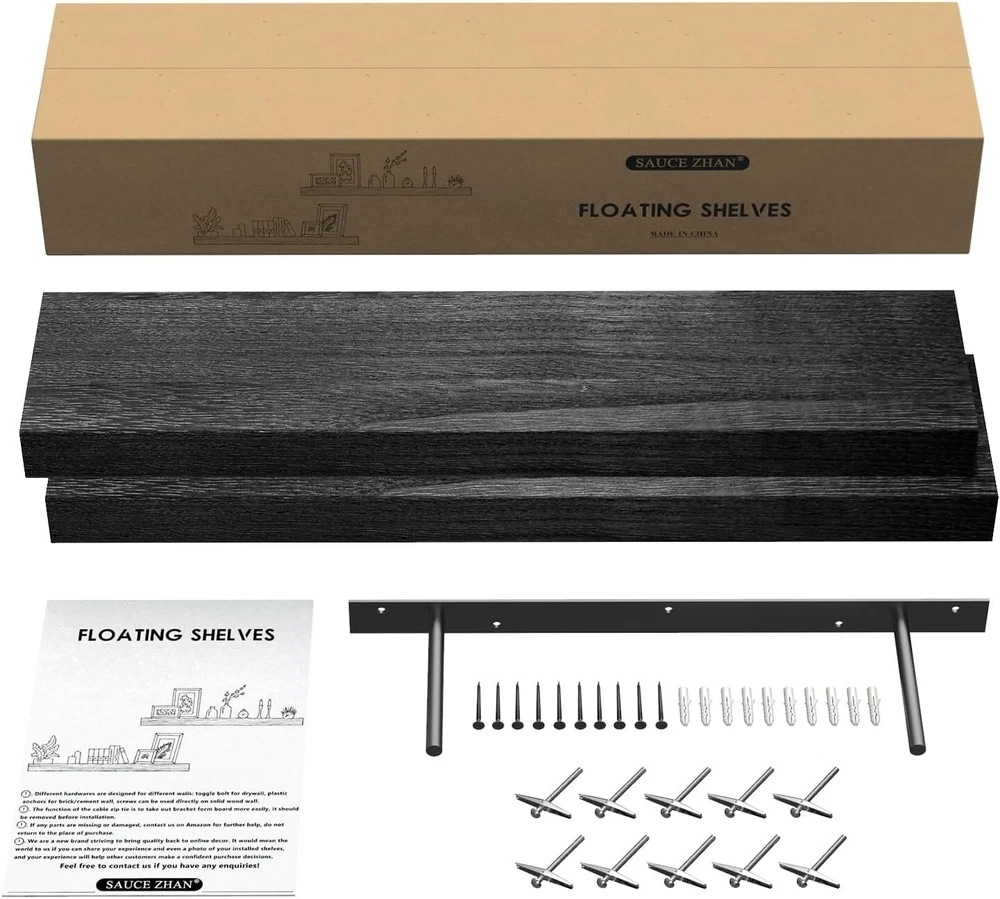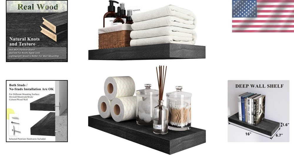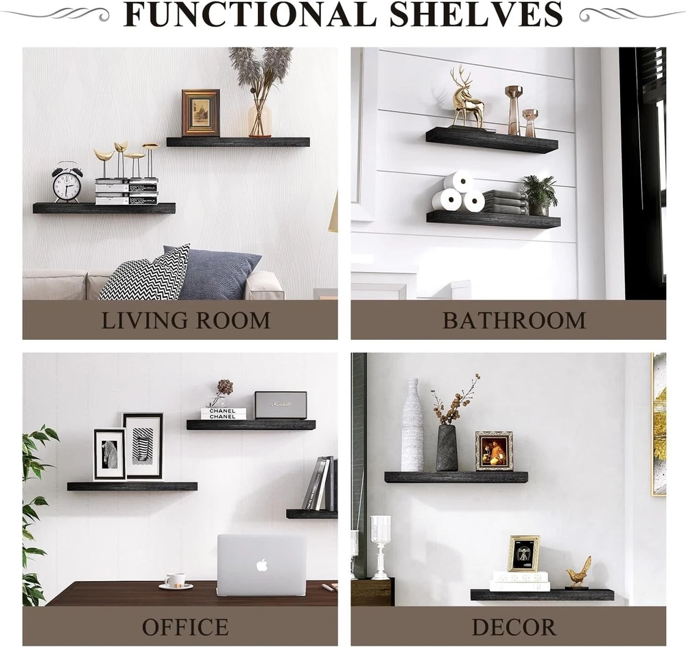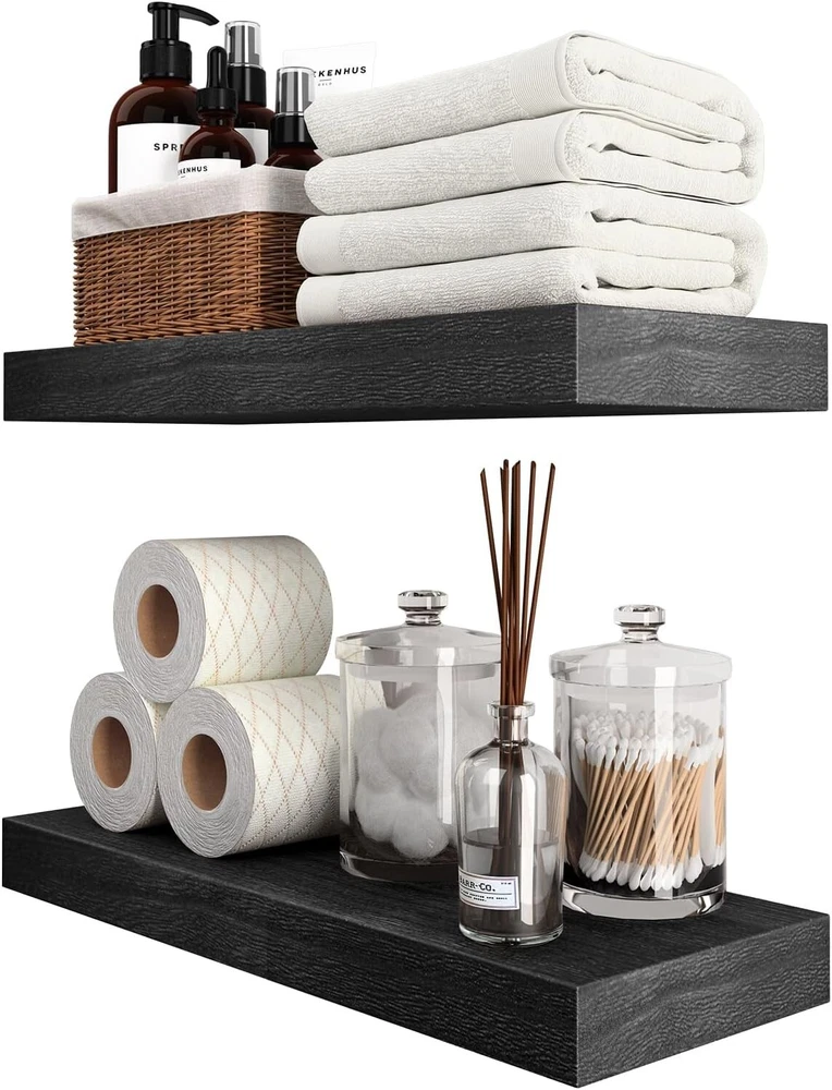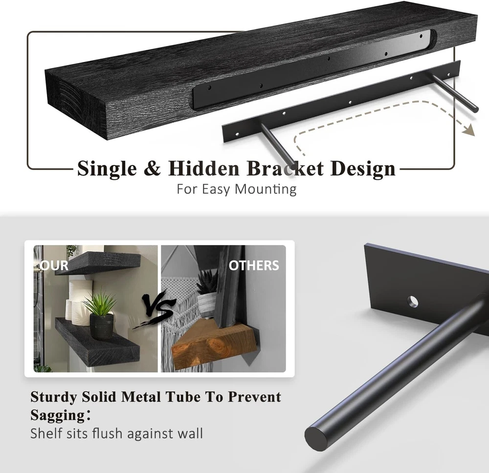 Style: Rustic Type: Floating Shelf Features: Space Saving, Sturdy, Secure, Effortless Installation, Stylish, Functional gtin13: Does not apply Item Length: Floating Shelves Product Dimensions: 6.7"d X 16"w X 1.5"h Material: Wood Packaging: Flat Pack Department: Adults Personalized: No Additional Parts Required: No UPC: Does not apply Distance from Floor to Bottom: 6 in Finish: Unfinished Color: Black Unit Count: 2.0 Count Size: 16 Inch Shape: Rectangle Room: Office, Kitchen, Bedroom, Dining Room Product Care Instructions: Wipe With Dry Cloth Finish Type: Unfinished Required Tools: No Tools Required Age Range (description): Adult Number Of Items: 2 Installation Type: Wall-mount Door Mechanism: Open Face Included Components: Rod Suitable For: Decorative Storage Number of Items in Set: 2 Special Feature: Space Saving Mounting: Wall Mounted Specific Uses For Product: Decorative Storage In Various Rooms Of A Home Item Width: 16 in Brand: Unbranded Maximum Weight Capacity: 50 lb Number of Shelves: 2 Wood Tone: Light Wood Furniture Finish: Wood Recommended Uses For Product: Bathroom, Kitchen, Living Room, Bedroom Item Weight: 5 lb Maximum Weight per Shelf: 20 lb Set Includes: Floating Shelf, Shelf Brackets Item Height: Floating Shelves Room Type: Office, Kitchen, Bedroom, Dining Room