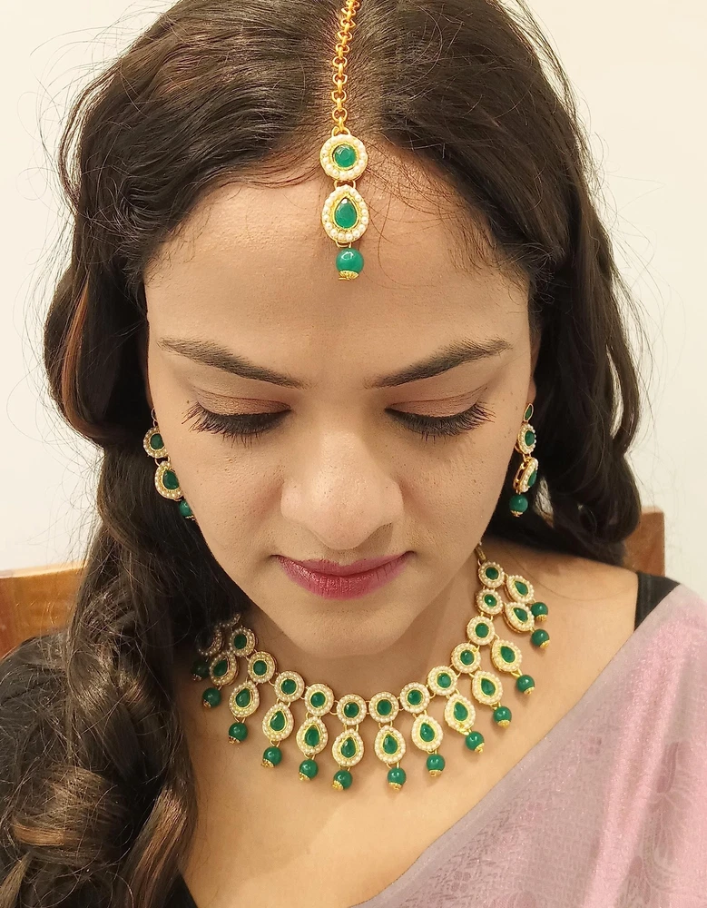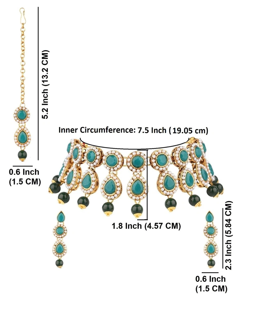Efulgenz Indian Jewelry Choker Kundan Crystal Necklace Earrings Maang Tikka Head Chain Bollywood Wedding Bridal Set Product Details Product Dimensions : 16 x 1.8 x 16 inches; 6.38 ounces Item model number : MNT1707 Department : womens Date First Available : May 4, 2021 Manufacturer : Jaipur Art Jewellery Country of Origin : India Brand, Seller, or Collection Name: Efulgenz Metal: alloy Material: Metal, Crystal, Rhinestone Gem Type: No Gemstone Item Length: 16 inches Chain: Box Clasp: Lobster Clasp Ring size: adjustable Model number: MNT1707
