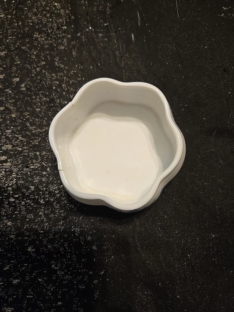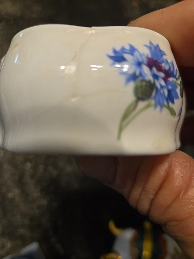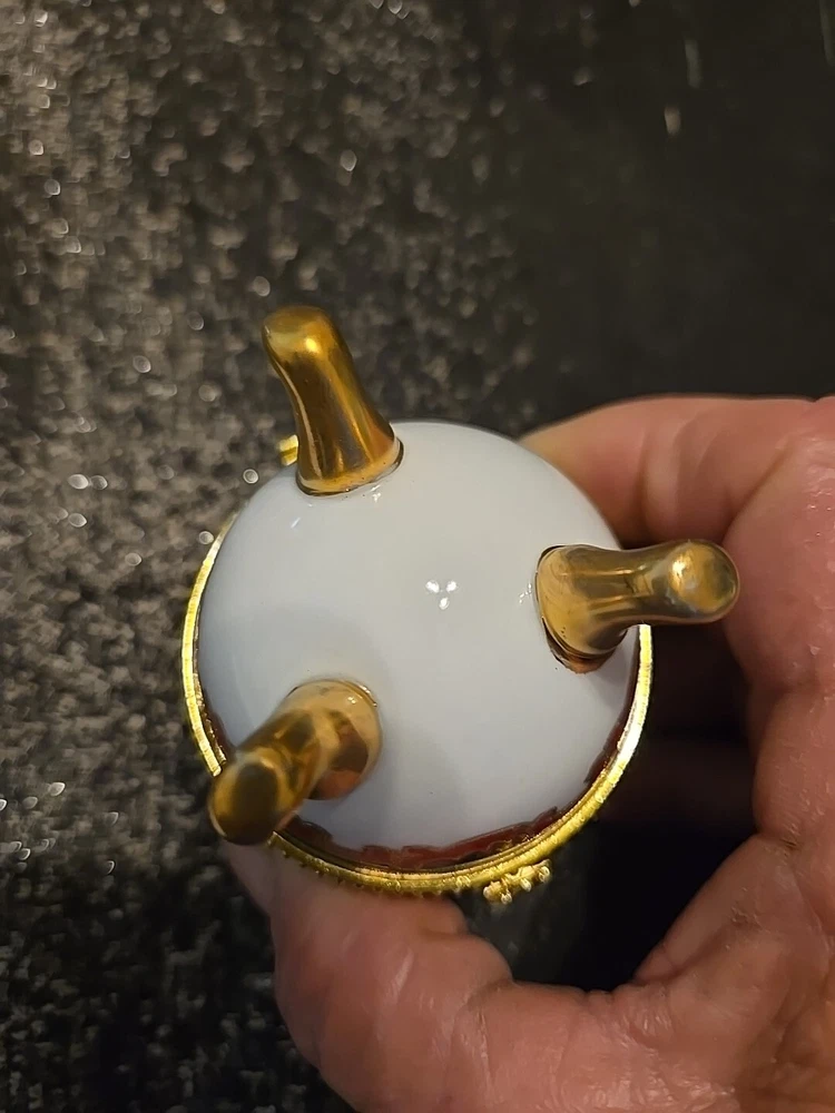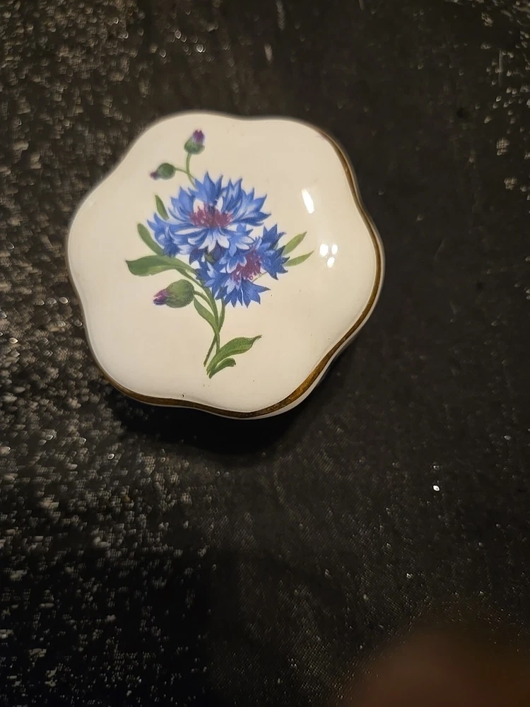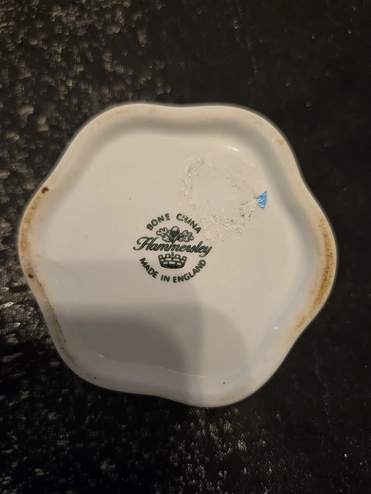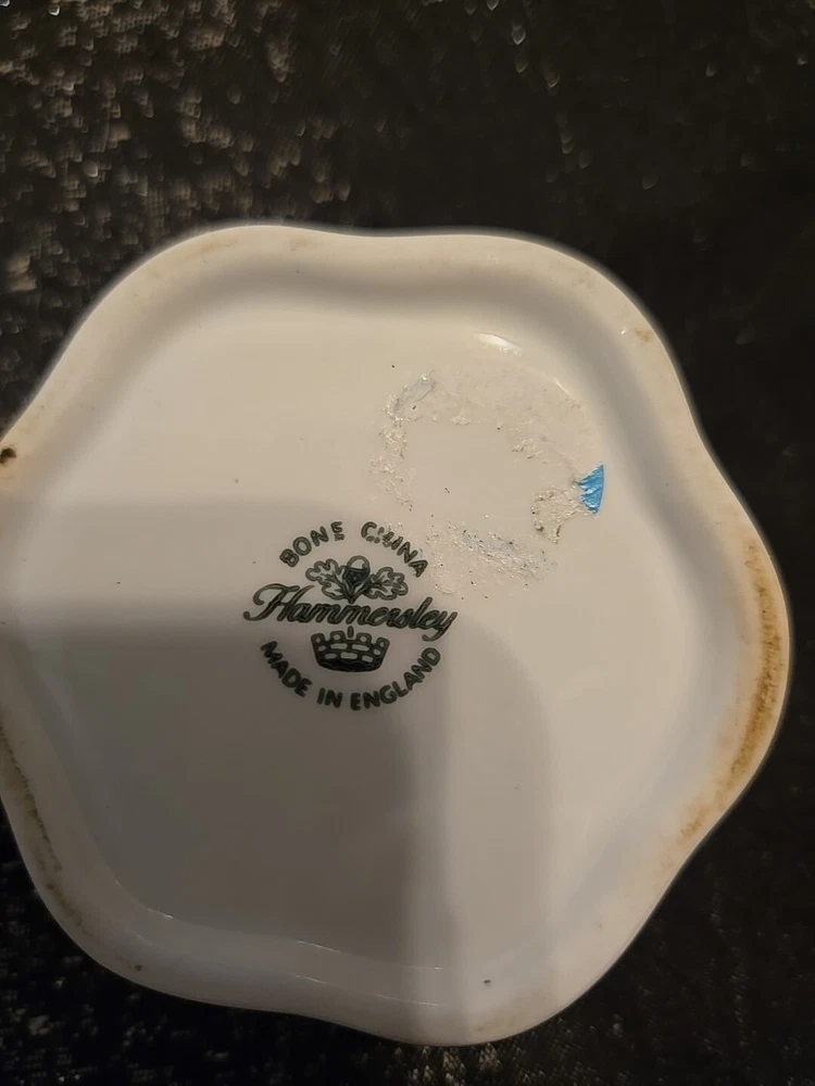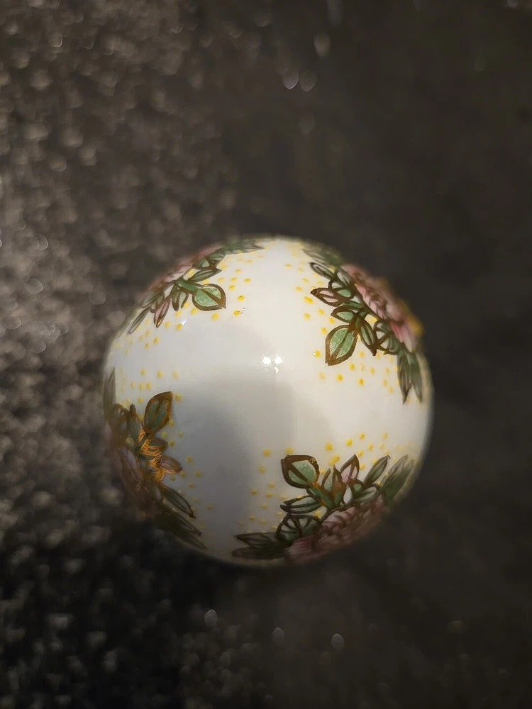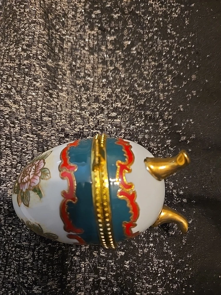This is an Egg Shaped Trinket Box made of porcelain in a small oval shape with a multicolor flower pattern. It comes in a pack of two, including a glossy finish Hammersley trinket box also adorned with flowers. The item width is 2.5 inches and it weighs 5 ounces. These decorative collectibles are suitable for all occasions and would make a charming addition to any collection or as a gift. The Hammersley has been broke and fixed back together as shown in my pics.