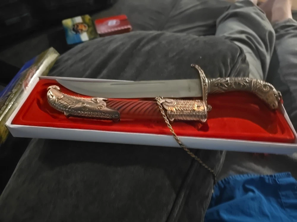 This is a knife featuring a stainless steel blade with a serrated edge and a silver color. It has a unique ram's head design on the handle, which is made of metal.