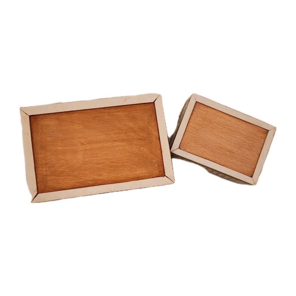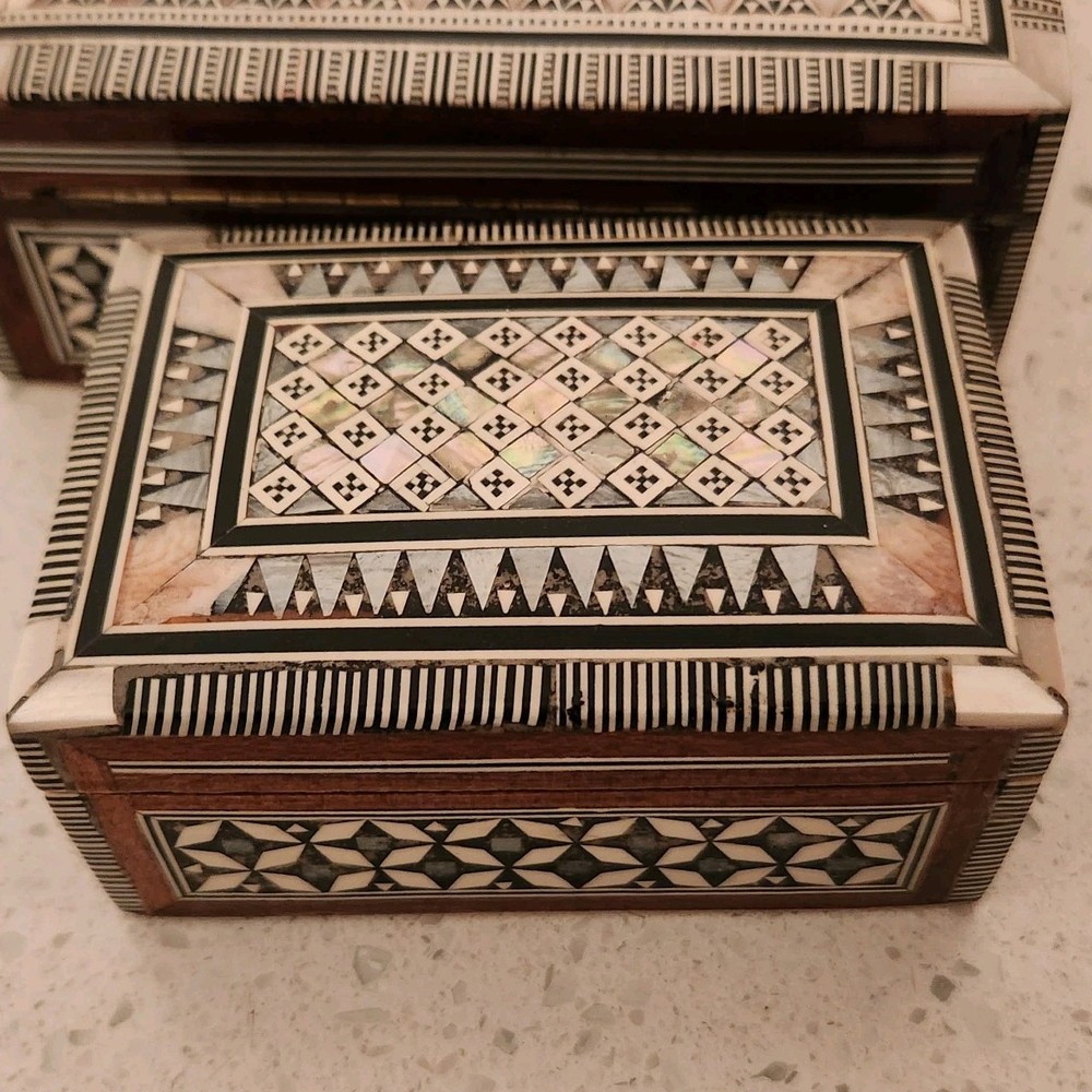 Set of 2 Mother of Pearl & wood trinket or jewelry box. Attached lids. 1 flaw in pearl on the smaller box, see pics for details. We did list at a lower price due to markings.