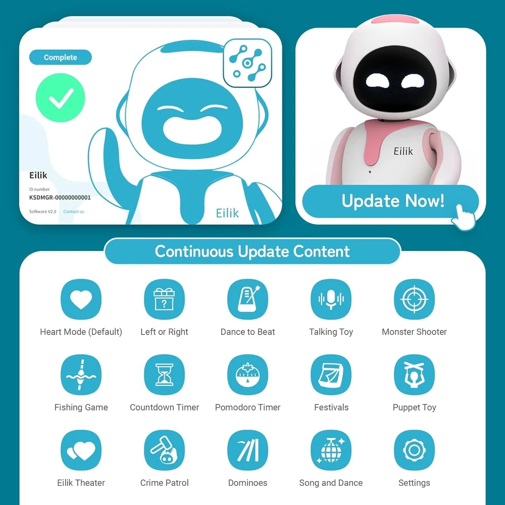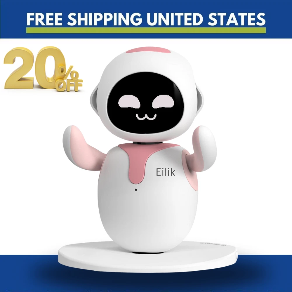 Free eBay listing template designed by dewiso.com Eilik - an Electronic Cute Robot Pets Toys with Intelligent and Interactive | Ab Eilik - Cute Electronic Cute Robot Pets Toys with Intelligent and Interactive HOW TO PLAY - Place it on the desk, and with a simple tap, you can delve into Eilik's emotional world. The head, belly, and back each trigger different emotions. A multitude of expressions await discovery, and you can also lift it up or gently pat its head. Whether it's gentle or temperamental, it all depends on your interaction. Most importantly, no WiFi or Bluetooth connection is required, just power on & play with him whenever you want. FUNNY ROBOT PETS - Eilik is the ideal companion for both children and adults who love pets. You can engage in a variety of entertaining mini-games, and it's incredibly user-friendly. In the Left or Right game, you just need to gently touch Eilik's left or right hand to interact with it. For the shooting game, a touch on the head allows you to shoot monsters, while the fishing game only requires you to twist Eilik's body according to the instructions on the screen! MORE EILIK MORE FUN - Eilik is more than a robot, when he meets another Eilik and connects with each other, they will chat, play, and also fight or quarrel. Plus, If there is a group of Eilik, they will also have a party time! CONSTANTLY UPGRADING AND ADAPTING - With frequent firmware updates and new interactive content added, Eilik will constantly learn more emotions, functions, and games, it will keep him entertained all the time! ATTENTION - Eilik does not support voice interaction and AI. The hardware used for the robot's joints is fully certified and compliant, though it may produce a certain level of noise during operation, which is a normal occurrence for robotic toys. To protect the robot's hardware, it will automatically power down after an extended period of inactivity. OTHER FUNCTIONS - Eilik has multiple modes available: Countdown Timer & Pomodoro Timer sets a timer for you, Dance to Beat allows Eilik to dance to the beat you provide, and Festivals enables Eilik to perform different holiday-themed shows. Numerous playful features await your discovery. UNLIMITED DIY - Puppet Toy mode allows you to choose expressions and actions for Eilik and dress him up, the idle animations are perfect for taking funny videos and photos! THE PERFECT GIFT - Eilik is a wonderful present. You should let your friends or kids have Eilik, bring him to meet with them, and let these little guys have fun together!