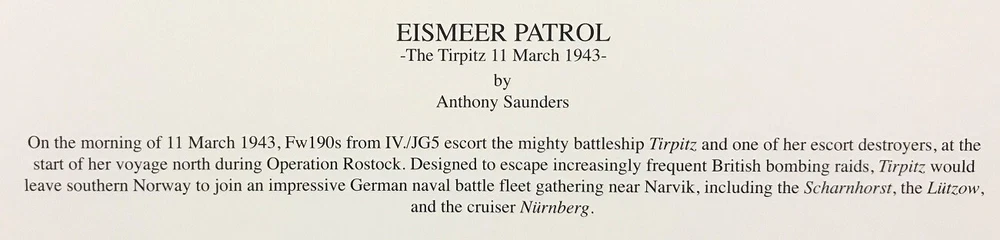 The Tirpitz 11 March 1943 EISMEER PATROL by Anthony Saunders On the morning of 11 March 1943, Fw190s from IV./JG5 left their base to escort the mighty battleship Tirpitz and a screening fleet of escort destroyers and torpedo boats, at the start of a voyage north to Bogen Bay during ‘Operation Rostock’, designed to escape the increasingly frequent British bombing raids. Tirpitz would leave southern Norway to join an impressive German naval battle fleet gathering near Narvik, one of the largest German naval bases in Norway. Together with the Scharnhorst , the heavy cruiser Lützow and the light cruiser Nürnberg , they would pose a grave threat to the Arctic convoys. Tirpitz was the flagship of the German Kriegsmarine. After repeated attempts to sink her she was eventually destroyed by Lancaster Bombers of 617 and 9 Squadrons at her anchorage in Altafjord on 12 November 1944. THE SIGNATURES This stunning print has been hand numbered and signed by artist as well as one of the few survivors rescued from the upturned hull of the Tirpitz when she was sunk, along with an escort pilot who was one the last to fly over the sinking vessel: Leutnant Zur See WILLIBALD VÖLSING He was Senior Controller in the Gunnery Fire Control Section on Tirpitz, one of the most important gunnery positions on the ship, passing vital information between the ship’s guns and the ship’s commanders. After the Tirpitz capsized, he was one of the few fortunate survivors to be released from deep inside the ship by rescuers cutting into the upturned hull. Oberleutnant KURT SCHULZE After serving during the “Blitzkrieg” in France, he then flew as a Me-110 wireless operator over southern Russia, and then night missions against England in Do-217s with I./KG2. In September 1943 he trained as a fighter pilot and flew 65 missions in Me109s with III./JG5 on the Arctic Front, scoring three victories. In November 1944 he flew in the ill-fated defense of the German battleship Tirpitz arriving too late to intercept RAF bombers. He finished the war in command of 16./JG5 in Norway. This is a striking print that carries outstanding signatures making it a really historic piece and a great buy at the original release price. Please note: The prints in my store are hand-signed by the veterans involved in the painting so the signatures are original autographs and not reproductions. The certificate of authenticity is included. CONDITION: My items are guaranteed to be in perfect condition, any issues are clearly detailed in the description. SHIPPING: As a long time aviation art retailer I have shipped countless prints over the years. My prints are rolled in acid free tissue and shipped in heavy duty tubes, and the shipping is insured and guaranteed. If you are interested in more than one item I will always do my best to combine the shipping to save costs – please just ask.