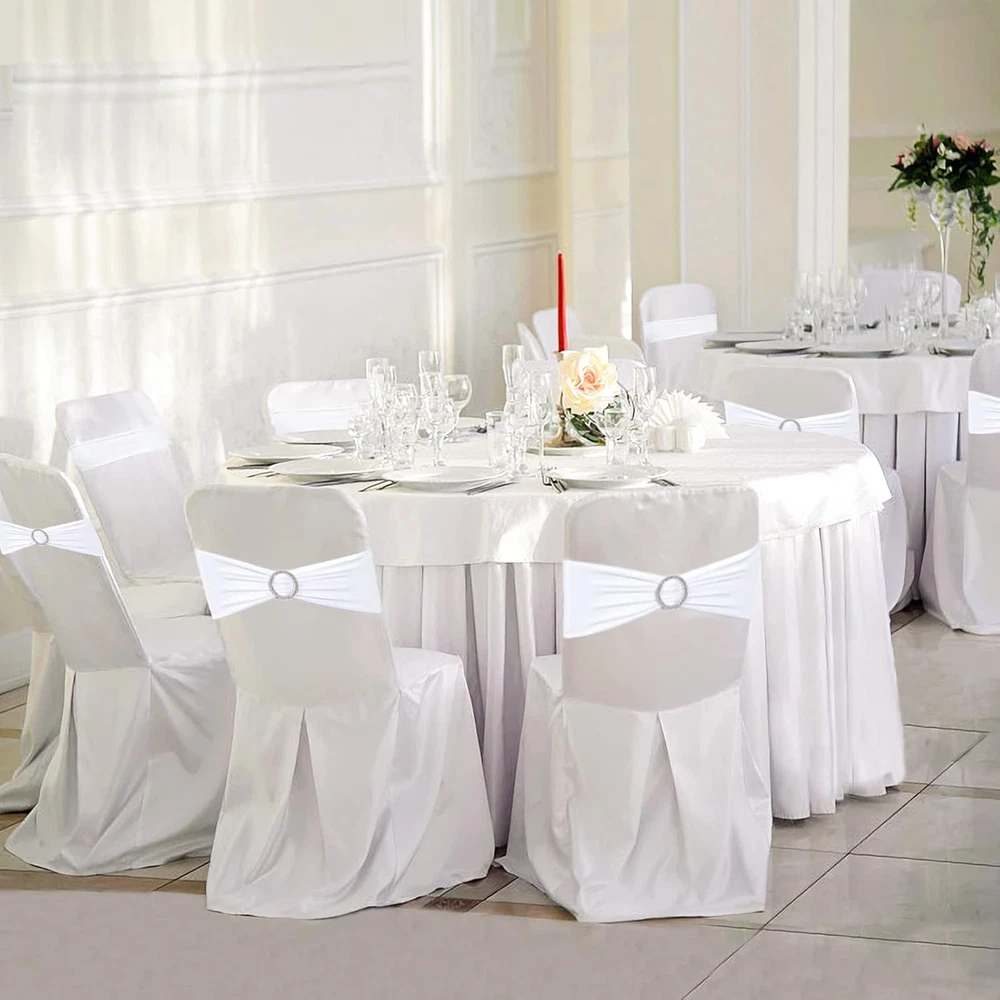 Add a touch of elegance to your event decor with the Zhongyuan Spandex Chair Sashes. Designed for versatility, these white chair covers are ideal for weddings, parties, or any special event. The rectangular shape and solid pattern seamlessly blend with various table settings and centerpieces. Each sash measures 14"W x 6"H, ensuring a perfect fit for most chair backs. Crafted from a blend of 90% polyester and 10% spandex, these chair bows are both durable and elastic, offering a snug, stretchable fit without the need for assembly. The included fabric and buckle components allow for easy decoration, while the machine-washable design ensures hassle-free upkeep. The set contains 25 pieces, allowing for a cohesive look throughout your venue.