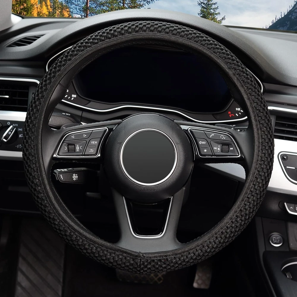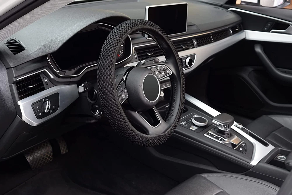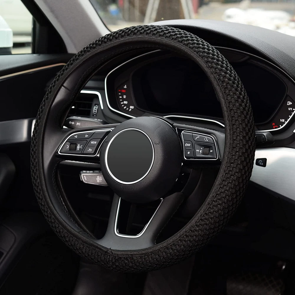 Suitable for all middle-size steering wheels with diameter 14 1/2 inch to 15 inch(37cm to 39cm). Made of durable microfiber breathable ice silk ,bring you a great touch and feel.Warm in Winter and Cool in Summer.Healthy and Eco-friendly. Sweatproof and Anti-skidding, stable, heat resistant, A better grip on the steering wheel gives you more control on the road. Perfect decor for your car, also protect your steering wheel. Easy to Install,Because of the elastic stretch rubber band, Any adult can easy install this steering wheel cover, no tools required. Product Description Need more steering wheel covers? Just click into Visit the KAFEEK Store or search for KAFEEK steering wheel covers .