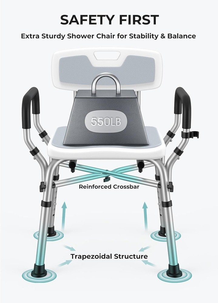 About this item Sturdy Shower Chair With Arms and Back in Anti-corrosion Aluminum Construction HEAVY DUTY SHOWER CHAIR: Made of high-quality aluminum with reinforced frame, the handicap shower chair with crossbar supports up to 550 lbs, sturdy but light to move easily, enhanced stability & balance to add extra support for large adults, elderly and disabled SAFETY MEETS COMFORT: The shower seat comes with soft EVA padded armrests and backrest for long-lasting seating comfort, thanks to anti-slip rubber feet, the bath chair is safe and easy to sit down & stand up, non-slip while bathing in a wet shower or bathtub. Rust-resistant & waterproof material of bathroom chair ensures quick-drying for long-lasting durability TOOL-FREE ASSEMBLY IN 10-MIN: The instructions for shower chairs are straightforward! Tool-free assembly with clear directions and labeled parts of tub seats for seniors, as well as a detailed video installation guide, in just 10 mins 6-HEIGHT BATH SEAT: Easily adjustable to six heights (27.5" to 32.5"), the bariatric shower chair with arms and back fits users from 5'3" to 6'5", offering more comfort and support than a shower stool/shower bench, meeting the needs of all age groups CONVENIENT & VERSATILE USE: The shower chair for inside tub includes a showerhead holder and shower bag to free your hands. 4-in-1 mode (shower stool/shower chair with arms/shower chair with back/shower chair with arms and back) can be adjusted as needed, an ideal shower chair for elderly and disabled, pregnant, and recovering from surgery