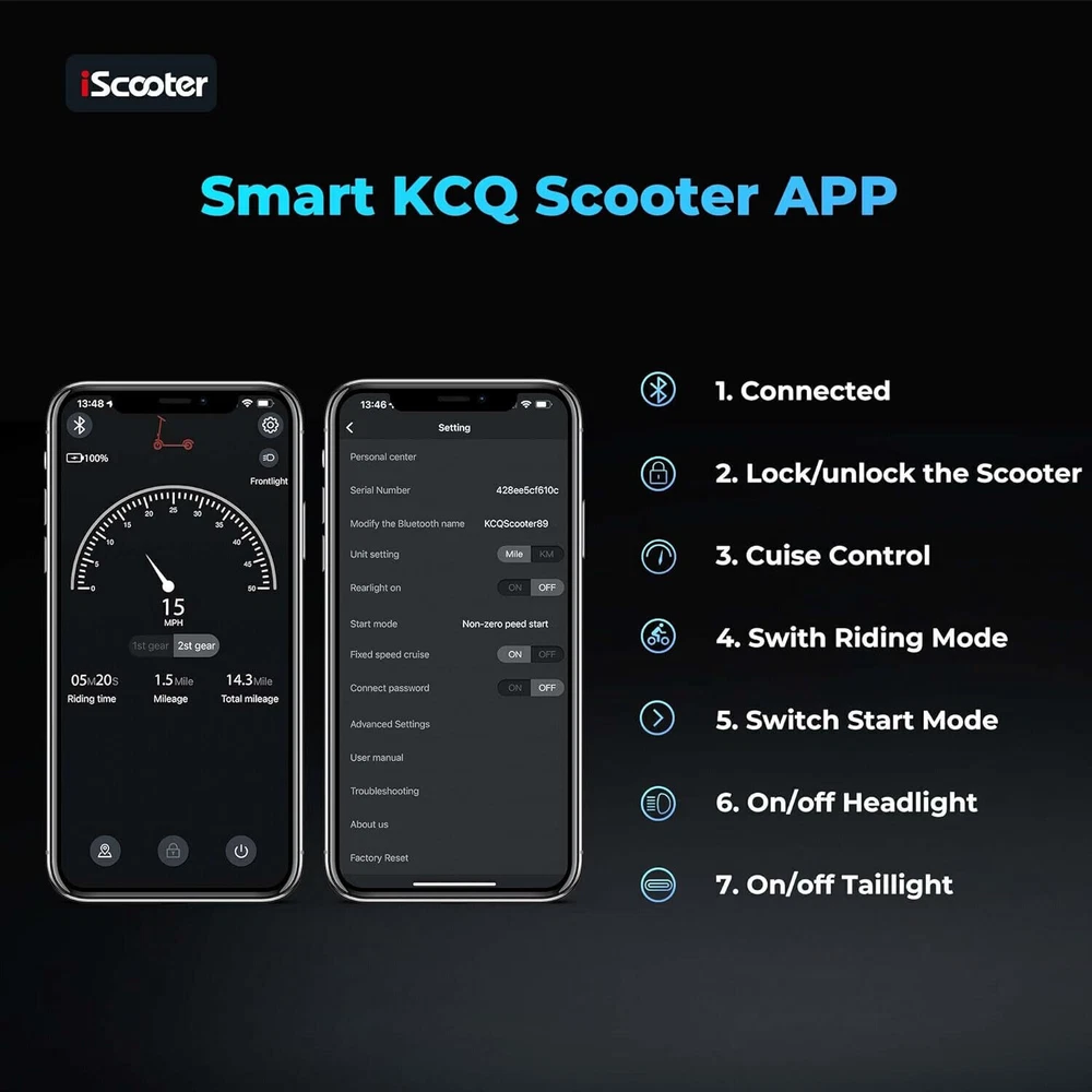 STORE NEW ARRIVALS ADD TO FAVORITE VIEW FEEDBACK CONTACT Store New Arrivals Add to Favorite View Feedback Contact Iscooter Electric Scooter, 25/22/18 Miles Range, 25/18.6/15.6 MPH Top Speed, 800W/500W/350W Foldable Commuting Electric Scooter with Double Braking Systems and APP for Adults and Teens Description Included Components i9 Electrcic Scooter Style i9(350W, 18miles) Number of Items 1 Age Range (Description) Adult Warranty Type Limited Package Weight 14.09 Kilograms Brand Name iScooter Brand iScooter Material Aluminum Suggested Users Ages 14 and up Frame Material Aluminum Handle Height 76 Centimeters Wheel Material Rubber Number of Wheels 2 Wheel Type Pneumatic Item Package Dimensions L x W x H 43.5 x 21 x 7 inches Manufacturer Zhejiang jinpan import and export co.,Ltd Brake Style Front Braking, Rear Braking Handlebar Type Fixed Grip Type Ergonomic Item Weight 10.9 Kilograms Charging Time 6 Hours Special Feature APP Controller, Non Slip Deck, foldable, Double braking system(Electronic brake+disc brake) Weight Limit 220 Pounds Item Dimensions LxWxH 42 x 17 x 44 inches Wheel Size 8.5 Inches Color Black Maximum Distance Range 18 Miles Recommended Uses For Product Commuting Model Name E9PRO Product Dimensions 42"L x 17"W x 44"H 【Cost-Effective Electric Scooter for Commuters】Discover an affordable and efficient commuting solution with our high-performance electric scooter adults. 350W electric scooters offers a maximum speed of 15.6mph, making your daily commute faster and more cost-effective. The Cruise Control System ensures a smooth and enjoyable ride. The scooter for adults has a maximum load capacity of 220lbs, catering to a wide range of riders. 【Long-lasting and Safety 】Equipped with a high-capacity 36V/7.5AH battery, our scooter electric boasts a travel range of 18 miles. With a quick charging time of 3-6 hours, you'll have more time on the go. Prioritizing your safety, it features warning taillights and ultra-bright headlights with a range of up to 15 meters, enhancing visibility during nighttime rides. The double braking system, including disc braking and EABS regenerative anti-lock braking, ensures a secure riding experience. 【Smart APP Control】Take control of your ride with the free KCQ APP, available for both iPhone and Android. Connect your adult electric scooter via Bluetooth and manage features such as lock/unlock, light control, gear adjustment, start mode selection, cruise control, and more. The smart APP enhances your riding experience and simplifies scooter operation. 【Foldable and Convenient】Experience unparalleled convenience with our one-step folding design that allows you to fold the scooter in just 3 seconds. Perfect for city commuting, campus travel, and office commutes, the scooter can be easily folded and weighs only 26 lbs, making it compact enough to fit in a car trunk. Elevate your family trips with this foldable electric scooter, providing unmatched convenience and joy. 【Quality Assurance by iScooter】At iScooter, we are committed to delivering premium, affordable, and reliable products. Enjoy peace of mind with our 12-month or 180-day warranty for different parts. If you have any questions, our dedicated customer support is ready to assist you. Your satisfaction is our utmost priority. Make your life more wonderful with iScooter's Foldable Electric Scooters. Product Description If you are looking for one special gifts for your childs or friends, We think that our i9 electric scooter will be the perfect one! Folding: 42''x17"x19" Unfolding: 42”*17“*44“ 1 36V/7.5AH Battery 2 Smart APP 1 Headlight &Taillight 2 Dual Braking Systems 3 Solid Tire&Mudguard Tips: Safety first! Always remember to wear helmets and knee pads How fast can electric scooters go? iScooter i9 electric scooters can go about 15.6mph with 2st gear, 9mph with 1st gear. What are the benefits of an electric sooter? The benefits of electric scooters are that they are affordable, high cost-effective and portable to save your time to find a parking space or wait for subway. They can also save you money on gas because they can be charged quickly. How long do e scooters last? With proper care and maintenance, an e scooter can last anywhere between 2 to 5 years or even longer. How do I choose my scooter electric? You can focus on the following factors: Rider's weight, Ease of installing, Battery life, Top speed you prefer, the weight of sooter and Appearance. Why there are different top speeds with same scooter. The factor of influencing the top speed: Rider's weight, the condition of road and weather, daily maintenance, etc. RECOMMEND FOR YOU Add to Cart Add to Cart Add to Cart Add to Cart Add to Cart Add to Cart Add to Cart Customer Reviews 4.3 out of 5 stars 773 3.5 out of 5 stars 2 4.3 out of 5 stars 773 — 4.4 out of 5 stars 285 4.3 out of 5 stars 773 4.4 out of 5 stars 49 Price $259.99 $ 259 . 99 $399.99 $ 399 . 99 $229.99 $ 229 . 99 $469.99 $ 469 . 99 $539.99 $ 539 . 99 $289.99 $ 289 . 99 $129.99 $ 129 . 99 Motor Power 350W 500W 350W 750W 800W 500W 70W Top Speed 15.6 mph 15.6 mph 15.6 mph 28 mph 25 mph 15.6MPH 6MPH Long Range 18 Miles 21 Miles 12 Miles 50 Miles 25 Miles 18 Miles 5 Miles Tires Type 8.5'' Honeycomb Tires 12" Pneumatic Tires 8.5'' Pneumatic Tires 10" Pneumatic Tires 10'' Off Road Tubeless Tire 10'' Honeycomb Tires 5'' & 3.5''PU Tires Hill Climbing Approx. 15% Approx. 15% Approx. 15% Approx. 20% Approx. 25% Approx. 15% / Charging Time 3-6 hours 5-6 hours 5-6 hours 8-9 hours 6-7 hours 3-6 hours 4-5 hours Package SIze 43*6*21 IN /110.5*16*53 CM 46*8.7*23.2 IN / 116*22*59 CM 43*6*21 IN / 110.5*15.5*53 CM 46.8*8.2*24 IN /118*21*60 CM 47.2*9.6*19 IN / 120*24.5*49CM 46*6*20.8 IN / 117*16*53 CM 25.6*9.2*9 IN /65*23.5*22.5CM Net Weight 26 LB/ 13.4 KG 55LBS/ 25KG 26.4LB / 12 KG 46.7LB / 21.2KG 51.2 LBS /23.25 KG 32.6 LB /14.8 KG 8.8LBS / 4KG Smart App ✔ ✘ ✘ ✔ ✔ ✔ ✘ ABOUT US We offer the best prices around on high quality products. Our E-store inclu