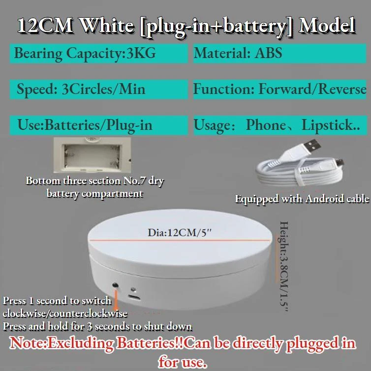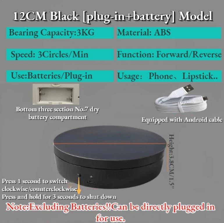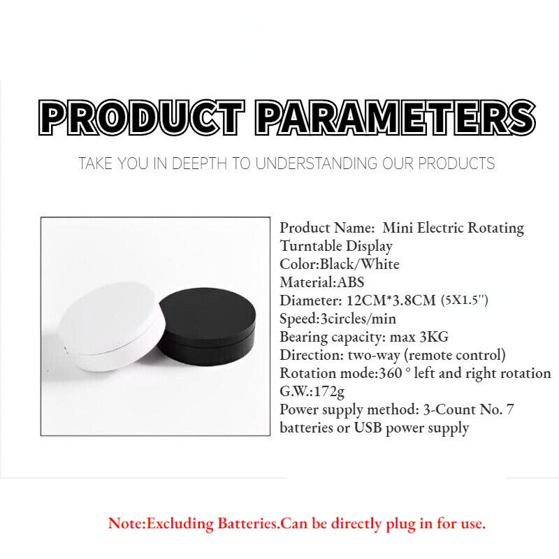 Store Categories Store Categories Lifestyle Home & Garden Tools Sports & Outdoor Electronic Dolls Batteries Accessory Other Product Description Features: 1. Remote con trol design 2. low noise rotation 3. Safe and durable 4. Easy to operate 5. The turntable can work for a long time 6. Two-way rotation 7. Wide range of applications,whether it's shooting products or videos, it can bring you more wonderful moments Specification: Color:Black/White Material:ABS Diameter: 12CM*3.8CM(5''X 1.5'') Speed:3circles/min Bearing capacity: max 3KG Direction: two-way (remote control) Rotation mode:360 ° left and right rotation G.W.:172g Power supply method: 3-Count No. 7 batteries or USB power supply Package Includes : 1 x Set of Electric Turntable Payment Policy Shipping Policy Returns Policy About Us Contact Us Payment Policy 1. We accept PayPal only. 2. All major credit cards are accepted through secure payment processor PayPal. 3. Payment must be received within 7 business days of auction closing. 4. If you have bought multiple items from me, you can send me one payment for all the items instead of paying for them individually. When you click the Pay Now button, eBay will automatically determine if there are other items you have won or purchased from me and will combine them for your review. 5. NOTE: Import duties, taxes and chargers are not included in the item price or shipping charges. These charges are the buyer's responsibility. Please check with your country's customs office to determine what these additional costs will be prior to bidding buying. Shipping Policy 1. We Ship to Worldwide. 2. Items will be shipped within 7-14 business day on payment received. 3. Item are shipped from Shenzhen using Airmail, reach most of the countries within 10 to 35. 4. Delivery time depends on destination and other factors, it may takes up to 40 business days. 5. We are not responsible for undeliverable address, we reserve the right to charge the shipping fee again for returned items due to wrong address. 6. If you do not receive your item by 30 business days, Please feel free to contact us via ebay mail system, we will try our best to resolve any problems with you. Returns Policy 1. You have 7 day to contact us and 10 days to return it from the date it was received. If this item is in your possession more than 7 days, it is considered used and WE WILL NOT ISSUE YOU A REFUND OR REPLACEMENT.There are NO EXCEPTIONS! 2. All Returned items Must Be in the original packaging and you MUST PROVIDE us with the shipping tracking number, specific reason for the return,and your ebay ID. 3. We will refund YOUR FULL WINNING BID AMOUNT, upon receipt of the item in its original condition and packaging with all components and accessories included, AFTER BOTH Buyer and Seller cancel the transaction form ebay.OR, you may choose to have a replacement. 4. Return shipping is to be paid by the Buyer. About Us 1. We strive for our customer satisfaction at best possible. If you have any questions, please feel free to email our service specialists 24 Hours a Day, 7 Days a week. We will reply you ASAP. If no response within 24 Hours, please check the spam in your mail box. 2. We greatly appreciate your POSITIVE feedback. Please do NOT leave negative feedback without asking for help. Our aim is to provide Top Level Customer Service, normally so we will try our best to solve any problem you have. 3. Please DON'T leave negative or neutral feedback if you haven't received item in 30 days, because we have mentioned the shipping time repeatedly. Contact Us Our customer-oriented service strives for positive feedbacks with all 5 star selling ratings . Please feel free to contact us via eBay message once you have any question before you giving us negative feedback or open case. Business time: GMT8 (9:00-18:00) from Monday to Friday Copyright © 2023 Dianxiaomi