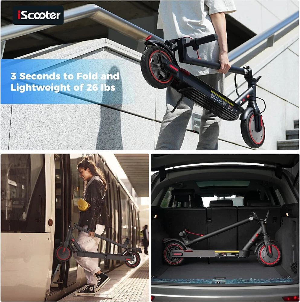 STORE NEW ARRIVALS ADD TO FAVORITE VIEW FEEDBACK CONTACT Store New Arrivals Add to Favorite View Feedback Contact Iscooter Electric Scooter, 25/22/18 Miles Range, 25/18.6/15.6 MPH Top Speed, 800W/500W/350W Foldable Commuting Electric Scooter with Double Braking Systems and APP for Adults and Teens Description Included Components i9 Electrcic Scooter Style i9(350W, 18miles) Number of Items 1 Age Range (Description) Adult Warranty Type Limited Package Weight 14.09 Kilograms Brand Name iScooter Brand iScooter Material Aluminum Suggested Users Ages 14 and up Frame Material Aluminum Handle Height 76 Centimeters Wheel Material Rubber Number of Wheels 2 Wheel Type Pneumatic Item Package Dimensions L x W x H 43.5 x 21 x 7 inches Manufacturer Zhejiang jinpan import and export co.,Ltd Brake Style Front Braking, Rear Braking Handlebar Type Fixed Grip Type Ergonomic Item Weight 10.9 Kilograms Charging Time 6 Hours Special Feature APP Controller, Non Slip Deck, foldable, Double braking system(Electronic brake+disc brake) Weight Limit 220 Pounds Item Dimensions LxWxH 42 x 17 x 44 inches Wheel Size 8.5 Inches Color Black Maximum Distance Range 18 Miles Recommended Uses For Product Commuting Model Name E9PRO Product Dimensions 42"L x 17"W x 44"H 【Cost-Effective Electric Scooter for Commuters】Discover an affordable and efficient commuting solution with our high-performance electric scooter adults. 350W electric scooters offers a maximum speed of 15.6mph, making your daily commute faster and more cost-effective. The Cruise Control System ensures a smooth and enjoyable ride. The scooter for adults has a maximum load capacity of 220lbs, catering to a wide range of riders. 【Long-lasting and Safety 】Equipped with a high-capacity 36V/7.5AH battery, our scooter electric boasts a travel range of 18 miles. With a quick charging time of 3-6 hours, you'll have more time on the go. Prioritizing your safety, it features warning taillights and ultra-bright headlights with a range of up to 15 meters, enhancing visibility during nighttime rides. The double braking system, including disc braking and EABS regenerative anti-lock braking, ensures a secure riding experience. 【Smart APP Control】Take control of your ride with the free KCQ APP, available for both iPhone and Android. Connect your adult electric scooter via Bluetooth and manage features such as lock/unlock, light control, gear adjustment, start mode selection, cruise control, and more. The smart APP enhances your riding experience and simplifies scooter operation. 【Foldable and Convenient】Experience unparalleled convenience with our one-step folding design that allows you to fold the scooter in just 3 seconds. Perfect for city commuting, campus travel, and office commutes, the scooter can be easily folded and weighs only 26 lbs, making it compact enough to fit in a car trunk. Elevate your family trips with this foldable electric scooter, providing unmatched convenience and joy. 【Quality Assurance by iScooter】At iScooter, we are committed to delivering premium, affordable, and reliable products. Enjoy peace of mind with our 12-month or 180-day warranty for different parts. If you have any questions, our dedicated customer support is ready to assist you. Your satisfaction is our utmost priority. Make your life more wonderful with iScooter's Foldable Electric Scooters. Product Description If you are looking for one special gifts for your childs or friends, We think that our i9 electric scooter will be the perfect one! Folding: 42''x17"x19" Unfolding: 42”*17“*44“ 1 36V/7.5AH Battery 2 Smart APP 1 Headlight &Taillight 2 Dual Braking Systems 3 Solid Tire&Mudguard Tips: Safety first! Always remember to wear helmets and knee pads How fast can electric scooters go? iScooter i9 electric scooters can go about 15.6mph with 2st gear, 9mph with 1st gear. What are the benefits of an electric sooter? The benefits of electric scooters are that they are affordable, high cost-effective and portable to save your time to find a parking space or wait for subway. They can also save you money on gas because they can be charged quickly. How long do e scooters last? With proper care and maintenance, an e scooter can last anywhere between 2 to 5 years or even longer. How do I choose my scooter electric? You can focus on the following factors: Rider's weight, Ease of installing, Battery life, Top speed you prefer, the weight of sooter and Appearance. Why there are different top speeds with same scooter. The factor of influencing the top speed: Rider's weight, the condition of road and weather, daily maintenance, etc. RECOMMEND FOR YOU Add to Cart Add to Cart Add to Cart Add to Cart Add to Cart Add to Cart Add to Cart Customer Reviews 4.3 out of 5 stars 773 3.5 out of 5 stars 2 4.3 out of 5 stars 773 — 4.4 out of 5 stars 285 4.3 out of 5 stars 773 4.4 out of 5 stars 49 Price $259.99 $ 259 . 99 $399.99 $ 399 . 99 $229.99 $ 229 . 99 $469.99 $ 469 . 99 $539.99 $ 539 . 99 $289.99 $ 289 . 99 $129.99 $ 129 . 99 Motor Power 350W 500W 350W 750W 800W 500W 70W Top Speed 15.6 mph 15.6 mph 15.6 mph 28 mph 25 mph 15.6MPH 6MPH Long Range 18 Miles 21 Miles 12 Miles 50 Miles 25 Miles 18 Miles 5 Miles Tires Type 8.5'' Honeycomb Tires 12" Pneumatic Tires 8.5'' Pneumatic Tires 10" Pneumatic Tires 10'' Off Road Tubeless Tire 10'' Honeycomb Tires 5'' & 3.5''PU Tires Hill Climbing Approx. 15% Approx. 15% Approx. 15% Approx. 20% Approx. 25% Approx. 15% / Charging Time 3-6 hours 5-6 hours 5-6 hours 8-9 hours 6-7 hours 3-6 hours 4-5 hours Package SIze 43*6*21 IN /110.5*16*53 CM 46*8.7*23.2 IN / 116*22*59 CM 43*6*21 IN / 110.5*15.5*53 CM 46.8*8.2*24 IN /118*21*60 CM 47.2*9.6*19 IN / 120*24.5*49CM 46*6*20.8 IN / 117*16*53 CM 25.6*9.2*9 IN /65*23.5*22.5CM Net Weight 26 LB/ 13.4 KG 55LBS/ 25KG 26.4LB / 12 KG 46.7LB / 21.2KG 51.2 LBS /23.25 KG 32.6 LB /14.8 KG 8.8LBS / 4KG Smart App ✔ ✘ ✘ ✔ ✔ ✔ ✘ ABOUT US We offer the best prices around on high quality products. Our E-store inclu