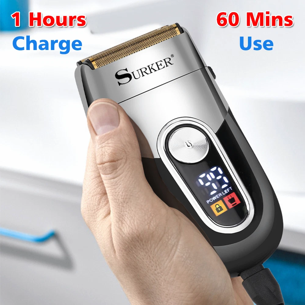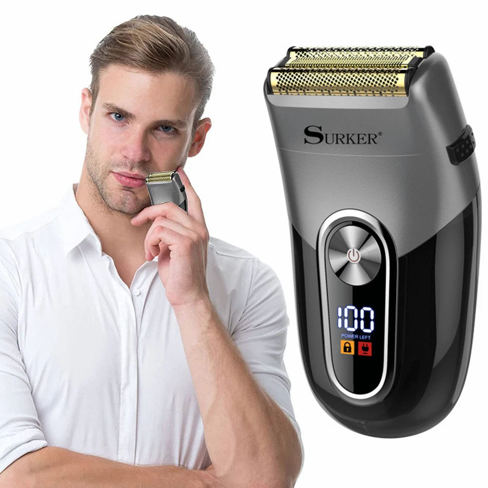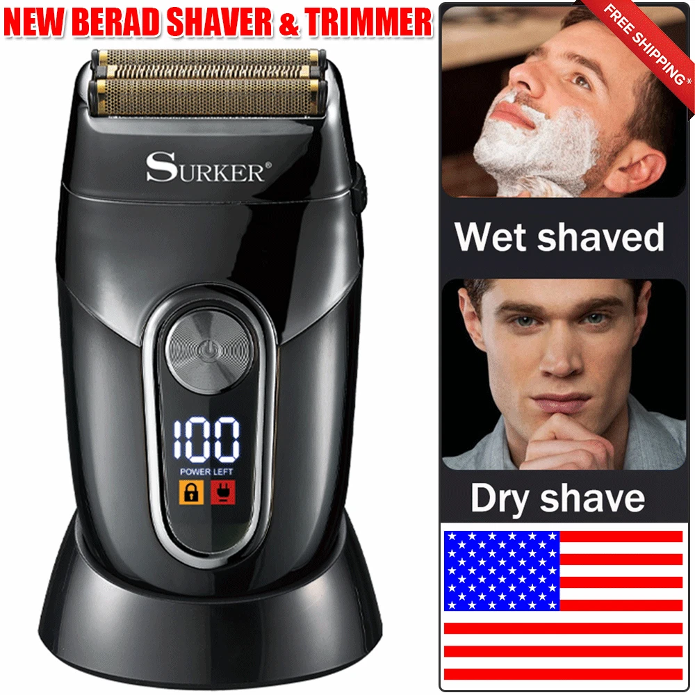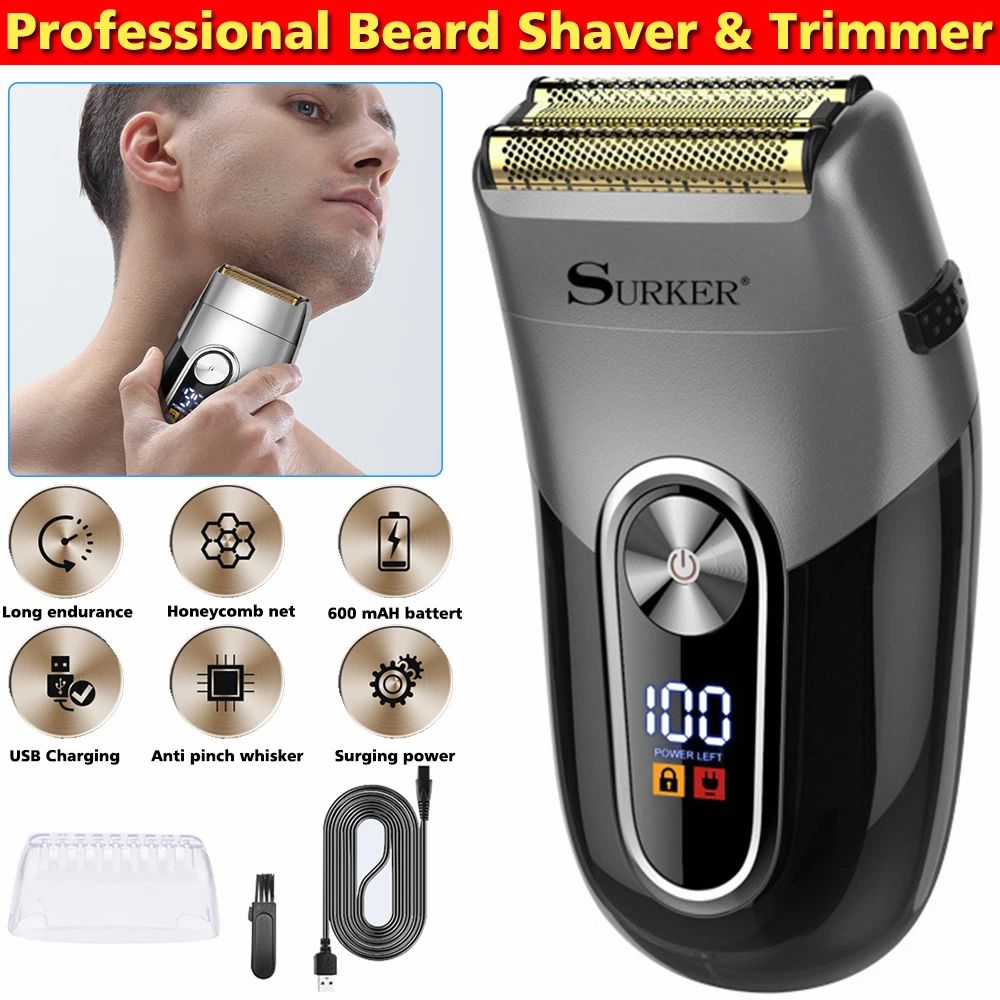 Specifications: Best for hair, beard, stubble, shaved head bump free shaving and super close shaving clean up hair and neck lines for smooth finish cord/cordless shaver shaper a great tool for an extra-close shave on the neck,face and all around the hairline 100-240V voltage,50/60Hz Cord/cordless work powerful and quiet rotary motor gold titanium hypoallergenic foil for irritation-free shaving 2 blade cutting shaving system 600mAh Lithium-ion battery LCD display, charging reminder, battery power percentage reminder contains travel lock function, press and hold the switch for 3 seconds, the machine will be locked, if unlocked, do the same operation USB Line charger model Package Included: 1* T rimmer 1* Protective cover 1* C harger 1* Cleaning brush 1* Manual INSTRUCTIONS FOR USE : 1. Men whose skin is sensitive or easily irritated by shaving, or who suffer from a skin allergy, should test one section on the leg or arm before using the shaver. 2. Remove the protective cover and turn on the unit to start shaving. Hold the shaver at a right angle to the area of your face that you want to shave and run the single shaving foil carefully along your skin. Tip: In general, we recommend that you shave against the direction of hair growth, as this is the best way to trim the hair. Pull your skin tight, with your fingers in inaccessible areas, to achieve optimum results. 3. Do not push the shaver on the skin too hard as it could cause irritation, make the shaver warm and prevent a perfect shave. 4. Please note that it takes 2 to 4 weeks for your skin to adapt to a shaver, so please do not change shaving instruments in this period of time. 5. If hair is longer than 1/32” begin by cutting the hair down first with a trimmer, then use shaver for a smooth close finish.