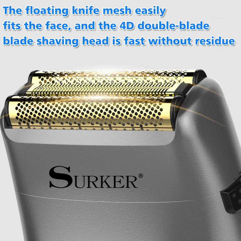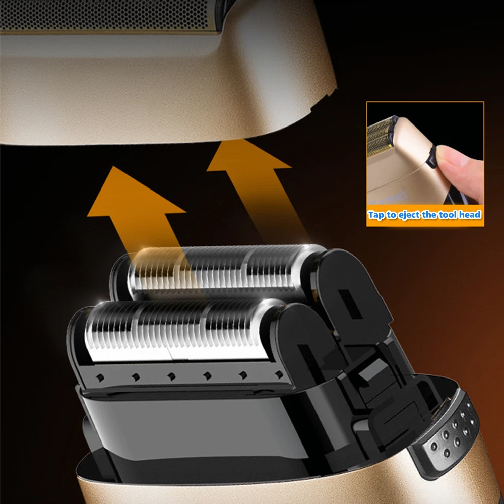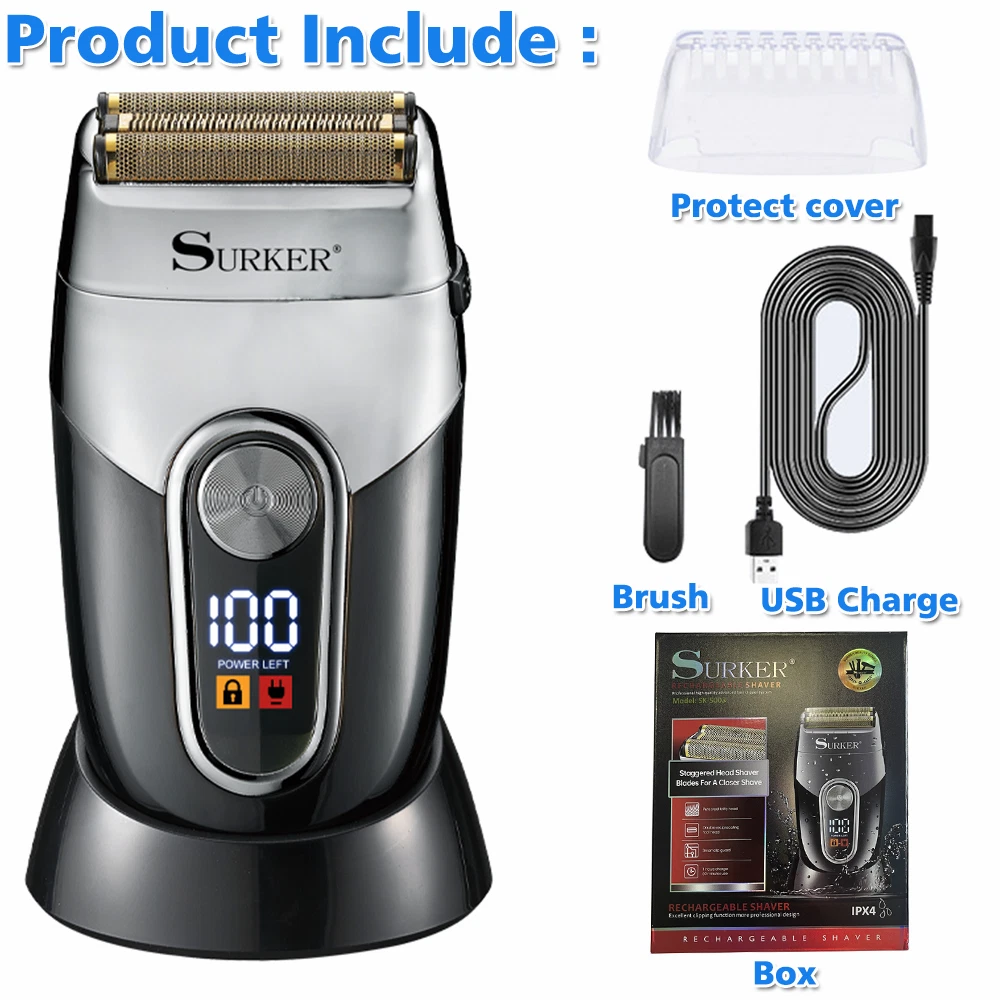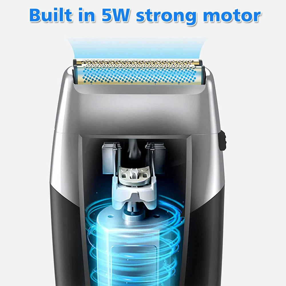 Specifications: Best for hair, beard, stubble, shaved head bump free shaving and super close shaving clean up hair and neck lines for smooth finish cord/cordless shaver shaper a great tool for an extra-close shave on the neck,face and all around the hairline 100-240V voltage,50/60Hz Cord/cordless work powerful and quiet rotary motor gold titanium hypoallergenic foil for irritation-free shaving 2 blade cutting shaving system 600mAh Lithium-ion battery LCD display, charging reminder, battery power percentage reminder contains travel lock function, press and hold the switch for 3 seconds, the machine will be locked, if unlocked, do the same operation USB Line charger model Package Included: 1* T rimmer 1* Protective cover 1* C harger 1* Cleaning brush 1* Manual INSTRUCTIONS FOR USE : 1. Men whose skin is sensitive or easily irritated by shaving, or who suffer from a skin allergy, should test one section on the leg or arm before using the shaver. 2. Remove the protective cover and turn on the unit to start shaving. Hold the shaver at a right angle to the area of your face that you want to shave and run the single shaving foil carefully along your skin. Tip: In general, we recommend that you shave against the direction of hair growth, as this is the best way to trim the hair. Pull your skin tight, with your fingers in inaccessible areas, to achieve optimum results. 3. Do not push the shaver on the skin too hard as it could cause irritation, make the shaver warm and prevent a perfect shave. 4. Please note that it takes 2 to 4 weeks for your skin to adapt to a shaver, so please do not change shaving instruments in this period of time. 5. If hair is longer than 1/32” begin by cutting the hair down first with a trimmer, then use shaver for a smooth close finish.