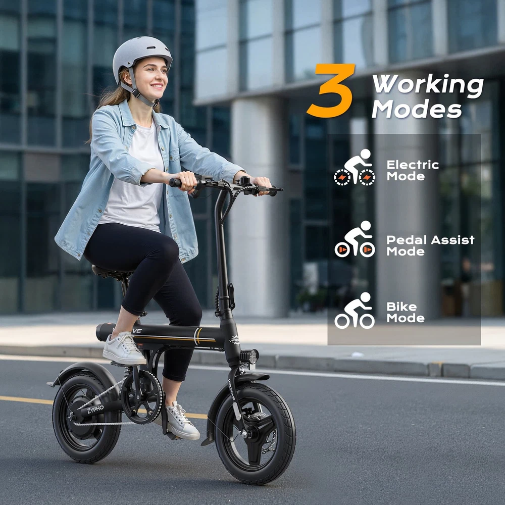 【 Electric Bike】- 14" Foldable E-Bike for Adults & Teens, 500W Peak Motor, 36V 7.8Ah Battery, 20MPH Max Speed 🔋【Powerful 350W Motor & Long-Lasting Battery】 Equipped with a robust 350W brushed motor (500W peak), this e-bike delivers a max speed of 20MPH and climbs slopes up to 15°. The 36V 7.8Ah lithium battery supports 22–50 miles per charge and recharges in just 4–6 hours with built-in BMS protection for safety and battery longevity. 🚴【3 Riding Modes & Smart LCD Display】 Switch between Pure Electric, Pedal Assist, and Classic Bike modes to match your riding needs. The intuitive LCD display shows speed, battery level, and distance, while the twist throttle and key-secure start offer effortless control and anti-theft protection. ⚙️【Safe & Stable Riding Experience】 Features front and rear dual-disc brakes for reliable stopping power, a high-brightness headlight for night visibility, and a shock absorber for a smoother ride on urban roads. Suitable for riders between 4'3" to 5'6". 🛡️【Portable & Lightweight Design】 Weighing only 49.6 lbs with a quick-fold mechanism, this e-bike is easy to carry and store. Its compact 14" frame and 1.95" tires make it ideal for commuting, while the 220 lbs load capacity ensures durability for most riders. 💡【Ideal for Teens & Adults】 Designed for urban commuters and teens, the combines functionality, safety, and style. It’s a practical, eco-friendly transportation solution that promises fun and convenience every time you ride. Package include: 1*User Manual, 1*Charger, 1*Electric bike, 1*Tool Kit 1*Mobile phone stand 1*Car lock 1*Air pump Note: Our products have been certified under UL2849 safety standards. The item is UL 2849 certified with a link to the UL Product iQ