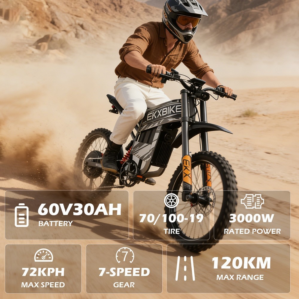 🚴 Peak 6000W Motor & 45MPH Top Speed : This fast electric bike is equipped with a 3000W brushless permanent magnet motor (6000W peak power) that delivers non-stop strong torque—easily tackling slopes up to 40° with stable climbing performance. Its max speed hits 45MPH to slash travel time, while the motor’s heat-dissipating alloy casing prevents overheating even during long hours of high-power use. 🚴 60V 30Ah Large-Capacity Battery & 3A Fast Charging : The 60V 30Ah high-density lithium-ion battery offers 45 miles of pure electric range.Paired with a 3A high-efficiency fast charger, it fully recharges in just 10-12 hours. Plus, the battery has built-in overcharge, over-discharge, and short-circuit protection to extend its service life, so you get reliable power for years. 🚴 NFC/Password Unlock & Large Color LCD Display : Ditch bulky keys! Unlock your e-bike in 1 second via an NFC card or 4-digit password—perfect for busy mornings or sharing the bike with family (no more fumbling with extra keys). The bright 4-inch color LCD display shows speed, battery level, riding mode, mileage, and time at a glance—clear even in direct sunlight. No more guessing battery life; stay informed to plan every ride with confidence. 🚴 Hydraulic Disc Brakes & Versatile Riding Fun : Safety meets flexibility! Hydraulic disc brakes provide 30% shorter braking distance than mechanical brakes, plus stable stopping force—even at 45MPH, you can slow down or stop safely. It also comes with a professional 7-level shifting system: low gears boost climbing power, while high gears enhance speed on flat roads, adapting seamlessly to complex road conditions. 🚴 Full Suspension & 70/100-19 Off-Road Tire : The features 70/100-19 off-road tires, known for their large-tooth tread design that provides excellent grip and stability in complex terrain. These all-season tires offer superior off-road and anti-skid performance, making them ideal for diverse climatic conditions and ensuring safety on slippery or muddy roads. These all-season tires offer superior off-road and anti-skid performance, making them ideal for diverse climatic conditions and ensuring safety on slippery or muddy roads. 🚴 Please be advised: The electric dirt bike accommodates riders ranging from 5 feet 6 inches to 6 feet 4 inches tall (167-193cm), featuring a seat elevation of 83cm (32.67 inches) from the surface. Should you have any inquiries or concerns, please feel free to reach out to us promptly through eBay Messages for a swift response! 🚴Features & Accessories: Adult e-bikes are 85% pre-assembled, reducing the need for complex assembly. It is certified to UL 2849 Label On Frame And Battery.Safety-backed by UL2849 & GCC certifications. Enjoy 1-year warranty, 24/7 support. If you encounter any problems please contact us and we will solve the problem for you. Please keep the original packaging for 30 days after you receive your bike. Basic Feature : Expanded size: 174cm*97cm*65cm(68.5"*38.2"*25.6") Actual weight: About 60kg Frame material: Steel Front fork: Hydraulic Front fork Braking system: Front and rear hydraulic brakes Transmission system: Rear drive Tire size: 70/100-19 Off-road Tyres Applicable height: 160-195cm(63"-76.8") Display: LCD Maximum speed ≤ 70km/h (45MPH) Endurance 80-120km (50mile-75mile) Slope <35° Waterproof grade: IP67 Load weight ≤150kg(330LBS) Motor parameters: 60v 3000w Brushless Motor Charging Output power 3A Charging time 4-8H Battery type: 60V 30AH lithium battery Undervoltage protection: 60V Overcurrent protection: 80A Packing list: 1x Electric bicycle 1x Battery 1x Charger 2x Pedal Our products have been certified under UL2849 safety standards.