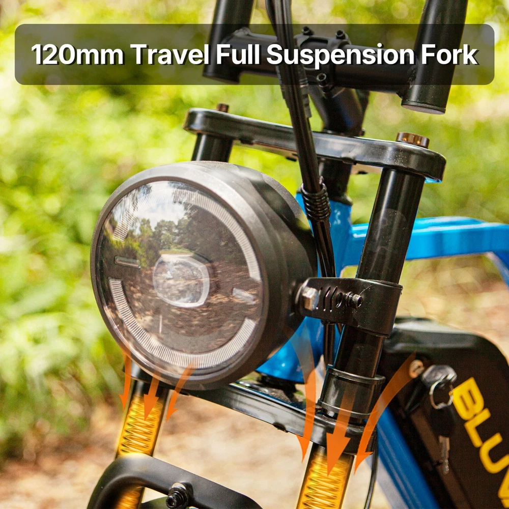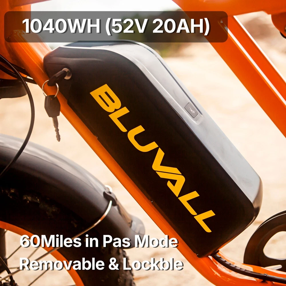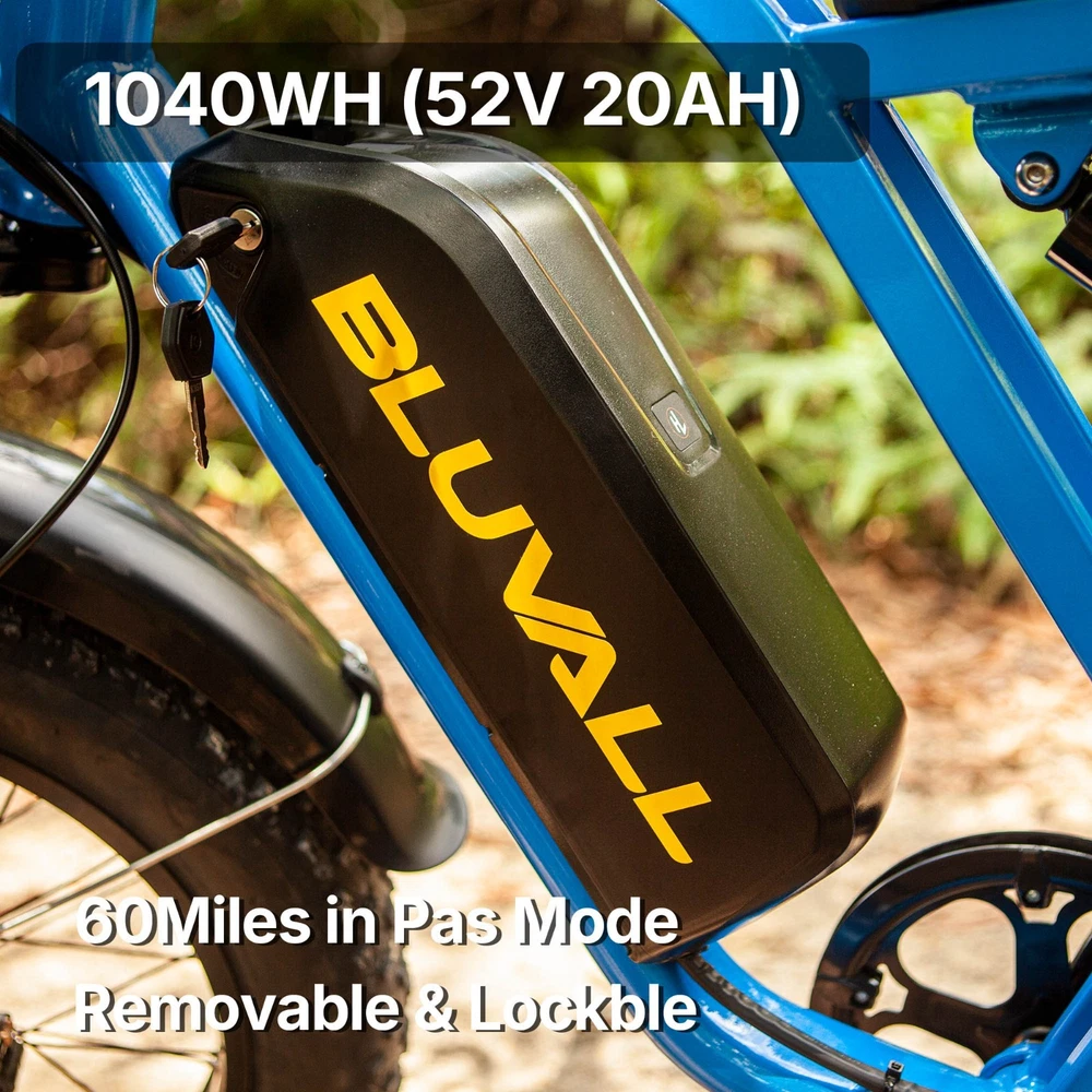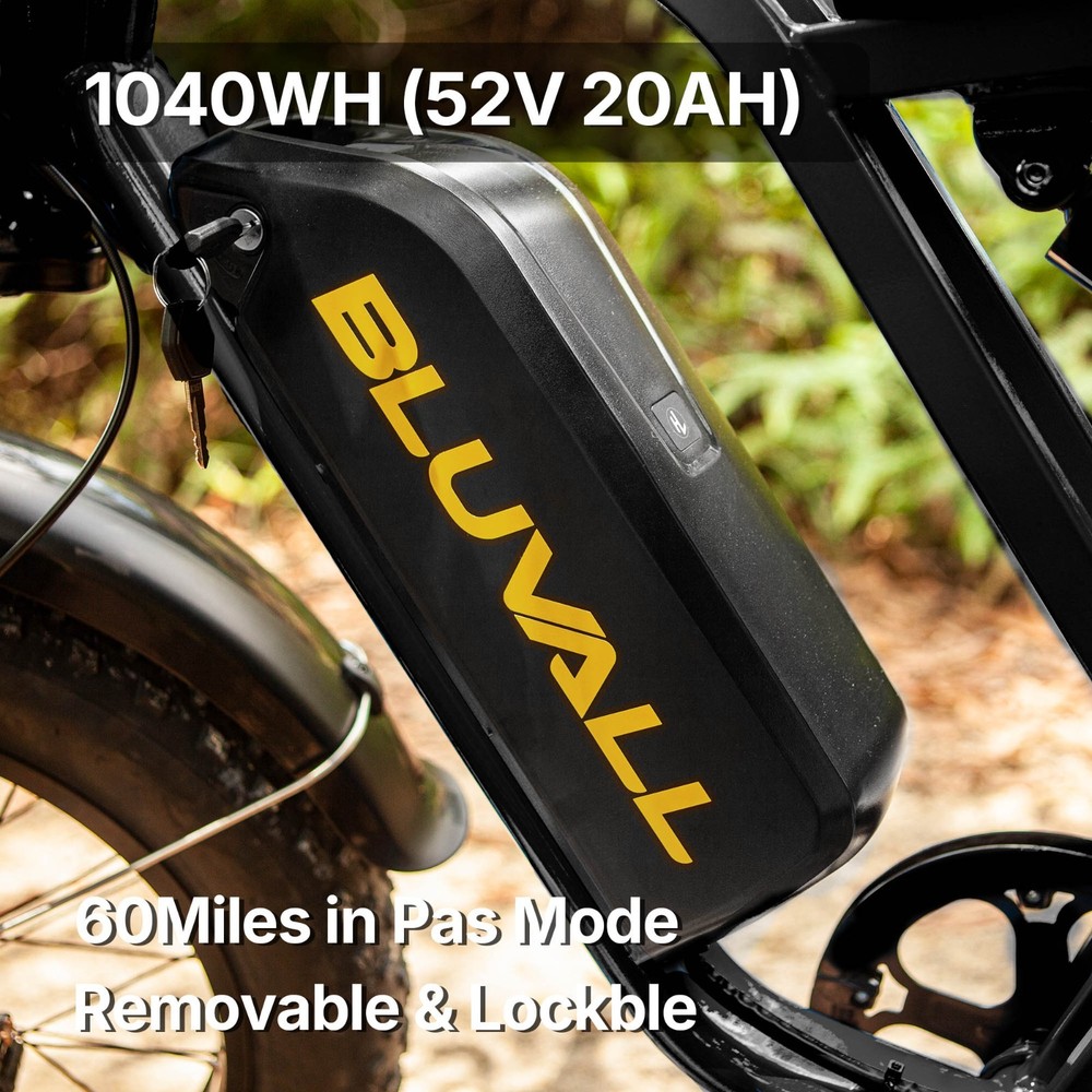 Why BLUVALL? The e-bike is designed for convenience in both commuting and adventure, featuring a speed of 35MPH and a long range of 60 miles,Barely any maintanence. E-SYSTEM Class Class 1/2/3 (Switchable) Motor Rear Geared Hub Brushless Motor, Rated 1000W (1500W Peak) Motor Torque 105Nm Controller 52V 28A Peak Battery Removable BMS Lithium-ion battery, 52V 20Ah, 1040Wh Certification UL 2849 & UL 2271 Certified (Entire e-bike system and battery are certified) Charger 58.8V 3 Amp, Aviation Connector Charge Time 5~8 Hours Max Speed 35MPH Max Range Up to 60 miles by pedal assist, 40+ miles by throttle (based on 70kg rider; varies with conditions) FEATURES Display Backlit LCD Multifunctional Display USB Port Display-Integrated USB Charging Port to charge your phone on the go Lights Integrated 100Lux Headlight & Rear Light with Turn Signals Riding Modes 3 Distinct Riding Modes, 5 Levels of Pedal Assist Pedal Assist 5 Levels, Cadence Sensor Speed Configuration Unlock the speed limit to 31MPH, or set the speed limit to a desired safe velocity. Water Resistance IPX6 Rating (Protects against powerful water jets from any direction) COMPONENTS Frame High-Strength Carbon Steel Suspension Full Suspension Front Fork Dual Crown Suspension Fork (120mm Travel) with lock-out and rebound adjustability for pro-level control and handling. Rear Shock Heavy-Duty Rear Shock (210mm x 800lb) engineered to support heavy payloads and absorb major impacts for a stable, planted ride. Brake Front & Rear Hydraulic Disc Brakes Brake Rotor 180mm, 1.9mm thick Throttle Twist Throttle, Ergonomic Right-Hand Throttle Shifter Shimano, 7-Speed Freewheel 7-Speed Rear Derailleur Shimano, Long Cage Crank & Chainring 48T, 170mm Alloy Crank Handlebar Aluminum Ø31.8mm, Width 710mm Grips Nylon Lock-on Seatpost Forged Alloy, Ø30.4 x 350mm Stem Bar bore Ø31.8mm, Clamp I.D. Ø28.6mm, Height 40mm, Rise 0° Rim Material Aluminum Rim Size 20 x 3.0 Rim Type Wheel with Integral Hub Tire Fat Tires, 20″ x 4.0″ Saddle Extended Two-Passenger Saddle, crafted from durable PU leather to comfortably share the ride Pedal 1 Pairs Alloy Platform Pedals Kickstand Side Kickstand Fenders Full-Coverage Front & Rear Fenders Included Phone Holder Included DIMENSIONS & WEIGHT Net Weight 36 kg (79.4 lbs) Gross Weight 45.6 kg (100.5 lbs) Battery Weight 4.2 kg (9.3 lbs) Payload Capacity 150 kg (330 lbs) Recommended Rider Height 5'1"–6'1" (155cm ~185cm) Product Size 172 x 113 x 75 cm Packing Size 145 x 32 x 80 cm 【Powerful Brushless Motor】 Equipped with rated 1000W (Peak 1500W) high-speed hub motor offers enhanced climbing ability to slope 35°, reaching speeds of up to 31mph . You can get excellent riding experience in most road conditions 【 Removable 1040WH BMS Battery 】 Equipped with The detachable 52V 20AH battery offers a long riding range of 40-60 miles in pedal assist mode, sufficient for adventures or most commutes. Two charging methods are available: charging the battery in the bike or removing the battery for charging 【 Full Suspension & 20"x4" Fat Tires 】 Equipped with front suspension fork and rear shock, which greatly reduces bumps during riding. 20 x 4.0'' fat tires also provide great grip and excellent shock absorption, and effectively increase riding stability. This full suspension ebike offers the most comfortable riding in all terrain such as snow, beach, mountain, gravel roads, helps you conquer most road conditions 【 Shimano 7 Speed Gears & Hydraulic Brakes 】 Equipped with professional 7-speed gears and dual hydraulic disc brakes, you can effortlessly shift gears and stop, giving you full control over your riding experience. Choose from 3 working modes - pure electric, pedal-assist, or pure pedal - to suit your preferences and make every ride tailored to your needs 【Multiple Riding Modes】 Choose from pure electric, pedal-assist, or manual cycling modes, each with 5 assistance levels. The 7-speed gear system offers smooth shifting, making this bike perfect for both casual rides and more demanding off-road adventures. 【 Durable and Stylish Frame 】 Equipped with a strong carbon steel frame supporting up to 330 lbs and suitable for riders from 5'1" to 6'1", this electric bike is designed for both comfort and durability. The modern M5 color display adds a premium touch, giving you a stylish and functional bike for any occasion. 【 LCD Display 】Equipped with the modern M5 color display, which provides real-time metrics, including speed, mileage, PAS level, and battery status, adds a premium touch, giving you a stylish and functional bike for any occasion. 【 High-Visibility Front & Rear Lights 】Equiped with an ultra-bright LED headlight and integrated taillights, delivering enhanced visibility and safety, making the rider easily noticeable from all angles, ideal for the dark environments. 【Easy to Assemble】 This e-bike comes 85% pre-assembled. Assembly video will be provided. 【1-Year Warranty】 If there is any problem, pls contact us, we’ll reply your message within 24 hours. We provide lifetime technical support, and committed to providing professional warranty after-sales service for every electric bicycle. Pls keep the original bike box for 30 days for possible return The item is UL 2849 certified with a link to the UL Product iQ https://productiq.ulprospector.com/en