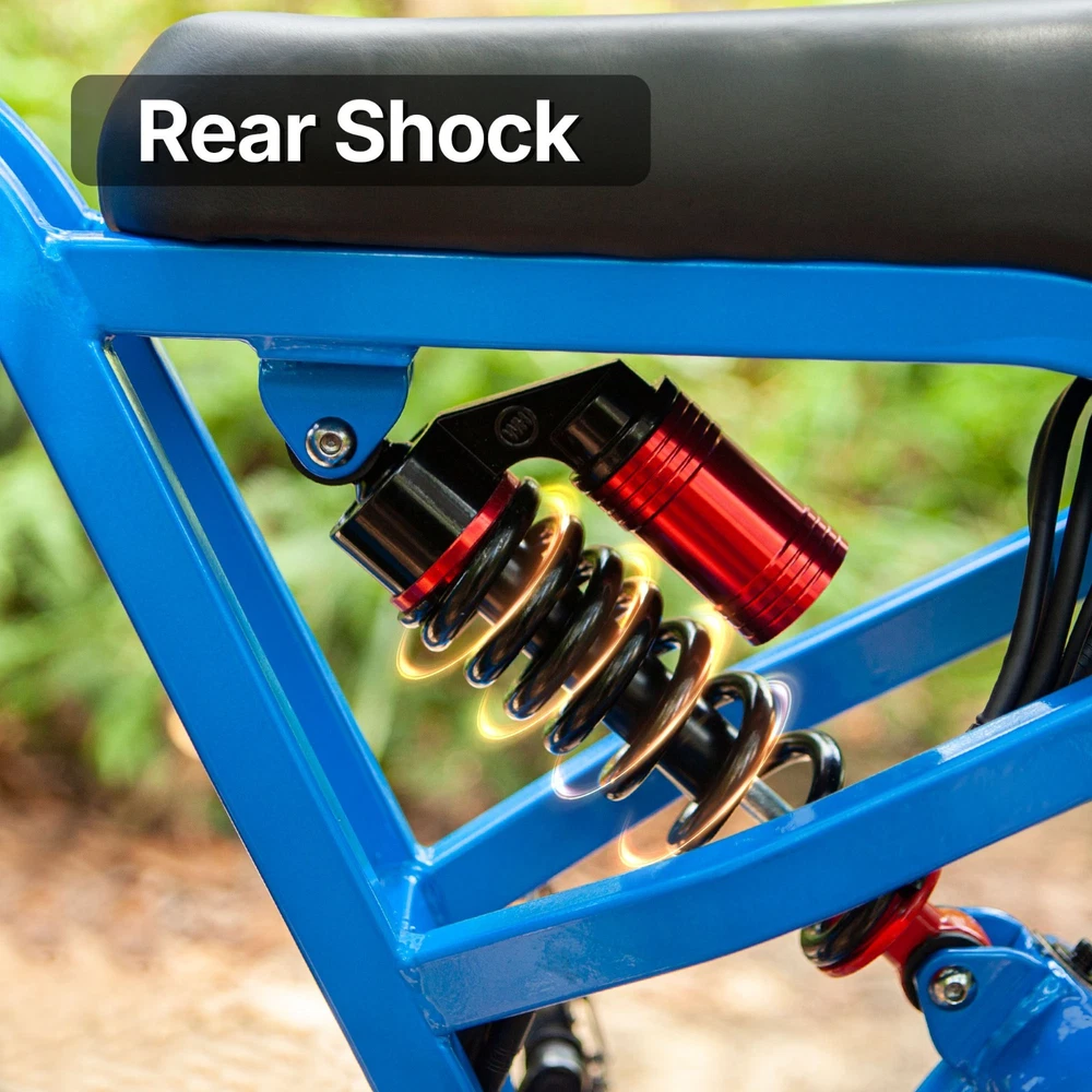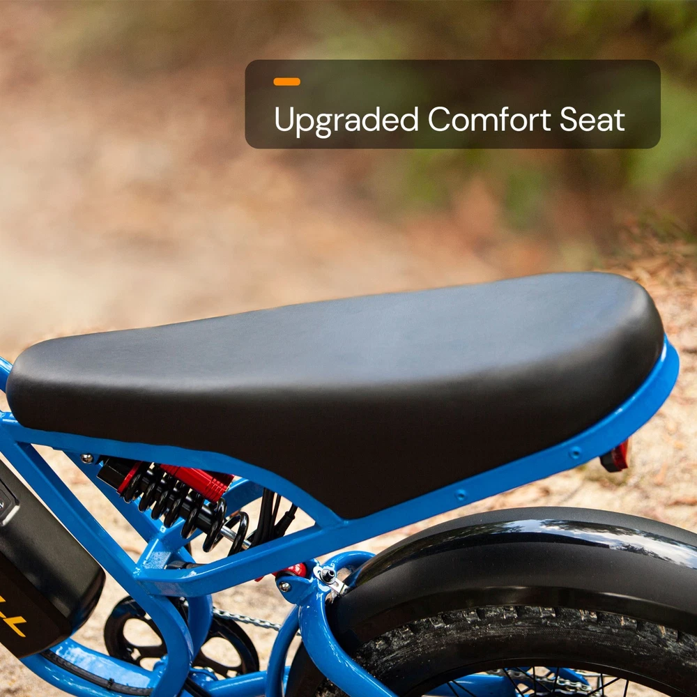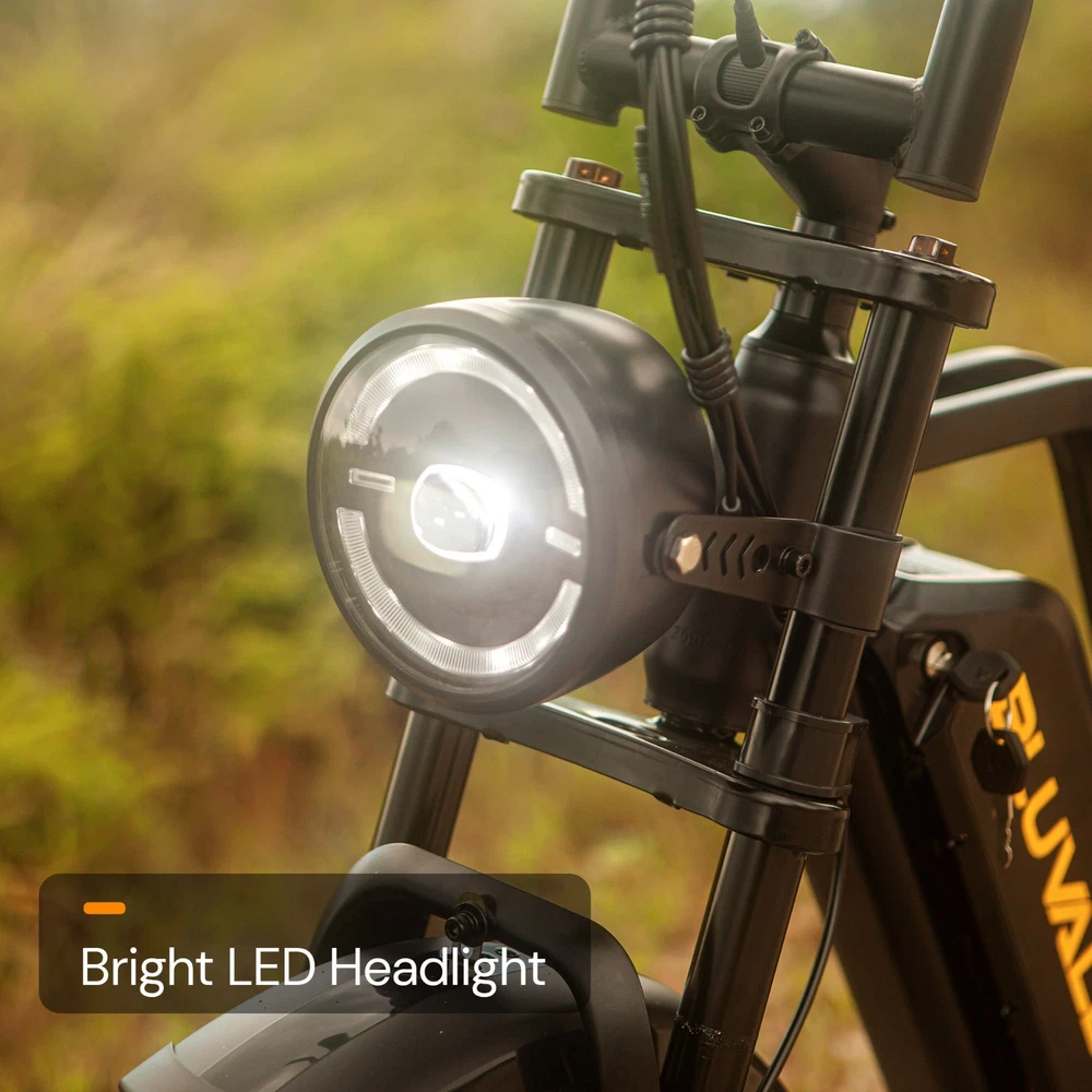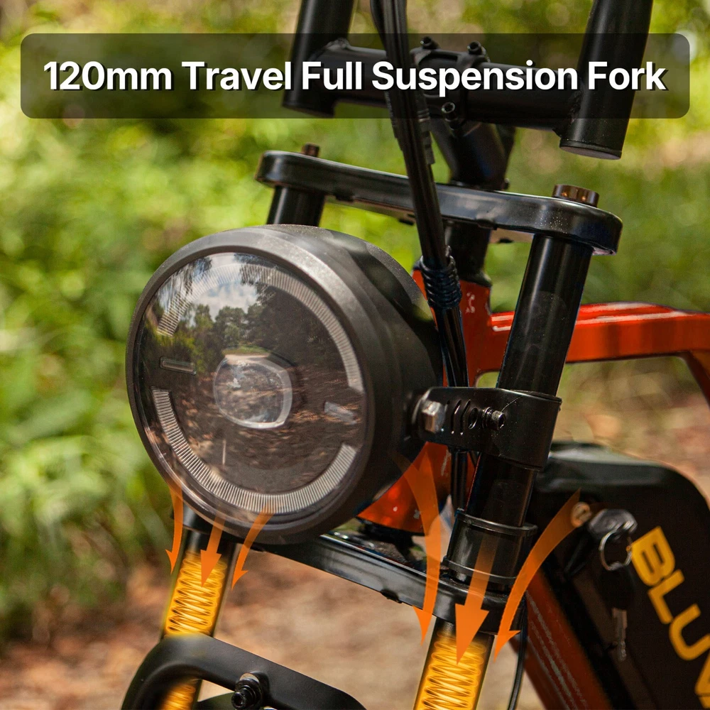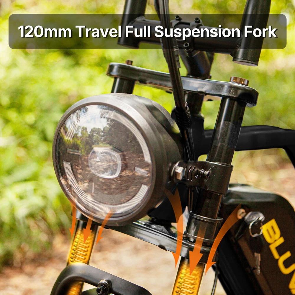Why BLUVALL? The e-bike is designed for convenience in both commuting and adventure, featuring a speed of 35MPH and a long range of 60 miles,Barely any maintanence. E-SYSTEM Class Class 1/2/3 (Switchable) Motor Rear Geared Hub Brushless Motor, Rated 1000W (1500W Peak) Motor Torque 105Nm Controller 52V 28A Peak Battery Removable BMS Lithium-ion battery, 52V 20Ah, 1040Wh Certification UL 2849 & UL 2271 Certified (Entire e-bike system and battery are certified) Charger 58.8V 3 Amp, Aviation Connector Charge Time 5~8 Hours Max Speed 35MPH Max Range Up to 60 miles by pedal assist, 40+ miles by throttle (based on 70kg rider; varies with conditions) FEATURES Display Backlit LCD Multifunctional Display USB Port Display-Integrated USB Charging Port to charge your phone on the go Lights Integrated 100Lux Headlight & Rear Light with Turn Signals Riding Modes 3 Distinct Riding Modes, 5 Levels of Pedal Assist Pedal Assist 5 Levels, Cadence Sensor Speed Configuration Unlock the speed limit to 31MPH, or set the speed limit to a desired safe velocity. Water Resistance IPX6 Rating (Protects against powerful water jets from any direction) COMPONENTS Frame High-Strength Carbon Steel Suspension Full Suspension Front Fork Dual Crown Suspension Fork (120mm Travel) with lock-out and rebound adjustability for pro-level control and handling. Rear Shock Heavy-Duty Rear Shock (210mm x 800lb) engineered to support heavy payloads and absorb major impacts for a stable, planted ride. Brake Front & Rear Hydraulic Disc Brakes Brake Rotor 180mm, 1.9mm thick Throttle Twist Throttle, Ergonomic Right-Hand Throttle Shifter Shimano, 7-Speed Freewheel 7-Speed Rear Derailleur Shimano, Long Cage Crank & Chainring 48T, 170mm Alloy Crank Handlebar Aluminum Ø31.8mm, Width 710mm Grips Nylon Lock-on Seatpost Forged Alloy, Ø30.4 x 350mm Stem Bar bore Ø31.8mm, Clamp I.D. Ø28.6mm, Height 40mm, Rise 0° Rim Material Aluminum Rim Size 20 x 3.0 Rim Type Wheel with Integral Hub Tire Fat Tires, 20″ x 4.0″ Saddle Extended Two-Passenger Saddle, crafted from durable PU leather to comfortably share the ride Pedal 1 Pairs Alloy Platform Pedals Kickstand Side Kickstand Fenders Full-Coverage Front & Rear Fenders Included Phone Holder Included DIMENSIONS & WEIGHT Net Weight 36 kg (79.4 lbs) Gross Weight 45.6 kg (100.5 lbs) Battery Weight 4.2 kg (9.3 lbs) Payload Capacity 150 kg (330 lbs) Recommended Rider Height 5'1"–6'1" (155cm ~185cm) Product Size 172 x 113 x 75 cm Packing Size 145 x 32 x 80 cm 【Powerful Brushless Motor】 Equipped with rated 1000W (Peak 1500W) high-speed hub motor offers enhanced climbing ability to slope 35°, reaching speeds of up to 31mph . You can get excellent riding experience in most road conditions 【 Removable 1040WH BMS Battery 】 Equipped with The detachable 52V 20AH battery offers a long riding range of 40-60 miles in pedal assist mode, sufficient for adventures or most commutes. Two charging methods are available: charging the battery in the bike or removing the battery for charging 【 Full Suspension & 20"x4" Fat Tires 】 Equipped with front suspension fork and rear shock, which greatly reduces bumps during riding. 20 x 4.0'' fat tires also provide great grip and excellent shock absorption, and effectively increase riding stability. This full suspension ebike offers the most comfortable riding in all terrain such as snow, beach, mountain, gravel roads, helps you conquer most road conditions 【 Shimano 7 Speed Gears & Hydraulic Brakes 】 Equipped with professional 7-speed gears and dual hydraulic disc brakes, you can effortlessly shift gears and stop, giving you full control over your riding experience. Choose from 3 working modes - pure electric, pedal-assist, or pure pedal - to suit your preferences and make every ride tailored to your needs 【Multiple Riding Modes】 Choose from pure electric, pedal-assist, or manual cycling modes, each with 5 assistance levels. The 7-speed gear system offers smooth shifting, making this bike perfect for both casual rides and more demanding off-road adventures. 【 Durable and Stylish Frame 】 Equipped with a strong carbon steel frame supporting up to 330 lbs and suitable for riders from 5'1" to 6'1", this electric bike is designed for both comfort and durability. The modern M5 color display adds a premium touch, giving you a stylish and functional bike for any occasion. 【 LCD Display 】Equipped with the modern M5 color display, which provides real-time metrics, including speed, mileage, PAS level, and battery status, adds a premium touch, giving you a stylish and functional bike for any occasion. 【 High-Visibility Front & Rear Lights 】Equiped with an ultra-bright LED headlight and integrated taillights, delivering enhanced visibility and safety, making the rider easily noticeable from all angles, ideal for the dark environments. 【Easy to Assemble】 This e-bike comes 85% pre-assembled. Assembly video will be provided. 【1-Year Warranty】 If there is any problem, pls contact us, we’ll reply your message within 24 hours. We provide lifetime technical support, and committed to providing professional warranty after-sales service for every electric bicycle. Pls keep the original bike box for 30 days for possible return The item is UL 2849 certified with a link to the UL Product iQ https://productiq.ulprospector.com/en