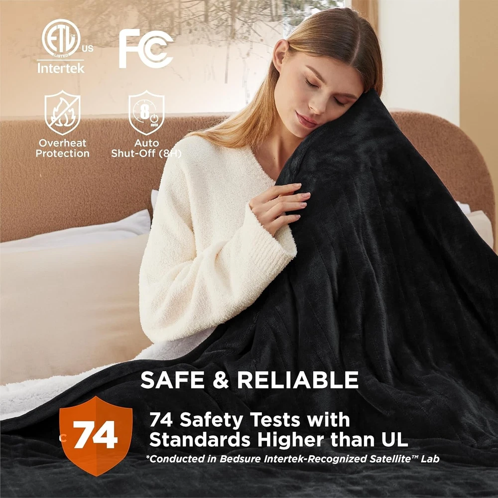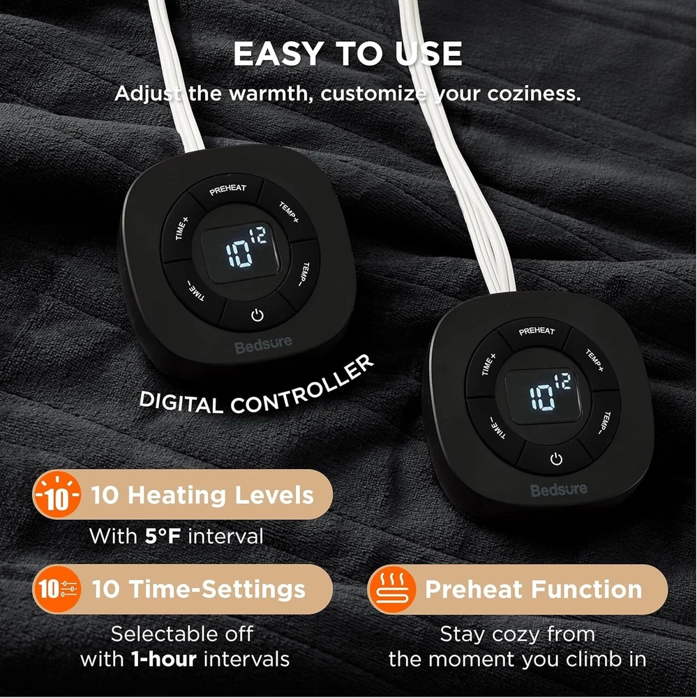 Electric Blanket King Size - Dual Control Heated Blanket Queen, Fast Heating with 10 Time Settings & 10 Heat Settings, Warm Gift for Grandma 100x90 inches, Black 100% Polyester Softness & Enhanced Durability: The 220 GSM flannel top and the 200 GSM premium sherpa both provide an exceptionally soft touch on each side. Neat stitching ensures stronger seams and enhanced durability. It is machine washable and uses a unique dyeing technique to prevent fading Customizable Warmth: Featuring fast and consistent heating, this electric blanket offers 10 heating levels and 10 time-settings for customizable coziness. Powered by advanced heating wire technology, it can precisely control temperature, ensuring safer warmth Versatile: Enjoy the extra warmth you need with this heating blanket while watching a movie on the sofa, adding it to your bed for a good night’s sleep, or using it as a regular blanket Safer & More Reliable: Conducted in Intertek-Recognized Satellite Lab, 74 safety tests with standards surpassing UL ensure safer performance. This king size heated blanket is ETL and FCC certified, and its default 8-hour auto shut-off prevents it from overheating so that you can enjoy warmth with complete peace of mind Easy to Use: This king size electric blanket with dual control SATISFACTION GUARANTEEs comfort for thermally incompatible couples. Preheat function conforms to changes in body temperature, keeping you comfortable all night without feeling dry Giftable: This heated blanket king size adds a stylish touch to your decor. It is available in multiple colors and sizes, making it the perfect gift for special occasions Energy-Saving: Designed for standard 120V AC wall outlets at 60Hz, our electric blanket operates with dual 110W controllers, each consuming about one-thirtieth the energy of traditional heaters. Enjoy cozy warmth while saving on electricity costs