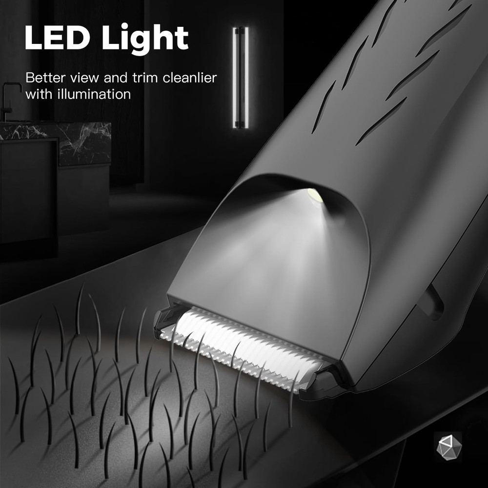 Electric Groin Hair Trimmer Showerproof Ball Trimmer for Men Waterproof Body Hair Groomer for Groin/Pubic/Back/Beard Cordless Gentle Shaver,Gift for Men SKIN-SAFE&ERGONOMICALLY DESIGN- Precision-engineered blade provides a smooth and effortless trim,this electric body trimmer is sharp yet gentle on the skin,reducing the risk of irritation during grooming,great shape fits comfortably,lightweight and easy to handle BUILT IN LED SPOTLIGHT&LOW NOISE- The light on the head makes this men pubic hair trimmer much easier to help see where you are trimming,without snagging or painful mistakes,minimal noise design,giving you a discreet and peaceful grooming experience,essential for grooming sensitive areas LONG LASTING BATTERY&LCD SCREEN-This body hair trimmer comes with a wireless charging pod,and lasts up to 90 mins running time after fully charge,allows for multiple grooming sessions before needing to be plugged in,LCD display indicates how much battery is left WATERPROOF&EASY TO CLEAN-This men groin hair trimmer easily rinses under running water or remove the head for cleaning,works well dry or in the shower,making the whole grooming process much more hassle-free DECENT TRIMMER AS A GIFT FOR HIM- Ideal present for any occasions like anniversary,Christmas,birthday,Father's day,and so on. A great addition to any man's hygiene kit