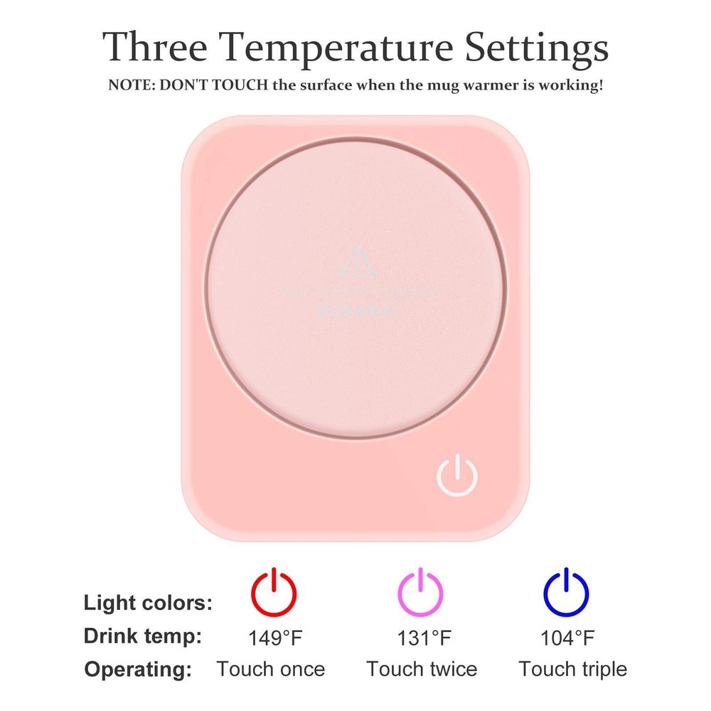 Adjustable Three-Temperature Setting: coffee warmer will keep your coffee at a perfect drinking temperature. You can control the temperature by tapping the button, keeping your coffee or milk up to 104℉-131℉-149℉ (40℃-55℃-65℃). Changing temperature is just a tap on of your finger. Automatic Shut-off & Smart Safety Feature: This smart cup warmer will shut off automatically after continually working 4 hours. No worry about forgetting to turn it off. The blinking red light indicator tells you the heating plate is hot and will stop until the temperature drops to 97℉ (36℃). Splash-proof & Large Heating Plate: The heating plate adopts sealed-insulation technology to prevent splashing water, which also fits most standard mugs well. The 59-inch plug cord will fits on your desk perfectly. Tips: Choose flat-bottom and thin-wall mug so that it can have a good connection to the warmer. Easy-to-Clean & Portable-to-Carry: The surface of the heating plate is easy to clean. The candle warmer is lightweight and will be a ideal choice for present on Birthday, Thanksgiving Day and Christmas and so on. Satisfactory Customer Service: Your satisfaction is our top priority. We will help you solve any problems in 24 hours. For more information on how to use the warmer, please scroll down to get a User Instruction.