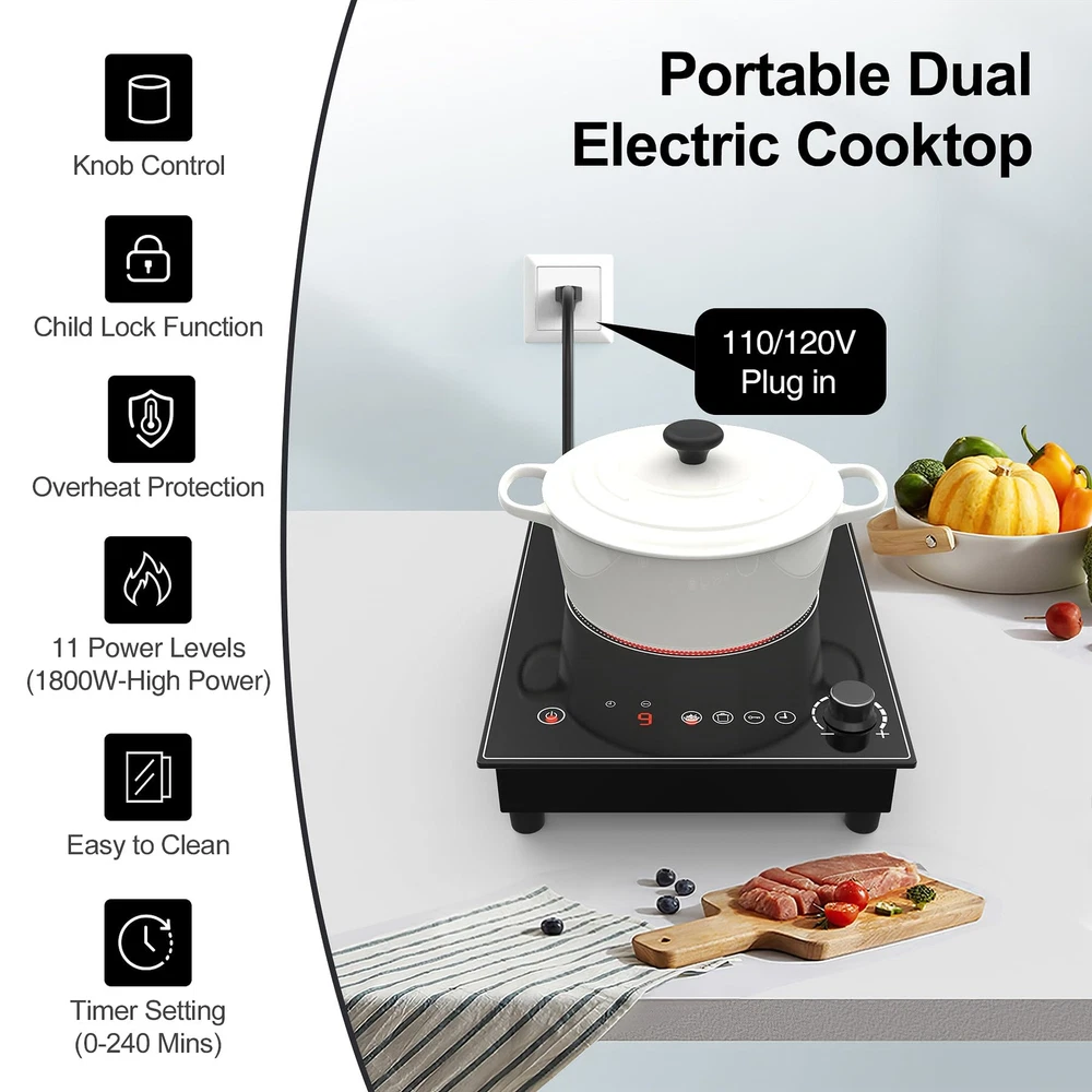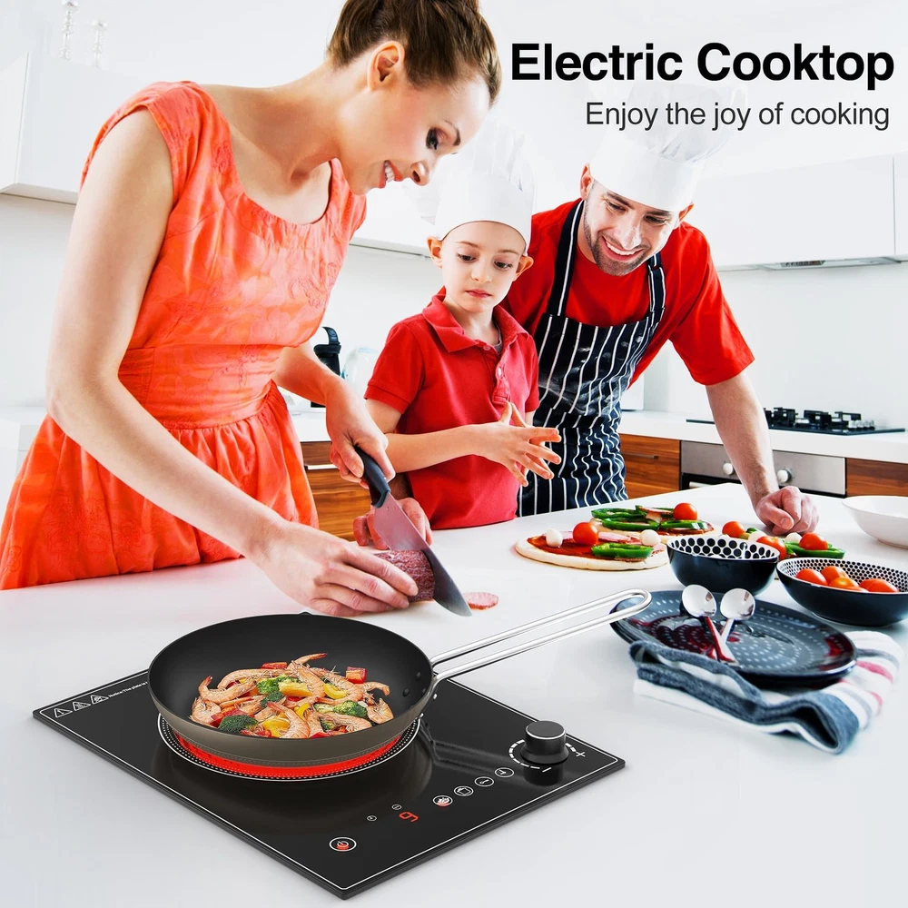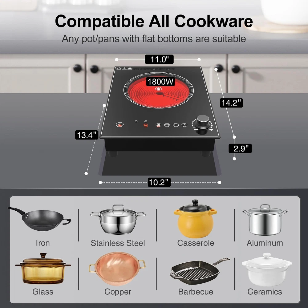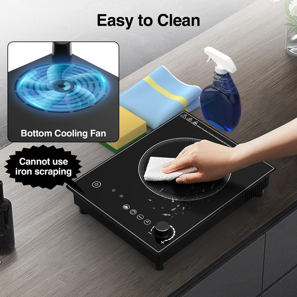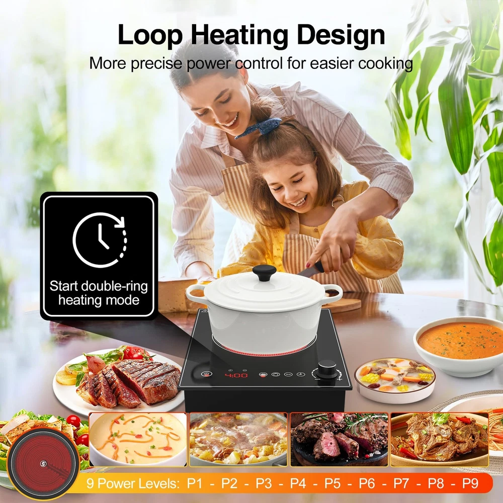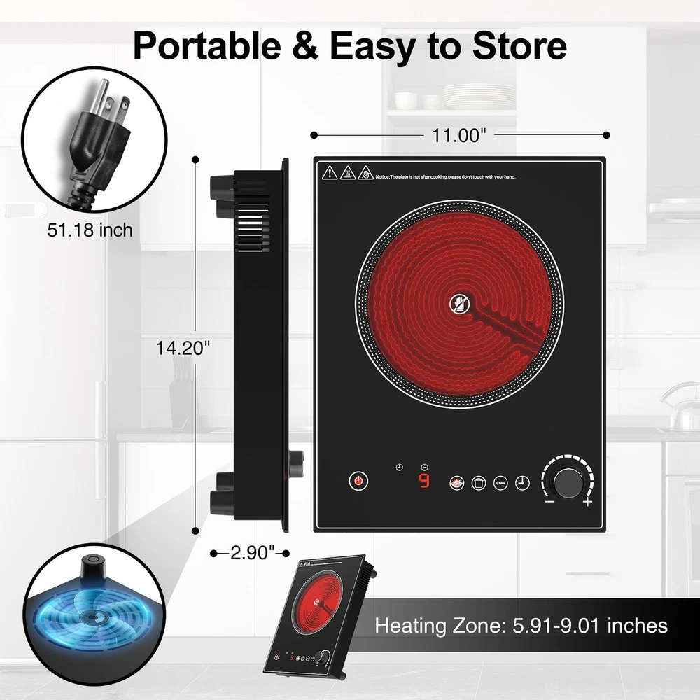 Portable Electric Cooktop: Wesonorous Electric stove uses the standard 110V~120V power socket of all households in North America. CE and FCC approved. It is light and compact, easy to carry and store. The portable Electric stove is very suitable for dormitories, family kitchens, RVs, boats Multi-function Ceramic Stove Electric Cooktop:Wesonorous Electric stove top 9 power levels to meet your different choice which is convenient for you to choose the right power to cook a variety of different foods, perfect for braise, fry, simmer, steaming, boil, stir-frying, roast. The heating effect of the electric ceramic cooktop is the same as that of the gas stove, and the food made is as delicious as the gas stove. LED Sensor Touch and knob Control:Wesonorous Electric burner The hot plate panel can be touch and knob slightly to adjust the temperature, power, cooking mode, set timer to 4 hours timer function. Electric burner The black crystal panel is scratch-resistant, wear-resistant, high temperature resistant and also easy to clean. Wide range of applications: Wesonorous single burner Electric Cooktop has multiple protection functions, such as overheating protection, residual heat indication, automatic power off, child safety lock, touch and knob control, the noise is less than 35 decibels, and the crystal surface can withstand high temperatures, making it more durable. . Suitable for All Types of Cookwares:Wesonorous Electric cooktop can be used with any type of cookware in your home, such as aluminium pans, copper pans, cast iron frying pans and non-magnetic stainless steel pans, please use flat-bottomed pots. Simply wipe with a clean cloth when cool. Please install according to the product manual and contact us at any time.