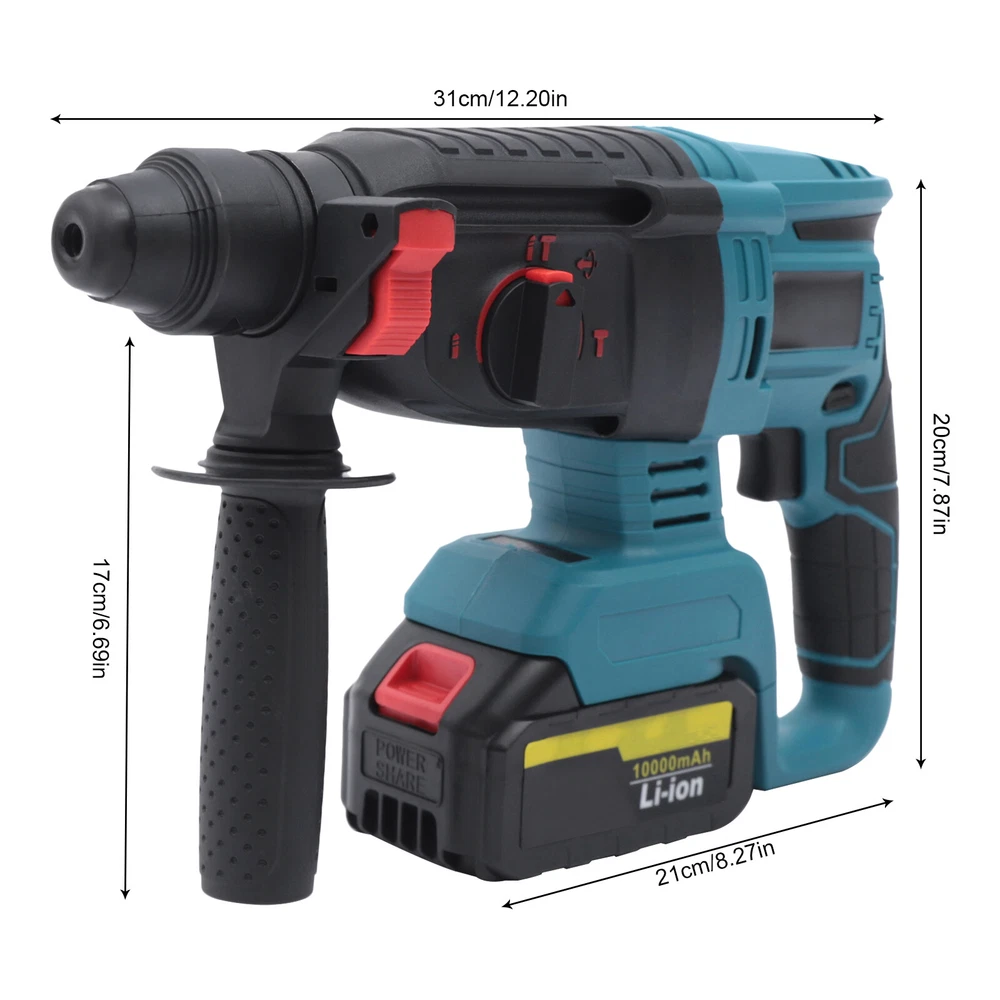 Detail Color: Blue Operation Method: Handheld Material: Nylon, Steel, Iron, Copper, Rubber, Aluminum Battery: 21v Motor Voltage: 21V Power: 850W Tahoma Frequency: 0-520rpm/min Unloaded Speed: 0-1100rpm/min Battery Capacity: 4.0AH Charging Time: 1.5h Gross Weight: 5.6kg/12.35lbs Power Source: Rechargeable Lithium Battery Portable Box Size: 42*34*13cm/16.54*13.39*5.12inch Body Size: 31*20cm/12.20*7.87inch Vice Handle Length: 17cm/6.69inch Power Supply Width: 8cm/3.15inch Bottom Length: 21cm/8.27inch Maximum Drill Diameter: 26mm/1.02inch Package Size: 42*34*10cm/16.54*13.39*3.94inch Package Included 1* Rotary Hammer 2* Batteries 1* Charger 1* Depth Gauge Electric Cordless Brushless Hammer Demolition Concrete Breaker Jack Hammer 850W Heavy Duty Rotary Hammer Drill, Safety Clutch 3 Functions with Vibration Control with Case Description Please choose a smooth tool for the work of your home improvement. No matter whether you are a professional worker or a DIY user, this electric rotary hammer of ours will be your ideal choice. It uses a pure copper brushless motor with high operating efficiency, and low noise and has a long service life. The steel chuck is durable and allows you to feel the strength of each hammer blow, making it easy to break the wall. Detail Color: Blue Operation Method: Handheld Material: Nylon, Steel, Iron, Copper, Rubber, Aluminum Battery: 21v Motor Voltage: 21V Power: 850W Tahoma Frequency: 0-520rpm/min Unloaded Speed: 0-1100rpm/min Battery Capacity: 4.0AH Charging Time: 1.5h Gross Weight: 5.6kg/12.35lbs Power Source: Rechargeable Lithium Battery Portable Box Size: 42*34*13cm/16.54*13.39*5.12inch Body Size: 31*20cm/12.20*7.87inch Vice Handle Length: 17cm/6.69inch Power Supply Width: 8cm/3.15inch Bottom Length: 21cm/8.27inch Maximum Drill Diameter: 26mm/1.02inch Package Size: 42*34*10cm/16.54*13.39*3.94inch Package Included 1* Rotary Hammer 2* Batteries 1* Charger 1* Depth Gauge Key Highlights Strong Power: The maximum power is 850W, and the speed is 520r/min, which can efficiently and easily carry out various crushing and drilling operations. Dust-proof System: The outer protection structure of the motor is complete, which can effectively prevent dust from entering the motor and ensure the smooth operation of the rotary hammer. Multi-function: You can switch between three functional modes of a hammer only (chiselling-only), hammer drill (hammering and rotation), and drill only (rotation only) by rotating the switch button to adapt to various working situations. High Efficiency Motor: This machine adopts a brushless motor with high power, without burning the machine, and has a long service life. And you don't need to replace the carbon brushes, which saves you time. Convenient Operation: The rotary hammer is powered by lithium batteries without wire restrictions, and with 2 replaceable lithium batteries, making the operation more convenient and fast. Flexible Speed Change: The rotary hammer's speed can be changed flexibly through the infinitely variable speed switch. The rotation speed changes with the pressing force, which is very convenient to use. Replaceable Drill Bits: The drill bit of the electric drill is removable and replaceable. This product can be adapted to drill bits within the 26mm/1.02inch diameter to meet your different needs. Easy to Store and Carry: The rotary hammer is equipped with a storage box, you can neatly store the machine in it after use. Moreover, it comes with a portable handle, which is easy to carry. Rotatable Sub-handle: The sub-handle is 360-degree rotatable, you can find a comfortable angle according to different working scenes and easily deal with various dead ends. It also has a shock-absorbing effect, making it more comfortable for you to use. Excellent After-sales Service: We aim to provide quality products and services. If you have any problems, please feel free to contact us, we will reply and solve the problem for you as soon as possible. Details Pure Copper Motor : It has a built-in high-precision copper core motor that has good conductivity, strong power, and high-temperature resistance for longer life. Durable Switch: The switch has been tested for durability and can be opened and closed repeatedly, with long service life. Nylon Casing: The rotary hammer adopts a high-strength nylon casing, which will not crack when dropped at normal height, so you can use it at ease. Anti-slip Handle : It is designed with two handles for more stable control of the electric drill. The anti-slip pattern on the handle allows for a more secure grip and safer operation. Large-capacity Lithium Battery: The rotary hammer adopts a lithium battery with a battery capacity of 4.0AH, which provides long-lasting battery life and guarantees your work. Forward and Reverse Adjustment Button: After the drill is blocked, you can push the reverse button to adjust the rotation direction of the rotary hammer, which can easily solve the problem of jamming. Steel Clamping Head : The clamping head is made of steel with high strength, which can hold the drill tightly and prevent it from falling off. Application This rotary hammer is suitable for professional or daily home users. And it is suitable for wood, masonry, concrete, brick, and metal. Notes Please note that this product does not include a drill bit, you can configure a drill bit with a diameter up to 26mm/1.02inch according to your needs. Please allow the slight color difference caused by the shooting light and 1-3 cm error due to manual measurement, and make sure you do not mind before ordering. Description Payment Delivery details Terms of sales About us Contact us Payment We accept ebay payment 。 Fees such as import duties, taxes are not included in the item price or shipping costs. These charges are the buyer's responsibility. Delivery details Shipping: 2-9 working days to: USA Terms of sales We maintain high standards of excellence and strive for hundred percent customer satisfaction. Feedback is very im