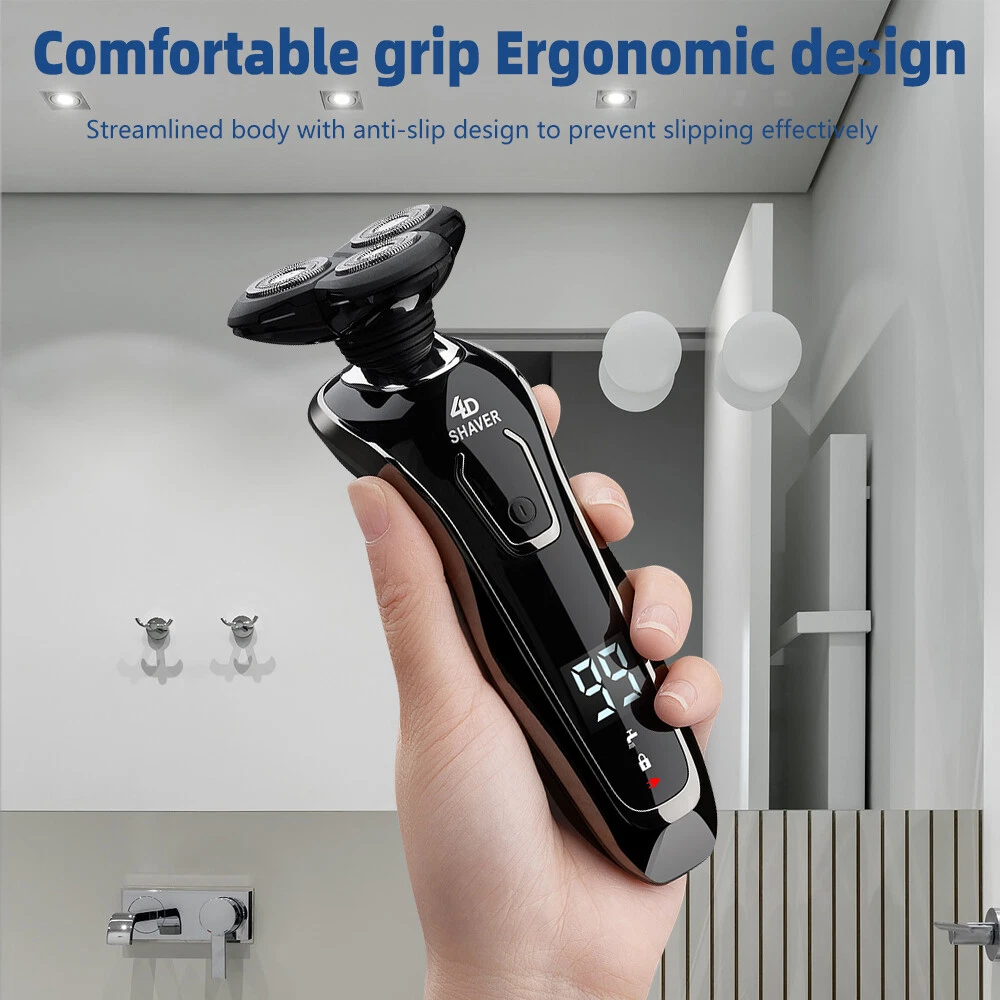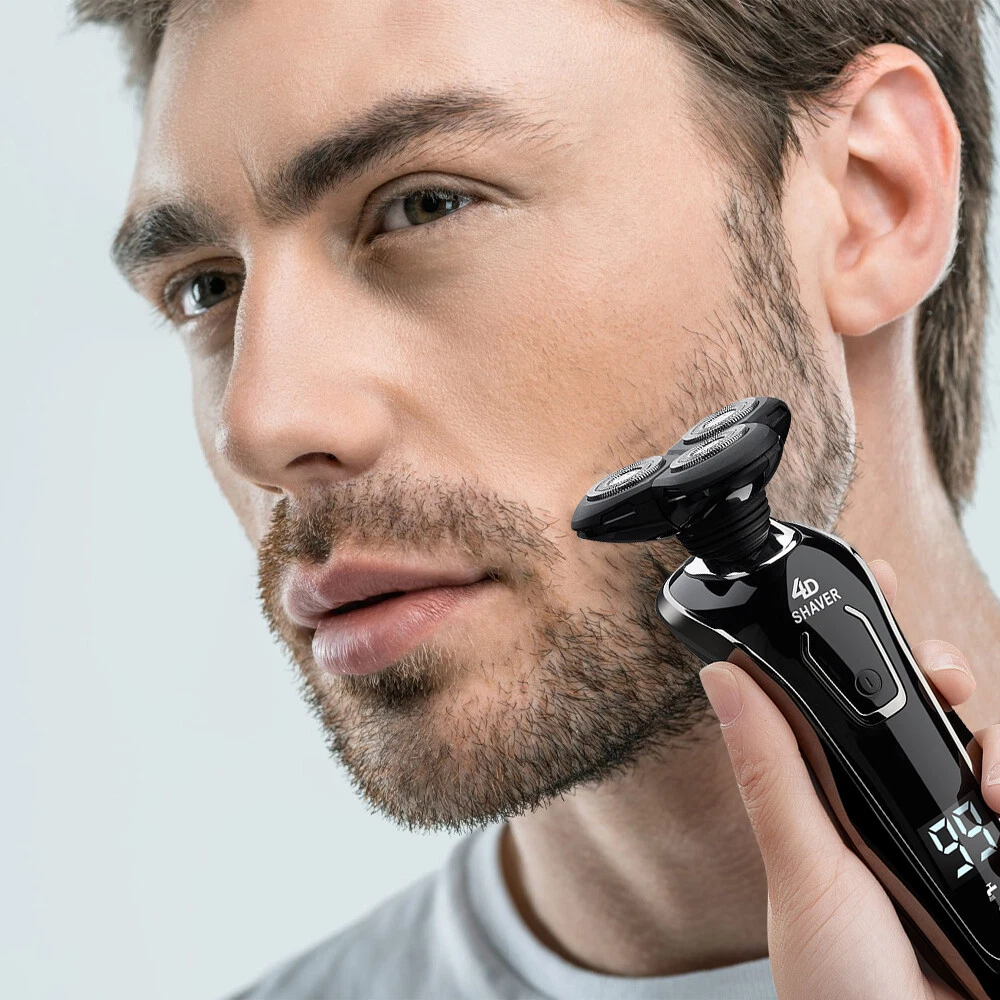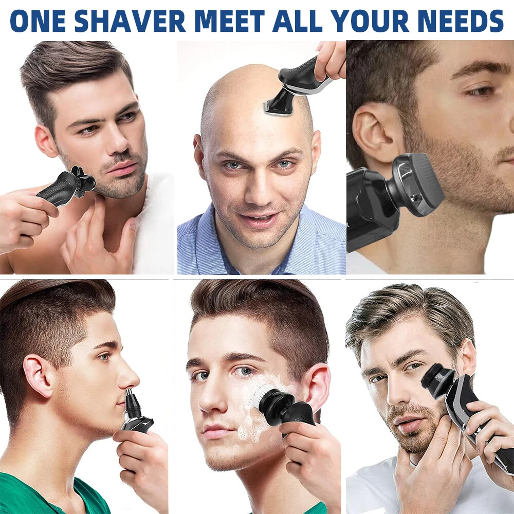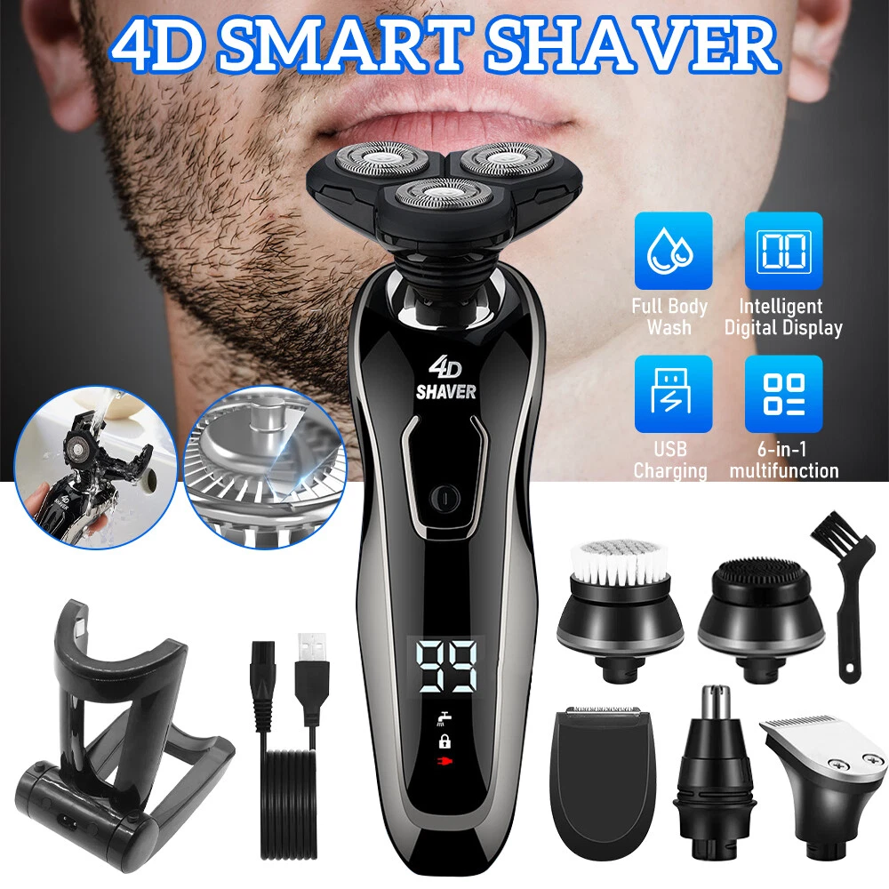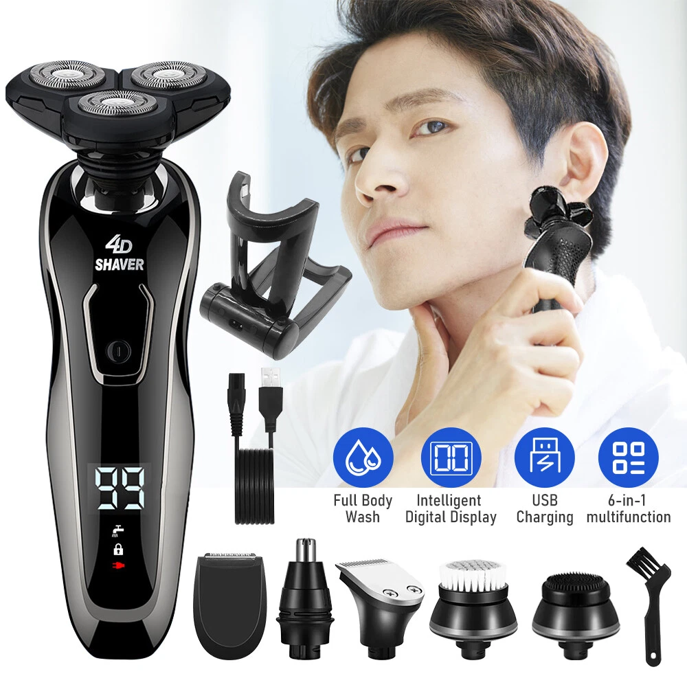 Fea t ures : -Low noise. -LCD display: shows the remaining time available -Suitable for dry and wet. -Ergonomic design makes it more com fortable. -Design of the independent charging stand makes it more high-end. -Removable razor head for easy cleaning and maintenance. -Precision trimmer for safe, gentle trimming and shaping. -Sideburns trimmer, clean your hair cleaner. -The whole body can be directly washed with tap water, which is safe and convenient. -Double ring independent floating blade. Intelligent floating system, 360 ° to match your face. -The hair shave has double ring swimming net, which closer to the hair root, can quickly remove hair, not hurt the skin. Spe cifica tions : Product Type: 6 in 1 Men Grooming Kit Color: Black Material: ABS+ Steel Input Voltage: DC5V Rated Voltage: 3.7V Rated Power: 5W Battery: 500mAh-800mAh Lithium Charging Time: 2 Hrs Work Time: 90Mins Waterproof Rate: IPX6 Cable Length: 80cm/31.5in Power supply type: USB rechargeable LED display: the remaining time Cleaning method: full body washable Head Type: 3 Head Rotary Motor Type: Rotary Size: 16.5 * 6.3 cm Package C ontents : 1 * Electric razor 1 * Hair trimmer head 1 * Precision Trimmer 3 * Limit Combs (3mm, 5mm, 7mm) 1 * Facial Cleansing Brush Head 1 * Soft Face Sponge 1 * Nose trimmer head 1 * Foldable Charging Stand 1 * USB Charging Cable 1 * Razor Cap 1 * User Manual