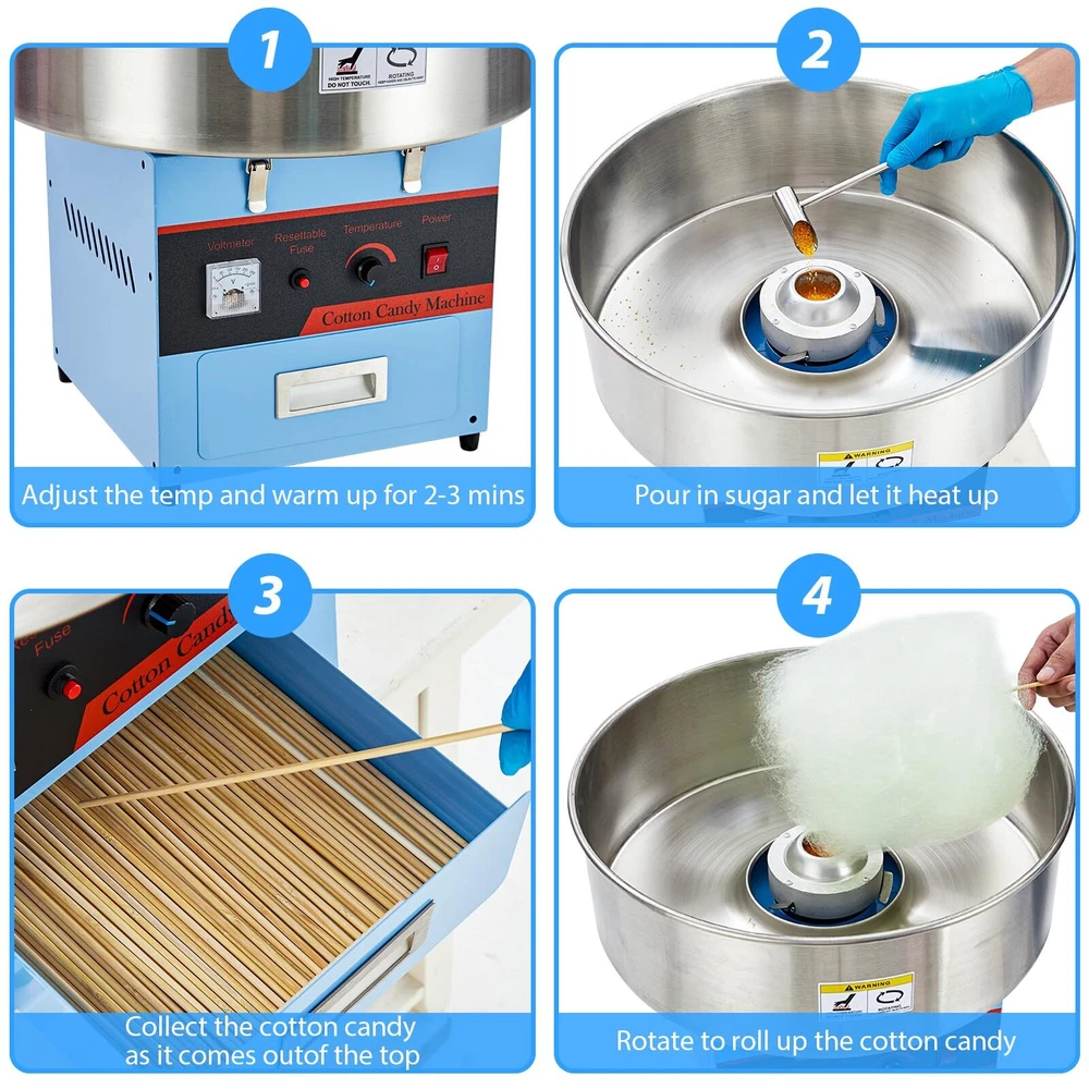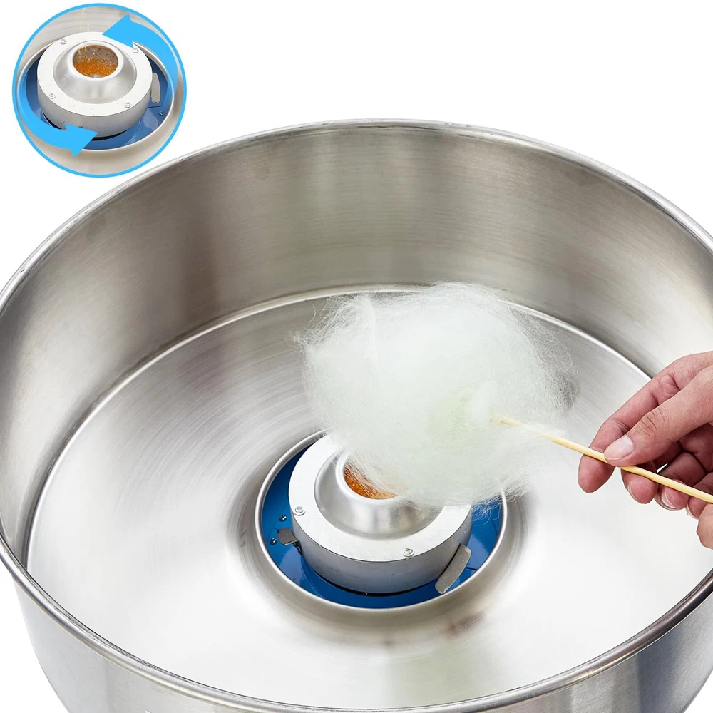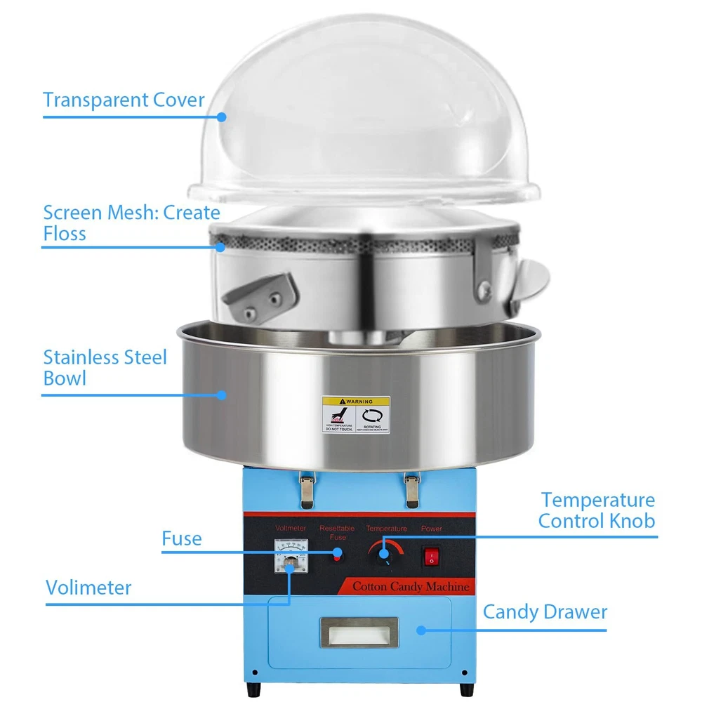 - **Powerful 980W Performance**: Experience superior cotton candy making with the Electric Cotton Candy Machine, boasting a robust 980 watts for quick and efficient production. Perfect for kids' parties and festive events. - **User-Friendly Temperature Control**: Easily adjust the temperature from 245°F to 439°F with a simple knob, ensuring optimal results with every batch. This cotton candy maker machine is designed for both beginners and pros alike. - **Convenient Built-In Storage**: Keep your essentials organized with the integrated steel supply drawer, perfect for storing cotton candy cones, sticks, and floss sugar packs. Everything you need is within arm's reach. - **Easy Cleanup**: The 21-inch stainless steel bowl is easily removable, making post-event cleanup a breeze. Spend more time enjoying and less time cleaning with this efficient candy cotton machine. - **Versatile Ingredient Options**: Whether using traditional flossing sugars or experimenting with milk sugars, fruit cubes, or hard candies, this cotton candy maker accommodates all, offering endless creative possibilities.