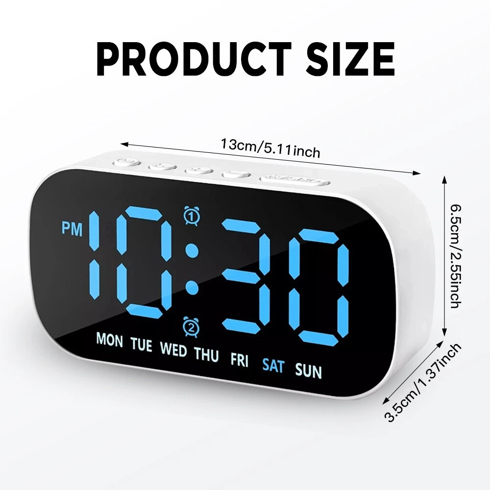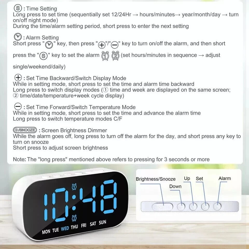 Description: Regular Features: Alarm clocks for bedrooms display time, day of the week, date, temperature (need to press the button to switch), includes 5 minute snooze time loud alarm clock for heavy sleepers adults, 12/24 hour time format, dual alarm, 5 levels of brightness; If there are any areas where you do not know how to operate, please consult us at any time, and we will do our best to solve the problem for you! Adjustable Brightness Alarm Clock: There are 5 levels of brightness for your options (day time); The small digital clock for bedroom will enter into night-mode and dim automatically at 10:00pm~6:00am to protect your eyes at night and save energy, create an peaceful environment for sleep Outlet Powered and Time Memory: This simple digital alarm clock is a plug-in alarm clock that requires an external power source (excluding adapter) to be connected for power supply; 3 AAA backup batteries (not included) for storing time and alarm settings during power outage Dual Alarm Clock and Snooze: Clock for bedroom have three alarm modes to choose from: Mon to Fri, Mon to Sat, or Mon to Sun; When the desk alarm is beeping, simply press any button to pause the alarm to get extra nap, long press the top snooze to stop alarm today, and it will still sound the next day Ideal for Gift and Home Decor: Intuitive and clear marked button, experience zero stress when setting the time or alarm, It’s an ideal gift for families, seniors, teens or friends; Easy to set alarm clock is also great for decorating your room as a desk clock Specifications: Name: Electric Digital Alarm Clock Material: ABS Color: White+Blue Size: 13×6.5×3.5cm/5.11×2.55×1.37inch Display Screen: LED Package include: 1X Digital Alarm Clock