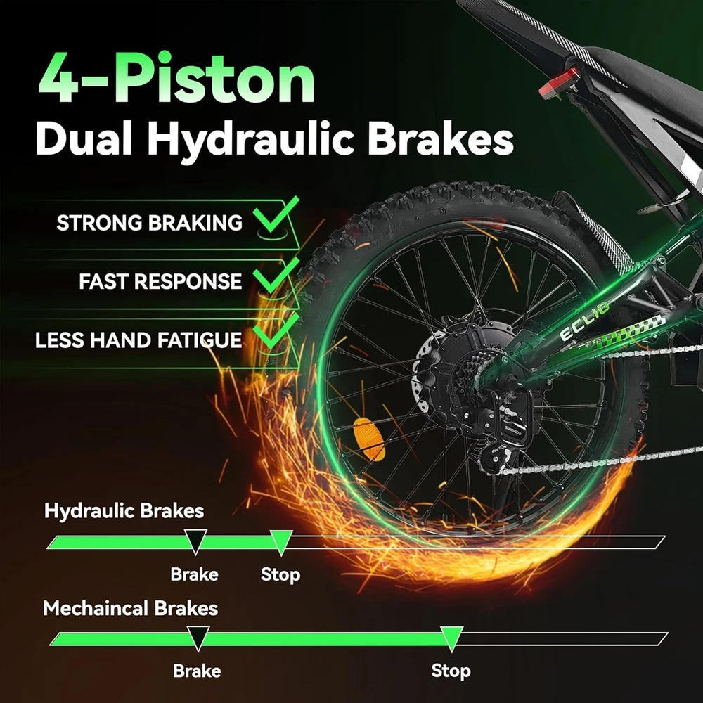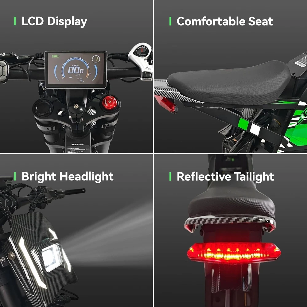 [๐๐ซ๐๐ฆ๐ข๐ฎ๐ฆ ๐๐๐ซ๐๐จ๐ซ๐ฆ๐๐ง๐๐ ๐๐๐๐๐ ๐๐๐๐ค ๐๐จ๐ฐ๐๐ซ] The D01 electric dirt bike is equipped with a peak 4000W brushless motor, unleashing exhilarating power that propels it to a 40mph (64km/h) and tackling 45ยฐ slopes effortlessly. Riding the ebike isn't just cyclingโit's taming a roaring beast, tearing through the wild with wind howling in your wake: fearless, unyielding, utterly unstoppable. ใ๐๐๐ ๐๐๐๐ก ๐๐๐ฆ๐จ๐ฏ๐๐๐ฅ๐ ๐๐๐ญ๐ญ๐๐ซ๐ฒ ๐ฐ๐ข๐ญ๐ก ๐๐๐๐ข๐ฅ๐๐ฌ ๐๐๐ฑ ๐๐๐ง๐ ๐ใPowered by a 48V 32Ah high-capacity removable battery, this electric motorcycle delivers an impressive max range of 70 miles on a single charge (4.5A Fast Charger: 6-8 Hours Full Charge)-enough to handle daily commutes, weekend getaways, or even cross-town adventures without the stress of range anxiety. ใ๐๐ข๐ซ๐ญ ๐๐ข๐ค๐ ๐๐ข๐ซ๐๐ฌ & ๐๐ฒ๐๐ซ๐๐ฎ๐ฅ๐ข๐ ๐๐ซ๐๐ค๐๐ฌใThe electric bike features 70/100-19 knobby fat dirt tires specialized for motocross bikes, delivering exceptional traction and stability on all terrain. The braking system adopts 180mm dual-disc hydraulic brakes with 4-piston calipers, delivering instant, linear braking force even at high speeds or on slippery surfaces, effectively shortening braking distance for maximum safety. ใ๐๐ฅ๐ฅ-๐๐จ๐ฎ๐ง๐ ๐๐ข๐ฌ๐ข๐๐ข๐ฅ๐ข๐ญ๐ฒ & ๐๐ฆ๐๐ซ๐ญ ๐๐ข๐ฌ๐ฉ๐ฅ๐๐ฒ ๐๐ฒ๐ฌ๐ญ๐๐ฆใThe adults electric bicycle features a comprehensive riding support setup for safety and convenience. Intelligent LCD dashboard clearly displays speed, battery level, etc, and supports quick unlocking via NFC card. It also has bright LED front headlights, rear taillights and turn signals to keep you visible in low light or bad weather, keeping you informed and seen whether riding at night or in busy areas. ใ๐๐ซ๐จ๐๐๐ฌ๐ฌ๐ข๐จ๐ง๐๐ฅ-๐๐ซ๐๐๐ ๐๐ฎ๐๐ฅ ๐๐ฎ๐ฌ๐ฉ๐๐ง๐ฌ๐ข๐จ๐งใThe ebike features a dual suspension system paired with a thru-axle front fork, delivering strong rigidity and reliable locking force.It prevents wheel deviation during hard cornering or impacts, ensuring precise tracking and direct control. The dual suspension absorbs shocks from bumps and uneven terrain in real time, bringing you an ultra-smooth and comfortable riding experience on any road condition. ใ๐๐ฎ๐ฉ๐๐ซ๐ข๐จ๐ซ ๐๐-๐ฆ๐จ๐ง๐ญ๐ก ๐๐๐ซ๐ซ๐๐ง๐ญ๐ฒ & ๐๐/๐ ๐๐ง๐ฅ๐ข๐ง๐ ๐๐ฎ๐ฉ๐ฉ๐จ๐ซ๐ญใThe electric dirt bike comes with a 12-month quality support. To ensure smooth after-sales service, please retain the original packaging. Whether you have inquiries about use, need help with issues, or require after-sales guidance, we're 24/7 online to respond promptly, so you can ride with total peace of mind. Package Included: Ebike*1, Battery*1, Charger*1, Installation Tools*1, User Manual*1, NFC Cards*2, Remote Control*2 Note: Our products have been certified under UL2849 safety standards.