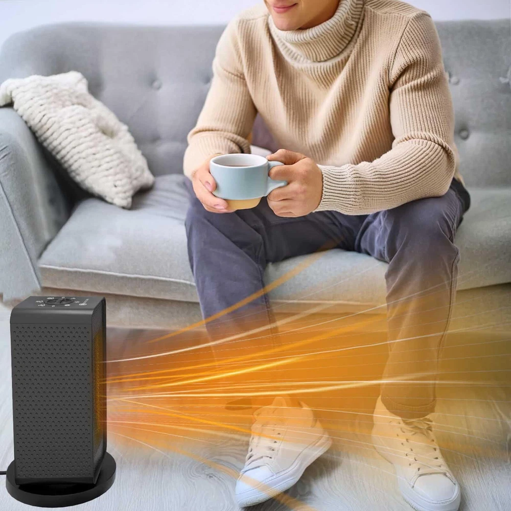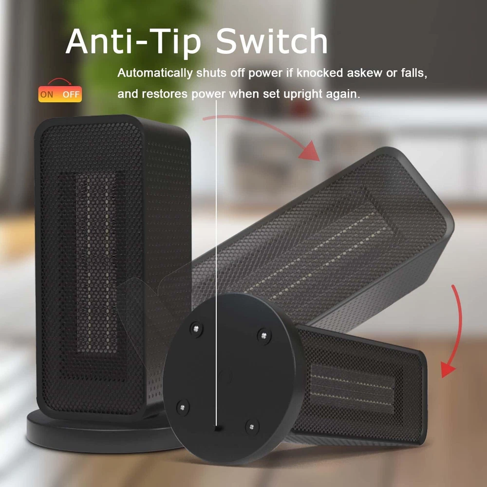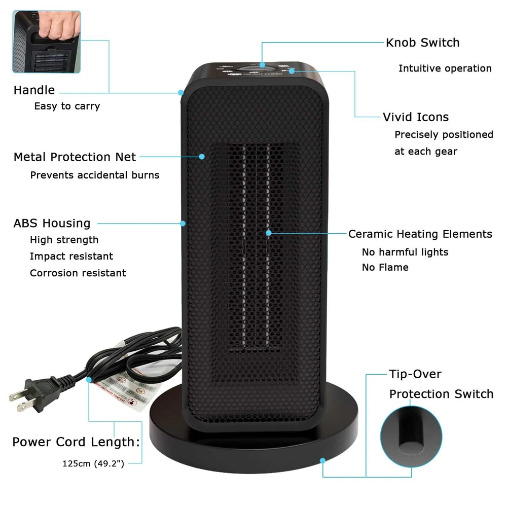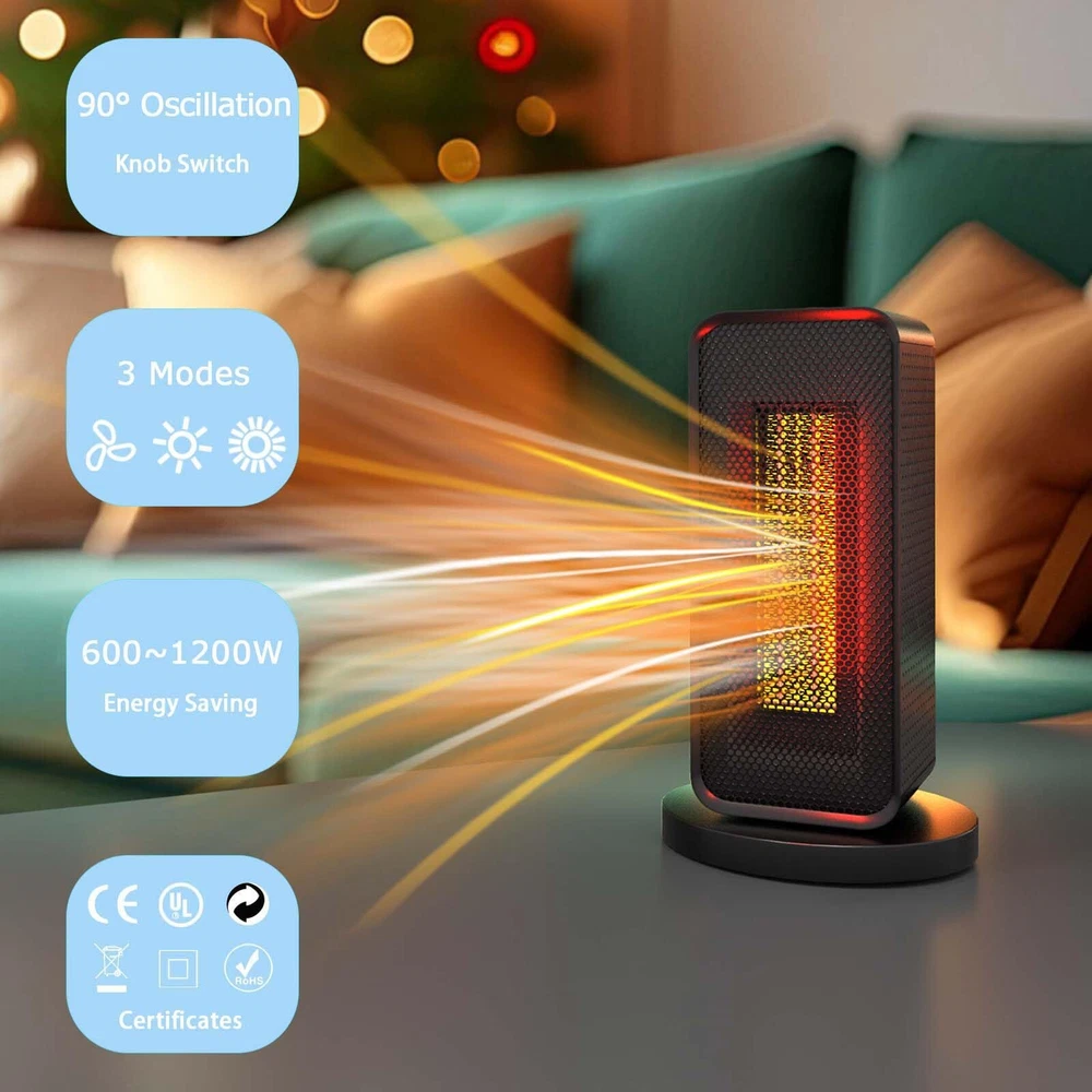 ✅ [3 Heating Modes] Switch the knob to: 1) high-power heating mode (1200w), will instantly heat your chilly space up and make you feel the warmth in max. 3s; 2) economic heating mode (600w), heats gently to keep the warmth and coziness while saving your energy bill; 3) fan-only mode, provides breeze only – perfectly satisfy your requirements for air circulation boost without heat. ✅ [90° Oscillation] Evenly distribute the heat to a wide area of your room. Share the warmth with your family. Feel free to move in your bedroom, living room, dining room, or garage. No constraints caused by uncovered heating corners in the room. Good atmosphere for a small party. ✅ [Anti-Tip & Overheat-Proof] UL & RoHS certified. The integrated tip-over switch immediately cuts power off if the heater is knocked askew, preventing potential fire hazards. Overheat protection diligently monitors internal temperatures to prevent circuit damage or overloading, which frees your worries about unattended energy consumption or dangerous situations. ✅ [Energy Saving] Wattage: 600W / 1200W. Will not overload the circuit. Perfect for small spaces up to 60㎡ (646ft²) (ideal heating effect for: 20㎡, namely, 216 ft²). With a built-in precise temperature sensor, it can quickly heat your office cube or bedroom while consuming 20% less energy than traditional heaters, bringing cozy warmth to those living in mild climates. ✅ [Hands-on Control & Compact] The top-mounted knob switch, accompanied by vivid icons precisely positioned at each gear, enables straightforward, pure mechanical, and accurate operations. More durable and reliable. Intuitive to users of all ages. Space saving design with dimensions – Height: 28.5cm (11.22”), Width: 16cm (6.3”), Depth: 16cm (6.3”).